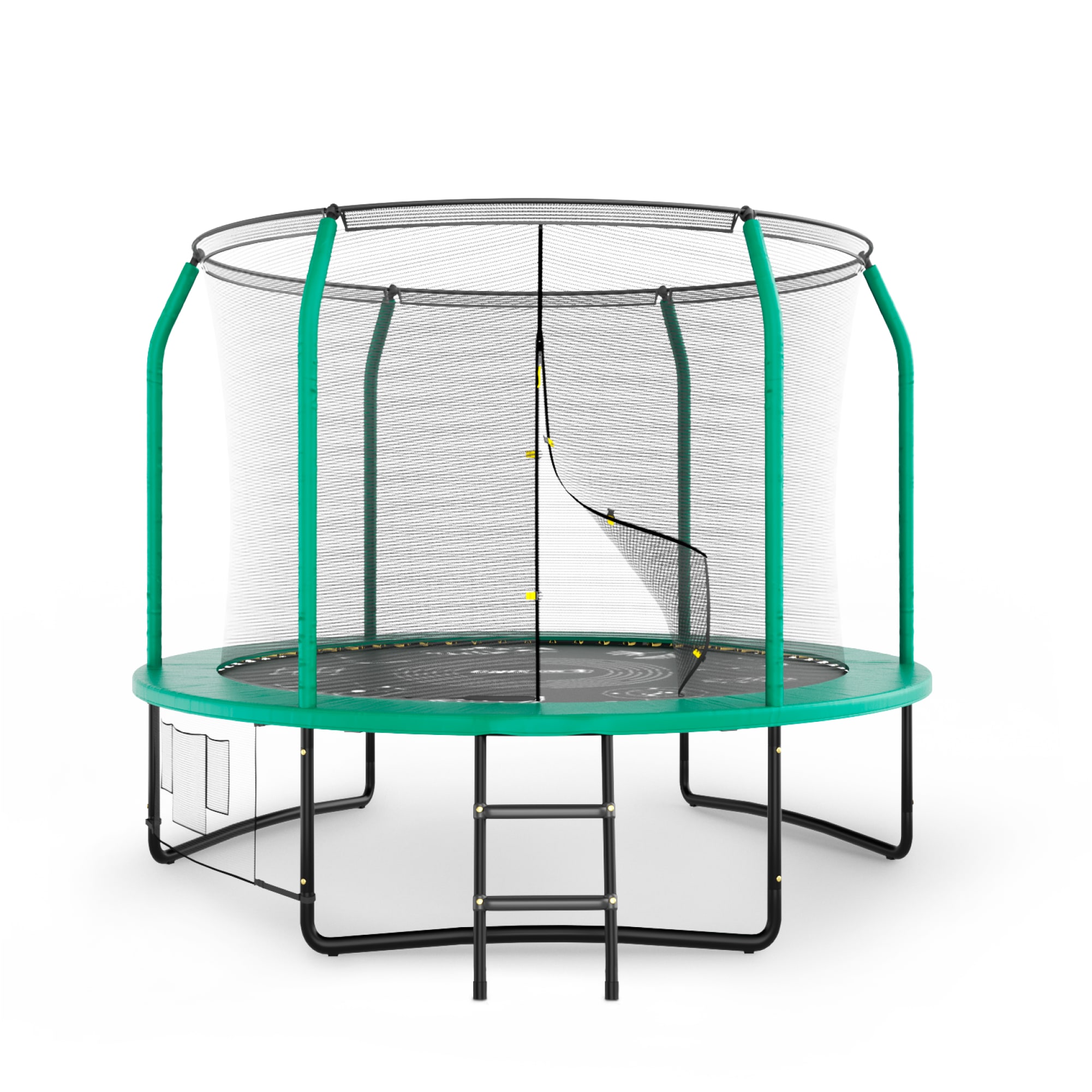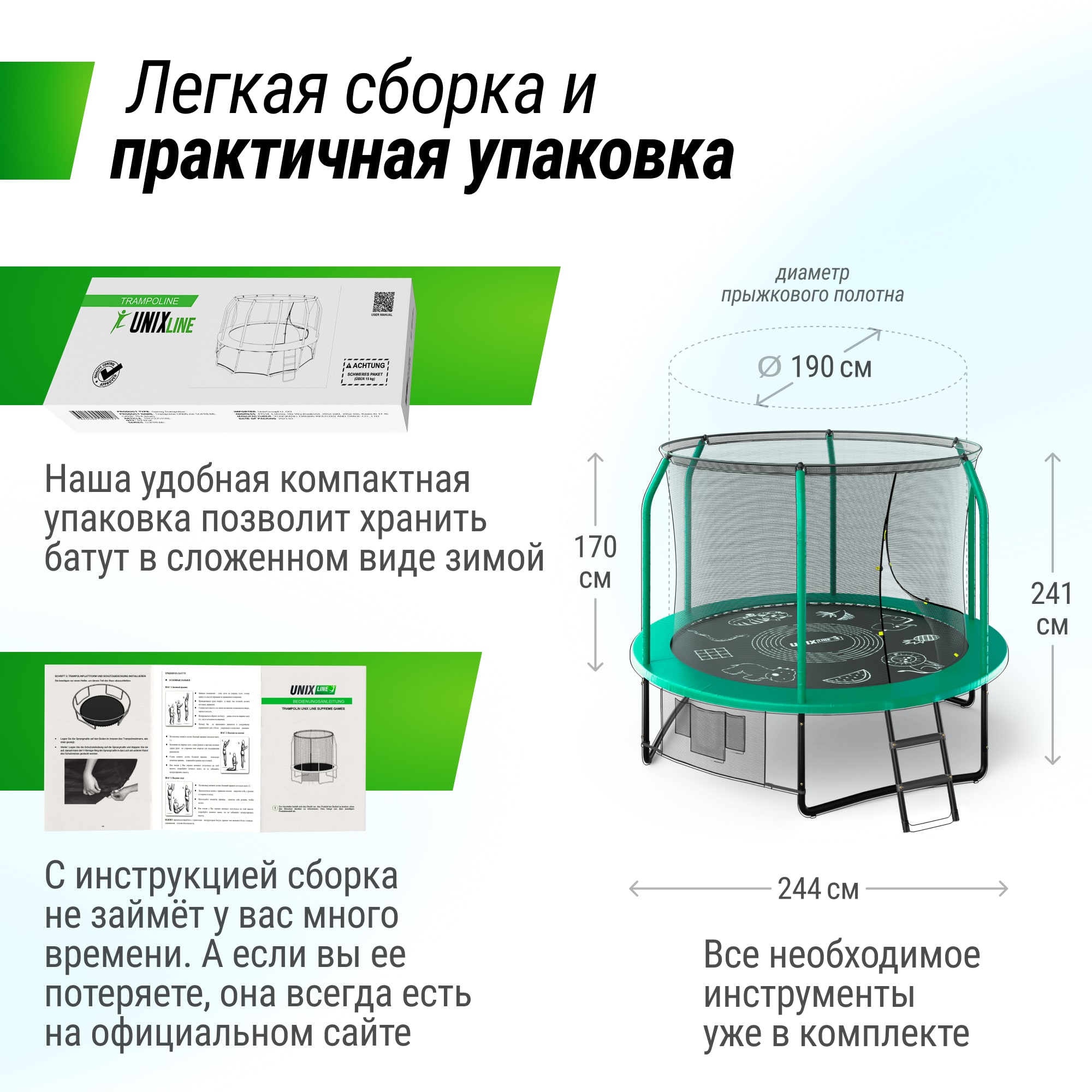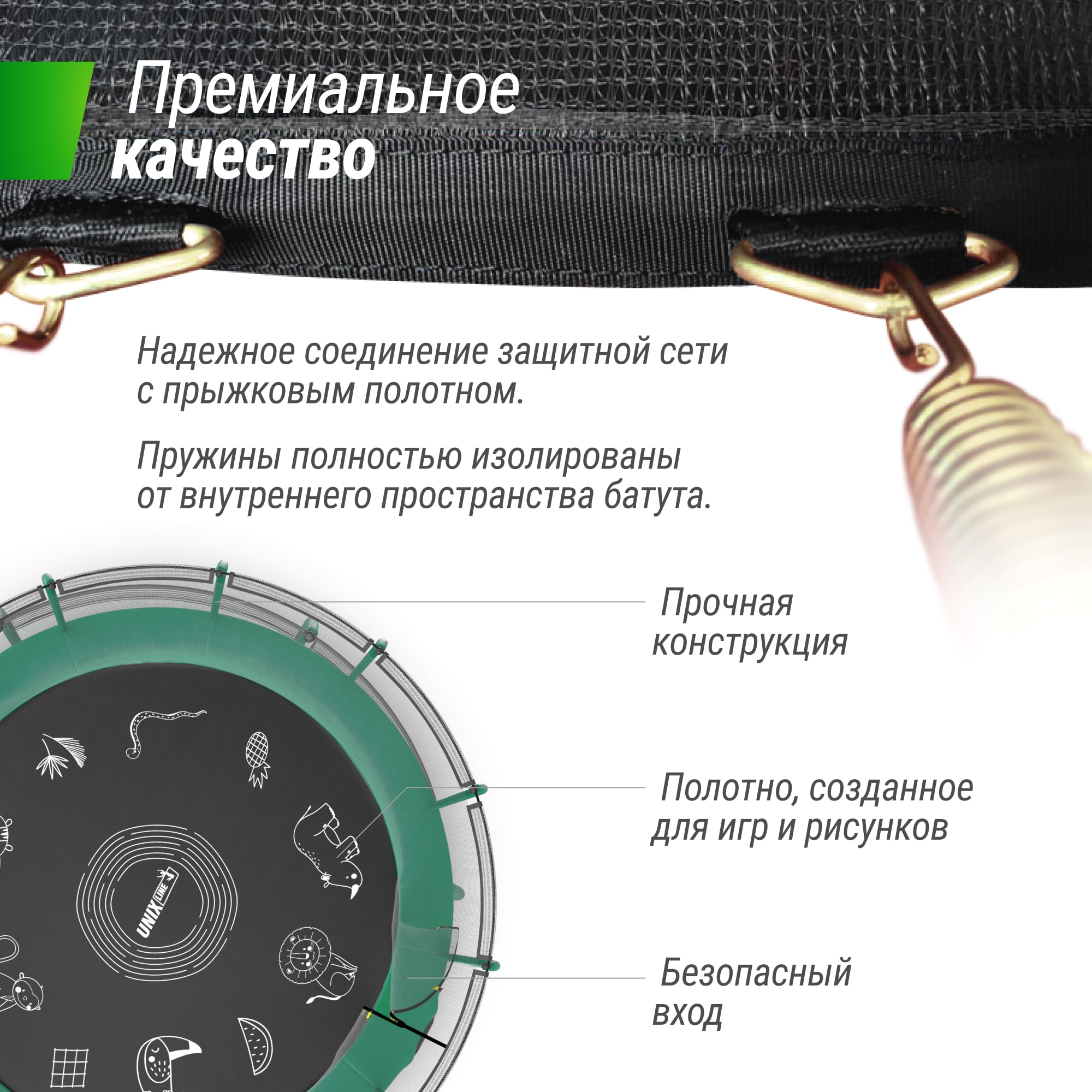 Помимо верхней защитной сетки, все батуты премиального модельного ряда UNIX line оборудованы нижней защитной сеткой, которая препятствует проникновению под прыжковое полотно батута детей, животных, а также попаданию посторонних предметов, и лестницей для удобства пользования. Так же в комплект входят специальные крепления батута к земле (колышки).