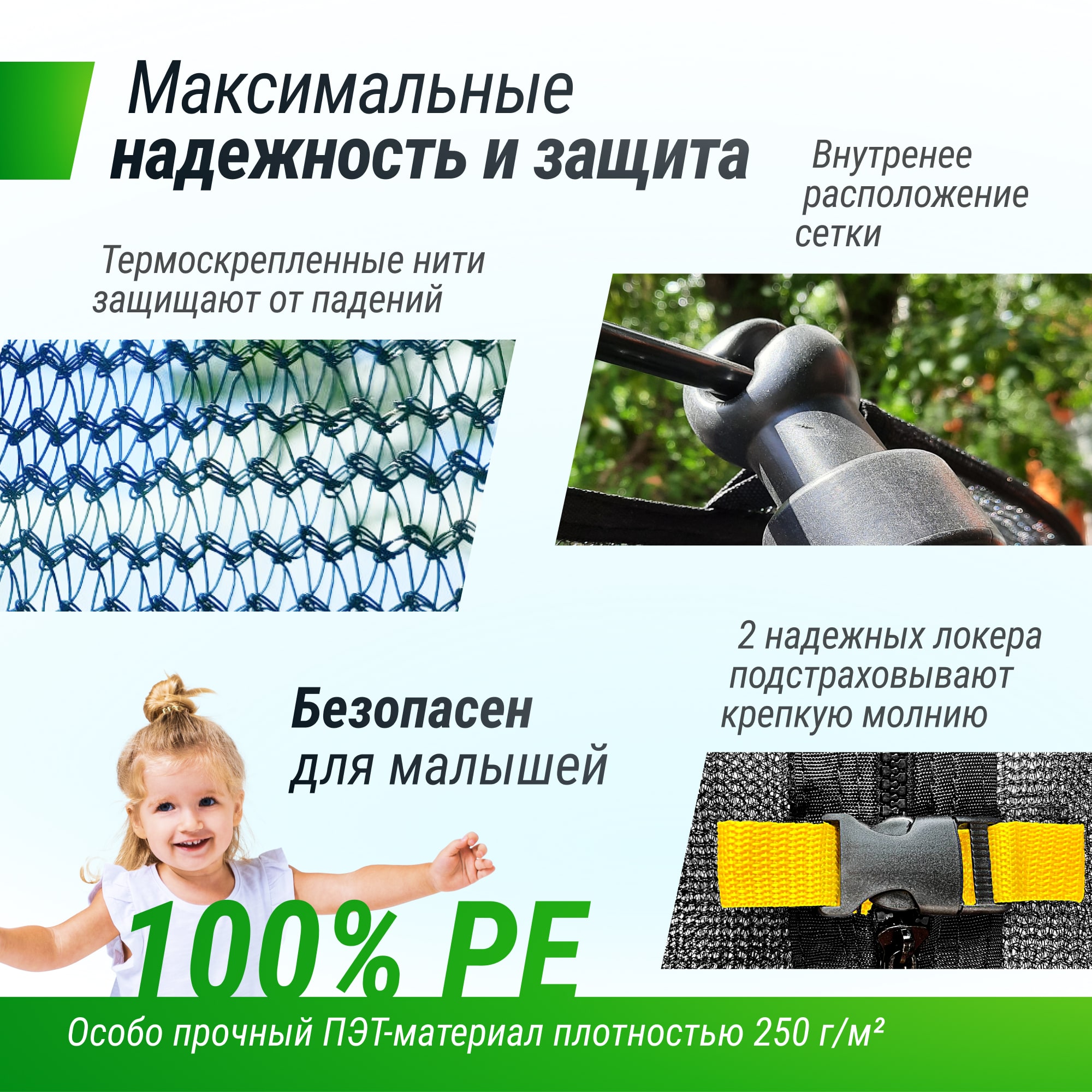 Защитный мат для пружин, расположенный по периметру батута, состоит из четырех слоев, обшитых ПВХ материалом, плотностью 150 г/см3 и надежно закрывает пружины.