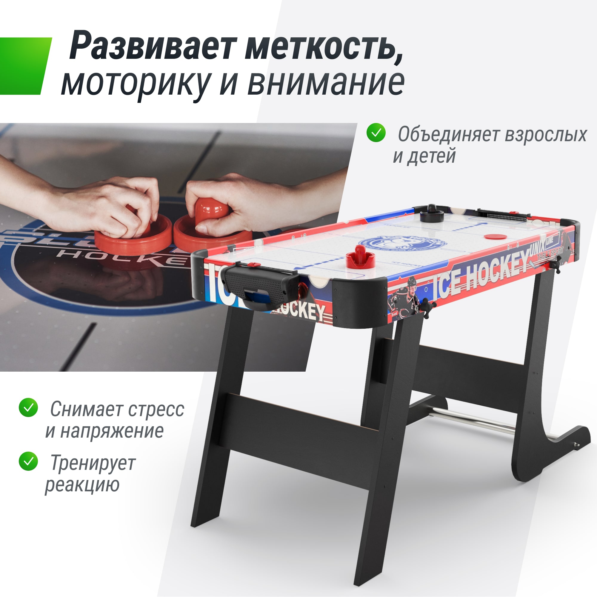Игровой стол складной UNIX Line Аэрохоккей 105х50 cм - это захватывающая и энергичная игра, который станет отличным развлечением для всей семьи и друзей!