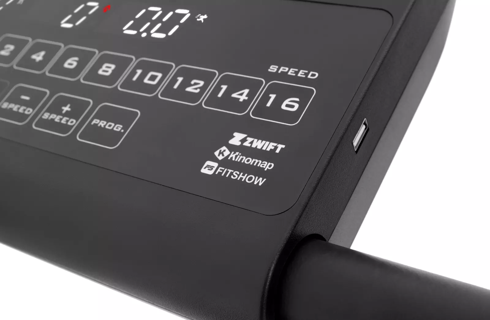 Программная часть тренировочного компьютера состоит из 24 предустановленных тренировочных профилей, направленных на снижение веса, сжигание жира, развитие выносливости, выполнение интервальных тренировок, кардио и т.д. 3 программы обратного отсчета работают по принципу достижения одного из целевых показателей времени, дистанции или калорий. 5 пользовательских программ дают возможность создать и в дальнейшем использовать собственные тренировочные профили. Пульс можно контролировать с помощью одной из трех пульсозависимых программ – для получения точных значений в консоль встроен беспроводной приемник пульса Bluetooth™ Wireless (для работы требуется ремень-передатчик, приобретается отдельно). Жироанализатор Body Fat покажет уровень жира в организме.