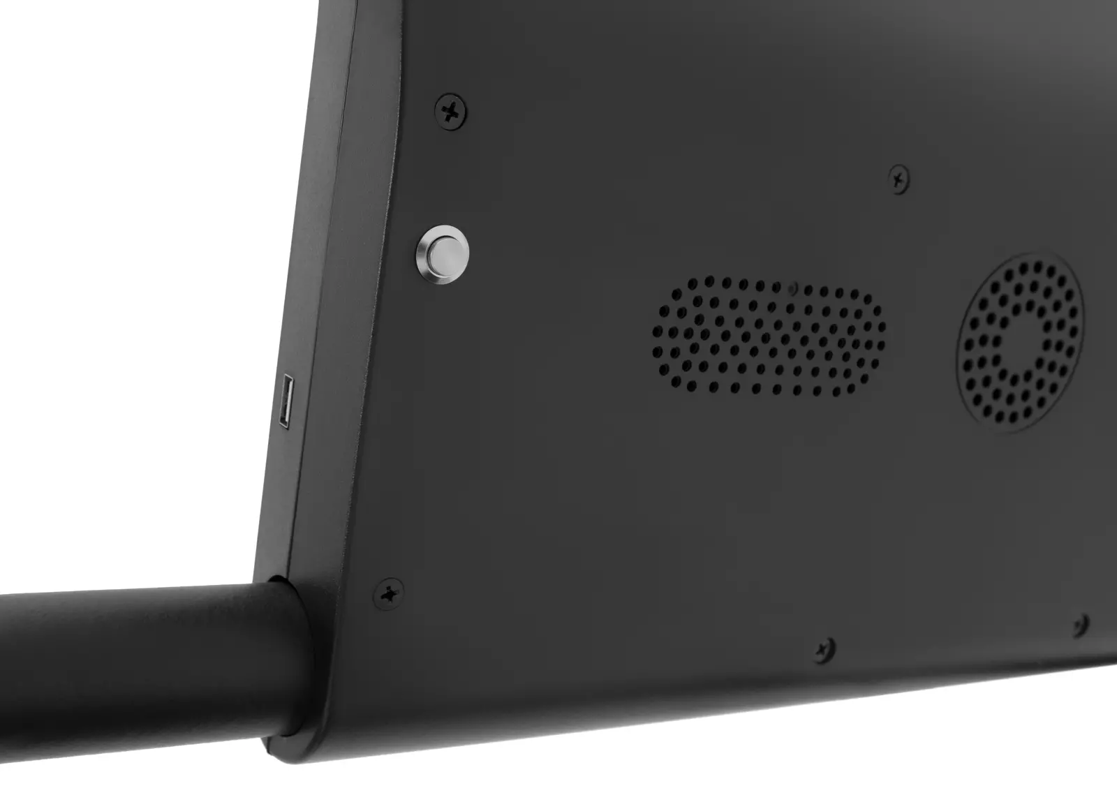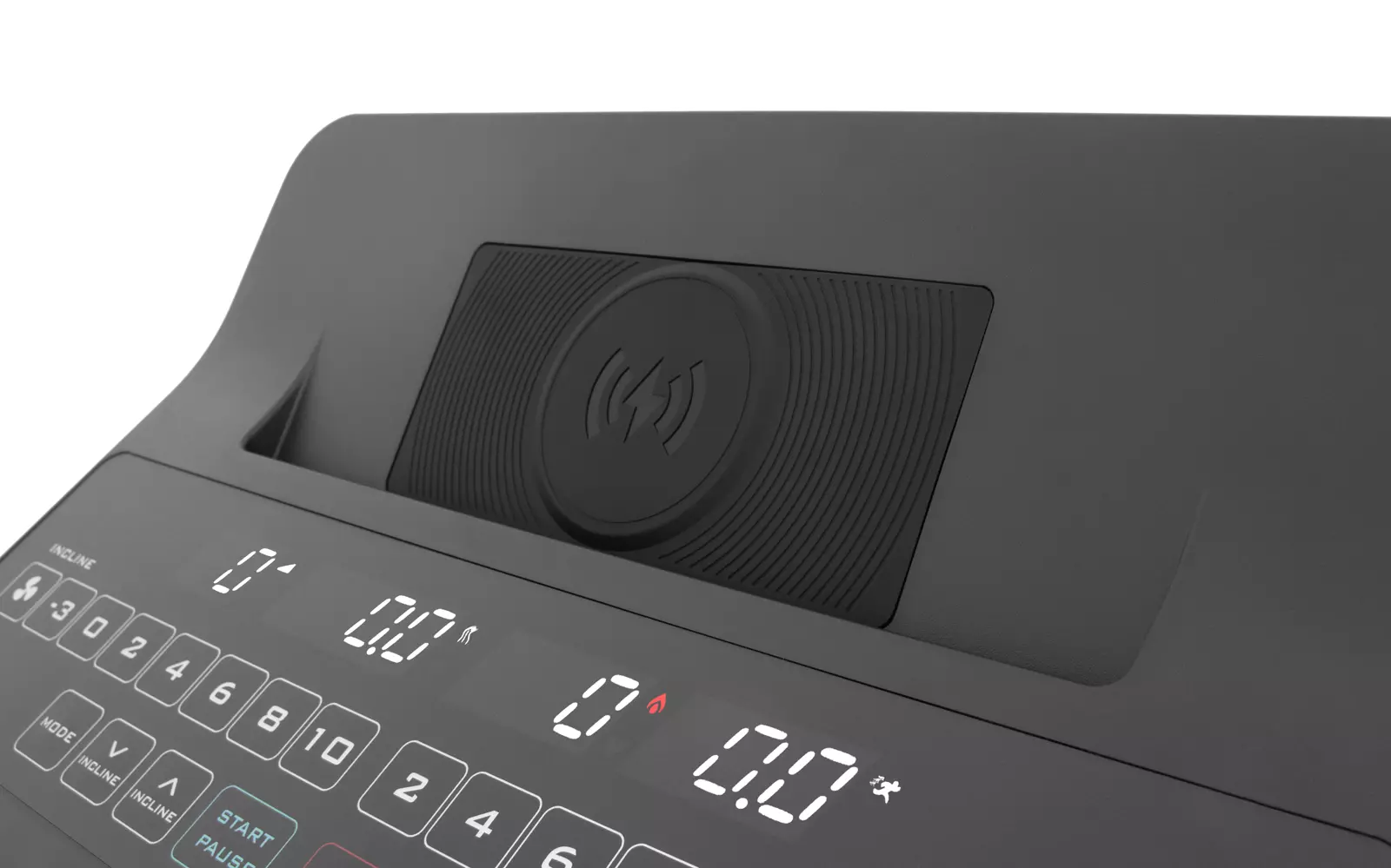 Консоль Aura Labs™ Stellaris представлена тренировочным компьютером с 4-х оконным LED дисплеем. На экран выводятся такие параметры как скорость, дистанция, расстояние, сожжённые калории, угол наклона и пульс. Максимально продумано использование телефона или планшета. В обличии от большинства дорожек, подставка под мобильные устройства выведена в верхнюю часть консоли и не перекрывает LED дисплей и клавиши управления. Зарядка мобильных устройств представлена сразу двумя вариантами – посредством USB или беспроводным способом. В мягкие прорезиненные поручни встроены клавиши быстрого изменения скорости и угла наклона, а также сенсорные датчики пульса. В Aura Labs™ Stellaris присутствуют встроенные динамики, звук на которые можно вывести со своего мобильного устройства через Bluetooth™ соединение.