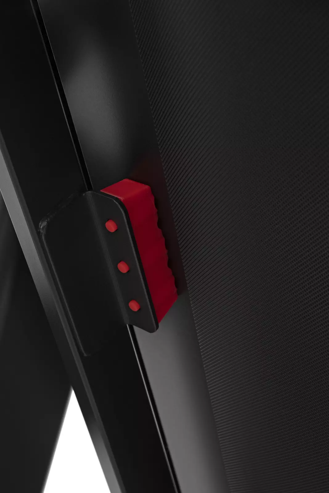 Уникальной и по-настоящему премиальной функцией Aura Labs™ Stellaris является технология автоматического складывания и раскладывания easy-Lift™. Все классические беговые дорожки достаточно легко раскладываются за счет газового доводчика. Но что насчет складывания? Дека беговой дорожки среднего уровня весит от 20 до 40 кг, для тяжелых дорожек до 60 кг и выше. И если для мужчины складывание дорожки обычно не представляет особой проблемы, то для женщин и людей пожилого возраста это сложно, а иногда и просто невозможно физически. Поэтому инженеры Dynamatica создали уникальную, присутствующую только в продуктах Aura Labs™, технологию автоматического складывания и раскладывания easy-Lift™. Теперь не надо руками раскладывать и, самое главное, складывать обратно беговую дорожку. Это можно сделать с помощью одного нажатия кнопки – в прямом смысле этого слова. Одно нажатие на раскладывание, одно на складывание. Технология также максимального продумана с точки зрения безопасности – в дорожку встроены датчики присутствия. Если при складывании или раскладывании рядом с тренажером окажется человек или животное, движение деки остановится и тренажер предупредит об опасности характерным звуковым сигналом. Автоматическое складывание оправдано еще и в том смысле, что дорожка хорошо продумана в плане компактности и занимает в сложенном виде менее 1-ого квадратного метра (98*83 см).