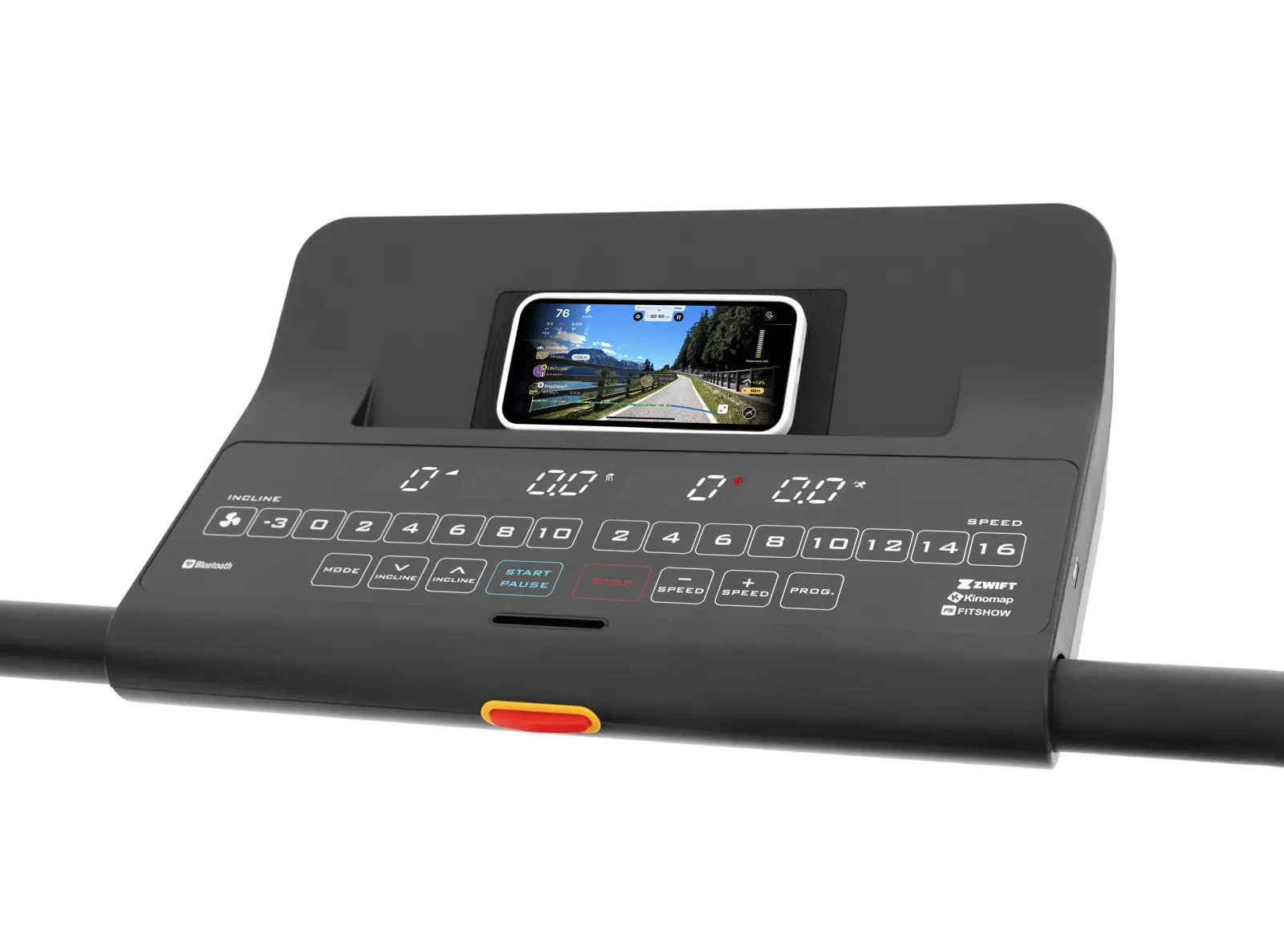 Дорожка интегрируется со сторонними мобильными приложениями. Первое приложение Fitshow – русифицированное мобильное приложение с широким программным функционалом. К возможностям приложения относится: более 100 программных профилей и полноценных тренировочных комплексов, возможность создания собственного программного профиля, развернутая статистика тренировок, более 30 видео профилей (аналог технологии Kinomap), более 60 3D профилей (аналог технологии Zwift), маршруты на основе Google Maps, подсчет калорий и синхронизация со Strava. В приложении Kinomap собрано более 40 тысяч реальных видео трасс со всего мира. Можно найти и пробежаться почти по всем известным мировым локациям – от оживленного Центрального парка Нью-Йорка и ночного дождливого Киото до альпийских троп и Великой Китайской Стены. ZWIFT – многопользовательский 3D онлайн симулятор велосипеда или бега. Это действительно классное приложение с невероятным уровнем визуализации и погружения. Участвуйте в виртуальных тренировках вместе с другими пользователями, достигайте результатов и займите свое место в общемировых рейтингах.