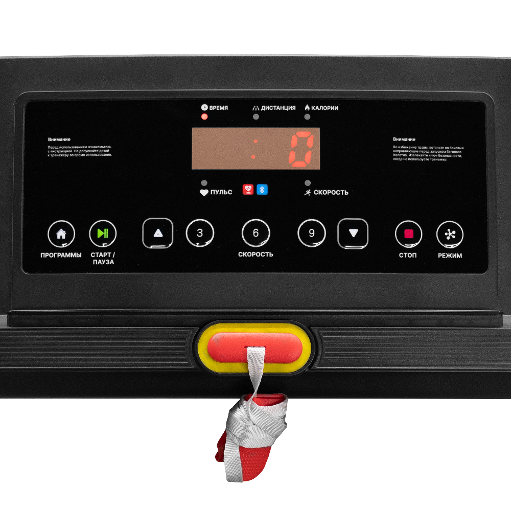 LED-дисплей консоли с понятным интерфейсом на английском языке отображает основные параметры тренировки: время, скорость, дистанцию, количество потраченных калорий и пульс.
