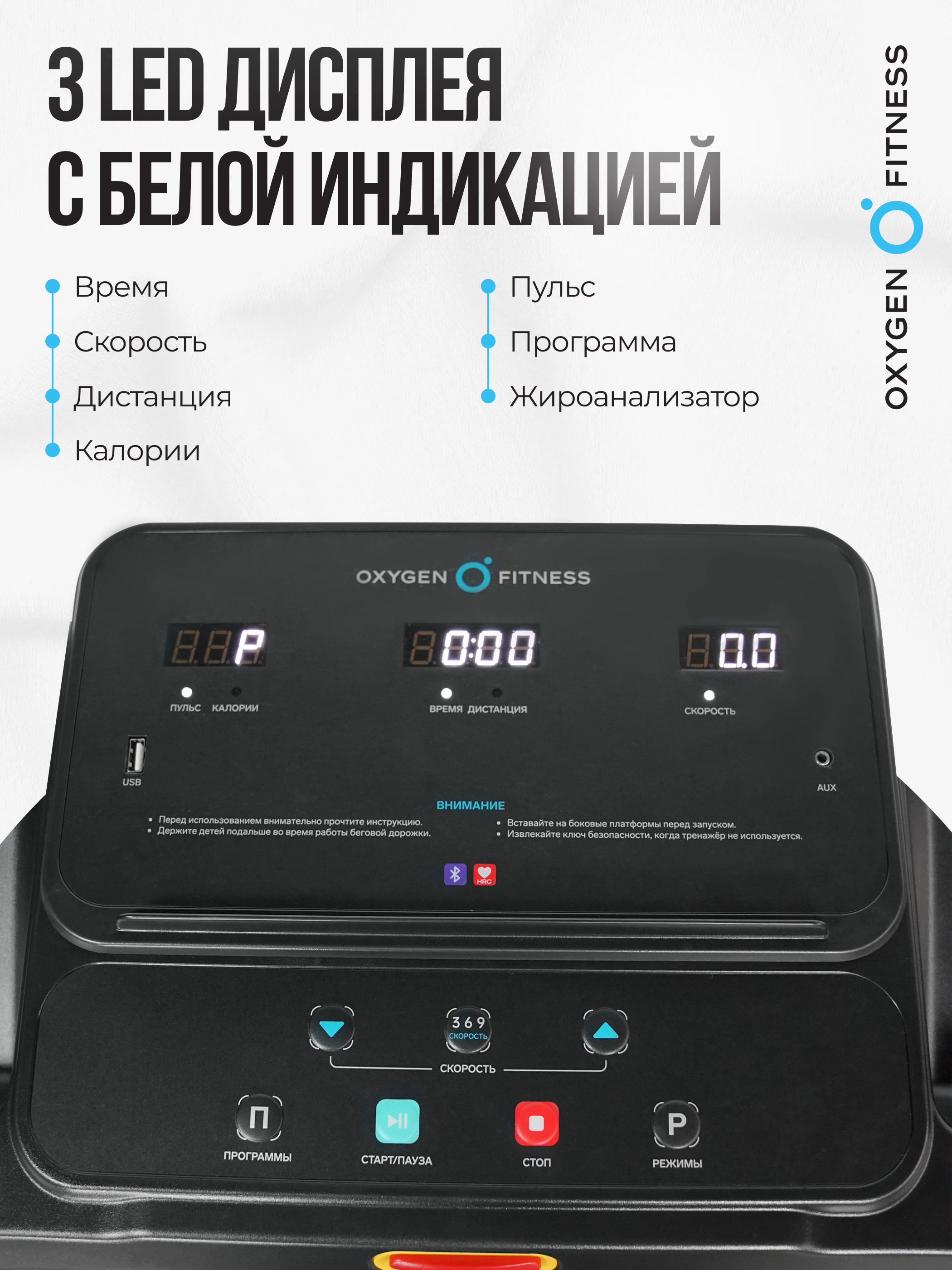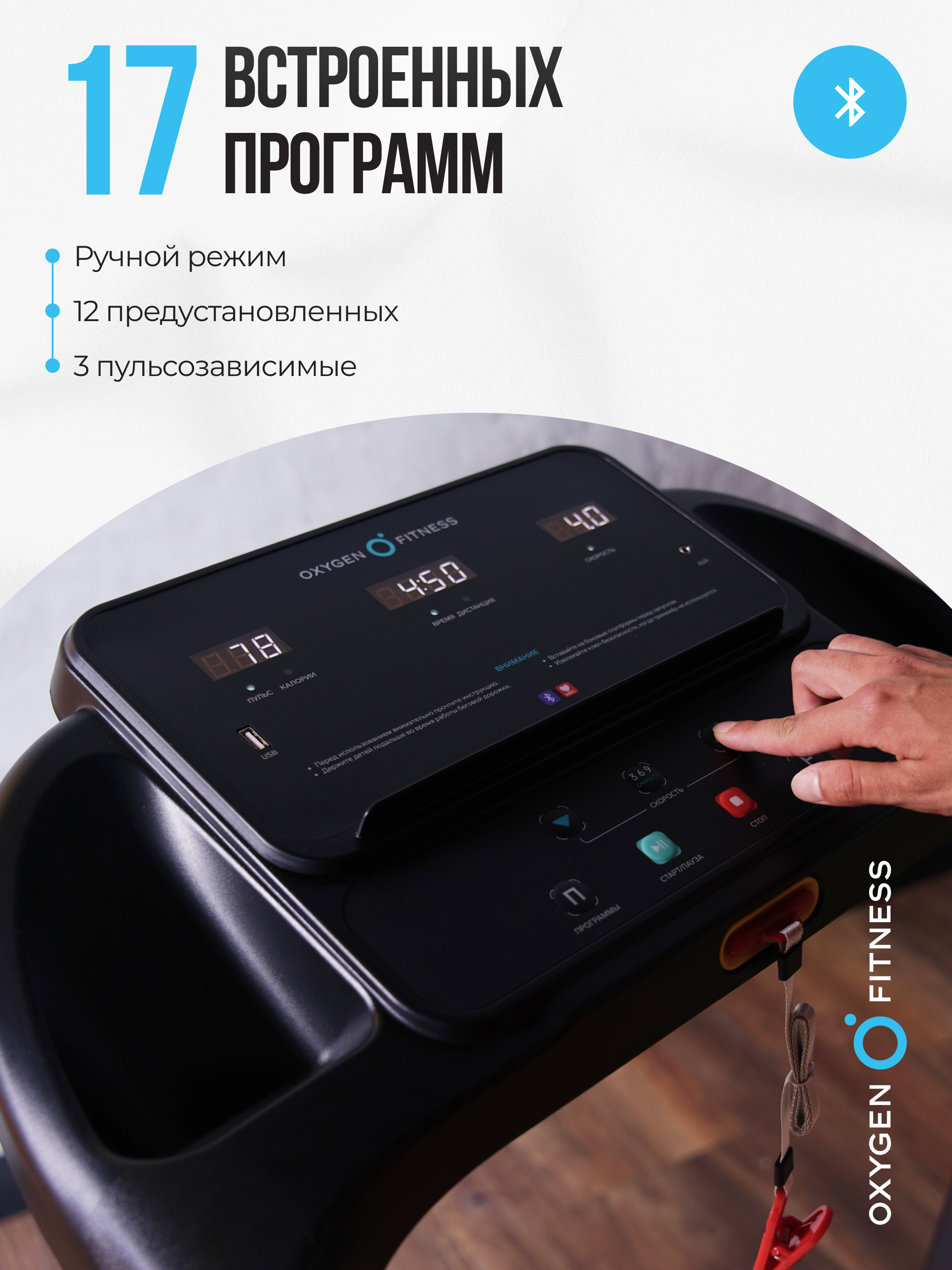 Консоль OXYGEN FITNESS NIOBI оборудована тремя LED-дисплеями с белой индикацией, на которых отображаются важные параметры: время, скорость, дистанция, калории, пульс и программы. Дорожка предлагает 17 различных программ, включая ручной режим, 12 предустановленных и 3 пульсозависимые, что позволяет каждому подобрать оптимальный вариант для тренировок. Интуитивно понятный интерфейс на русском и английском языках делает использование тренажера простым и удобным.