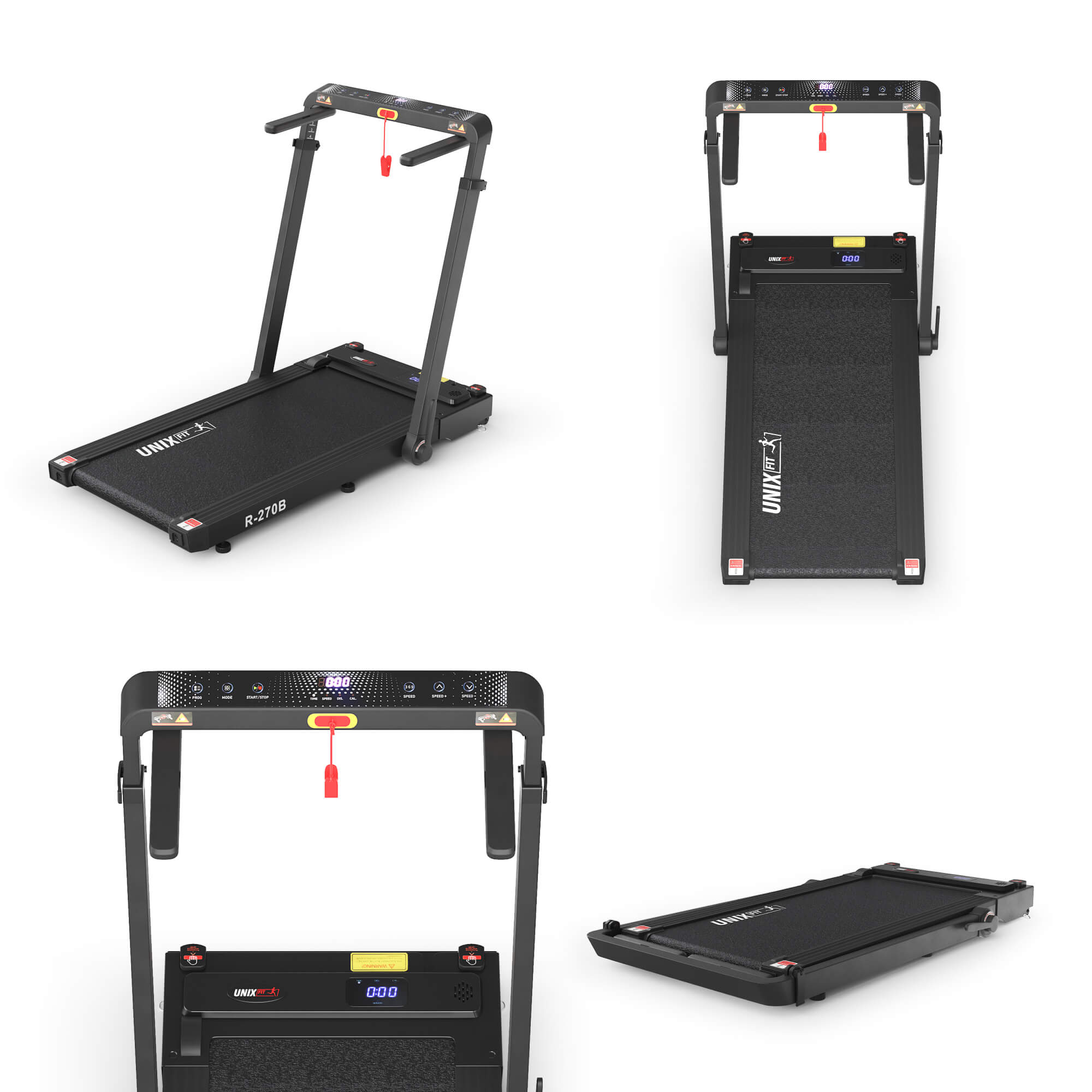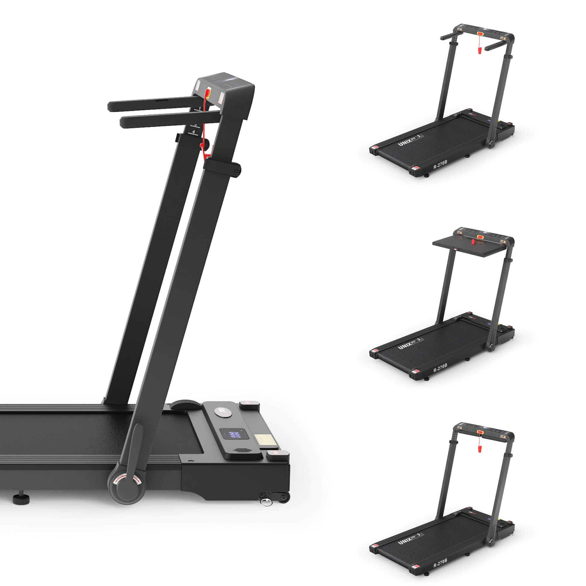 Пульт ДУ - часы, индивидуальная подстройка по высоте стойки от 85 до 97 см (4 уровня), складная подставка под гаджеты, съёмный столик для ноутбука до 20″ до 5 кг, ключ безопасности, защита от перегрузки, встроенный динамик, кнопка быстрого выбора скорости, кнопки: старт/стоп, выбор программ, регулировка высоты стола от 85 до 97 см (4 уровня)