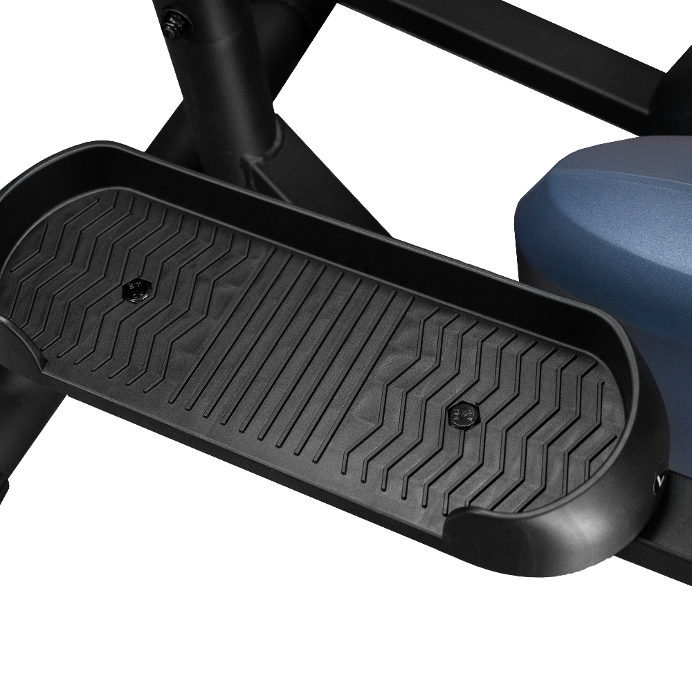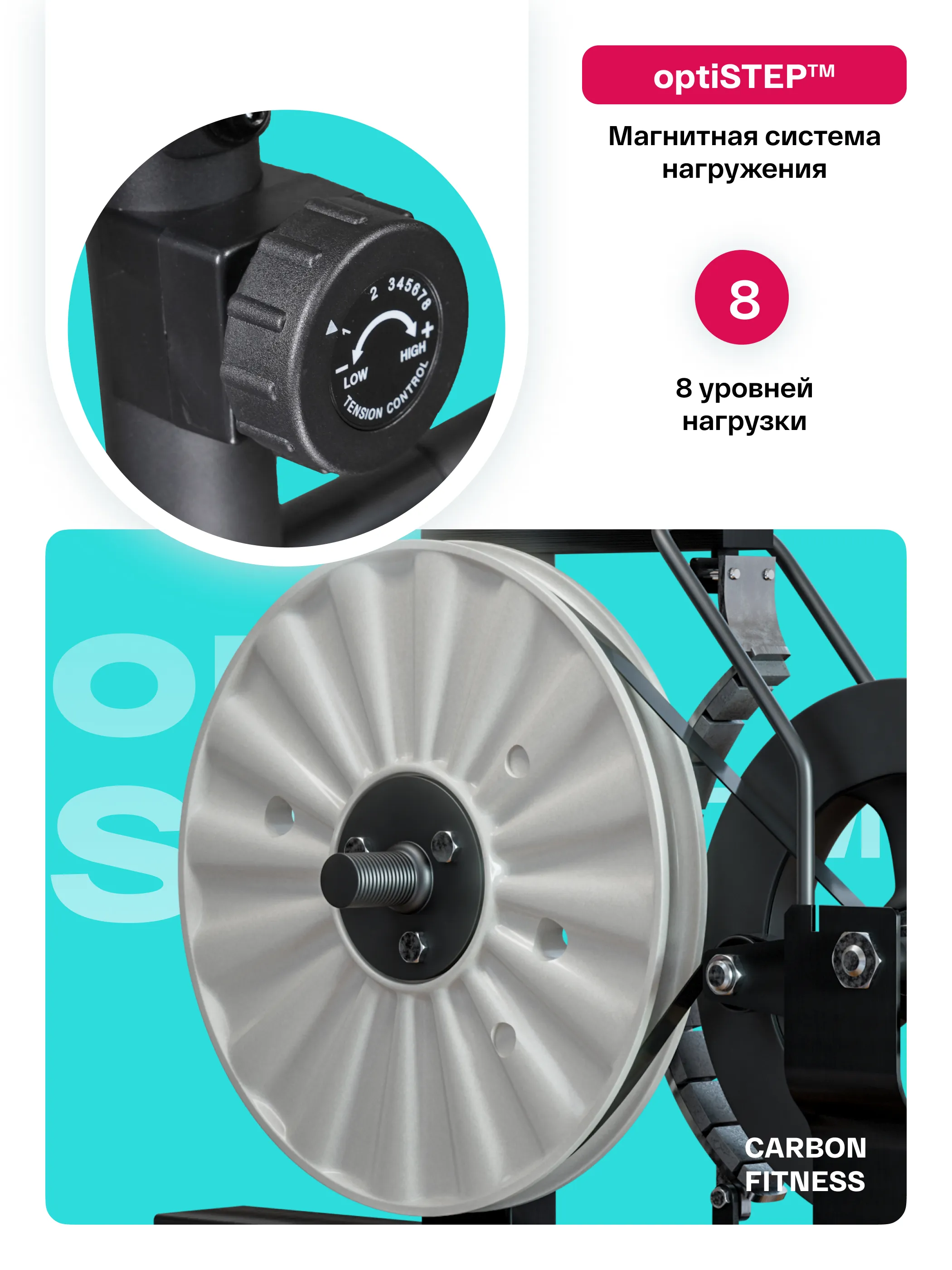 Магнитная система нагружения с инерционным весом маховика 15 кг гарантирует плавный и тихий ход во время занятий. Тренажер разработан с учетом анатомических особенностей пользователей: расстояние между педалями составляет 22 мм, а длина шага — 340 мм, что обеспечивает естественное движение и минимизирует нагрузку на суставы. Удобные изогнутые подвижные поручни с мягкой оплеткой и неподвижные поручни с датчиками пульса добавляют комфорта во время тренировки.