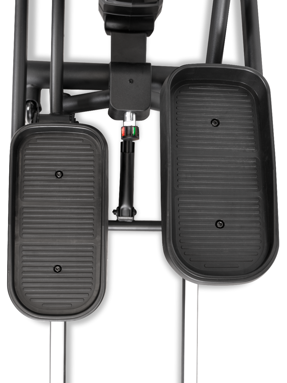 Расстояние между педалями 80 мм способствует устойчивому положению ног, а трёхкомпонентный шатун повышает надёжность педального узла и срок службы тренажёра. Двухпозиционные нескользящие рукоятки с сенсорными датчиками пульса позволяют задействовать мышцы верхней части тела и контролировать частоту сердечных сокращений во время занятий.