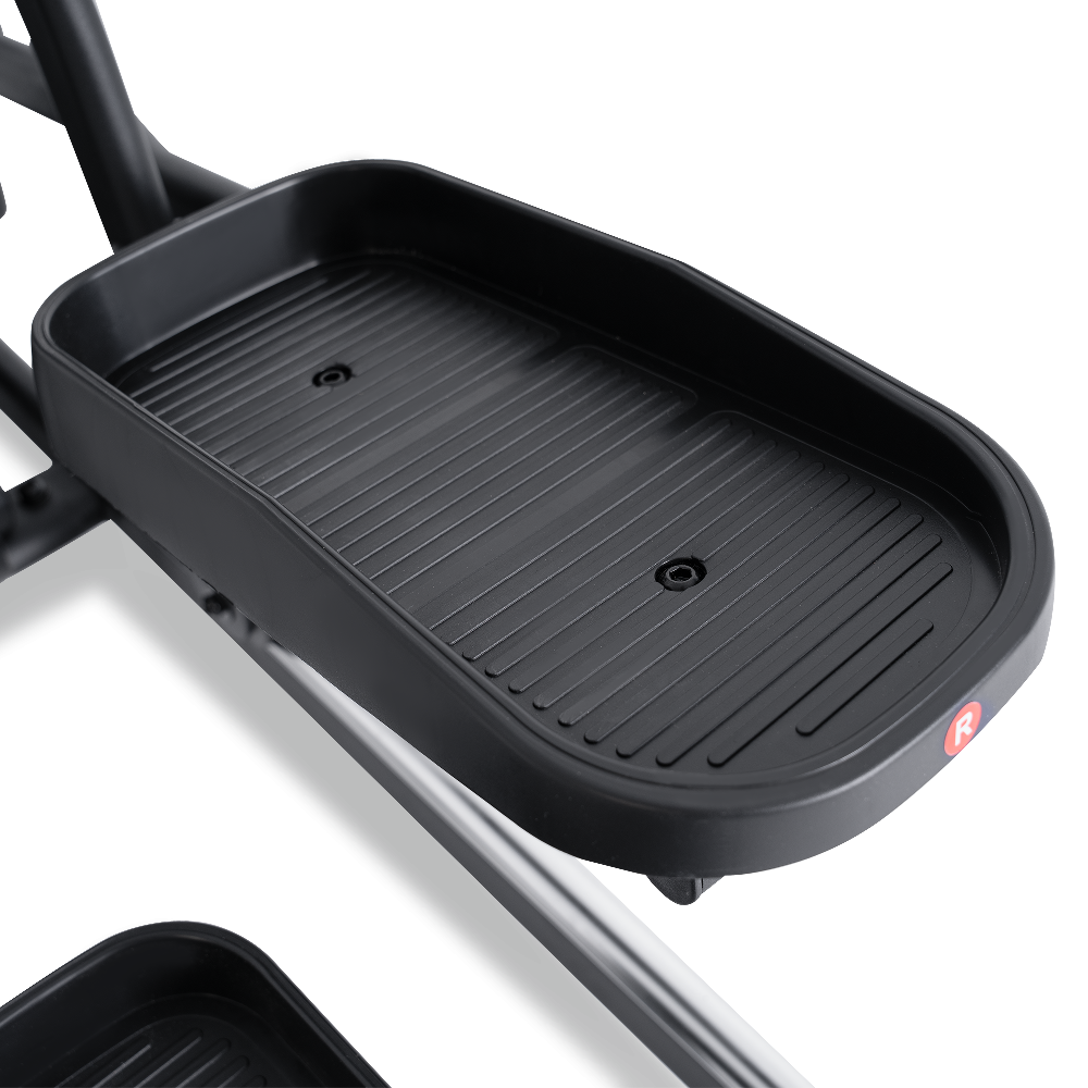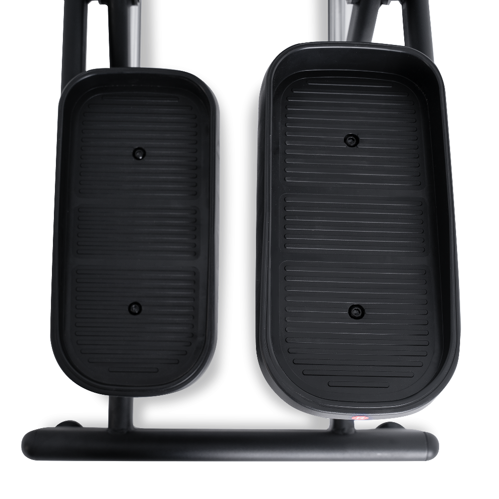 Тренажер предлагает инерционный вес маховика в 24 кг, что обеспечивает плавный и комфортный ход. Расстояние между педалями составляет всего 30 мм, что способствует естественному движению во время тренировки. Длина шага в 500 мм и антискользящие педали увеличенного размера гарантируют безопасные и эффективные занятия.