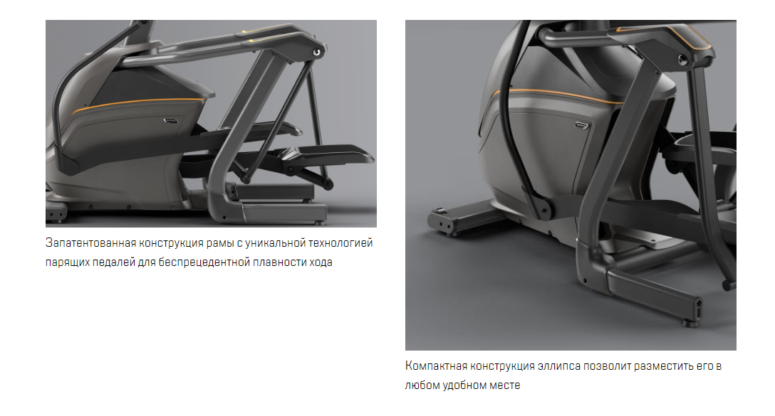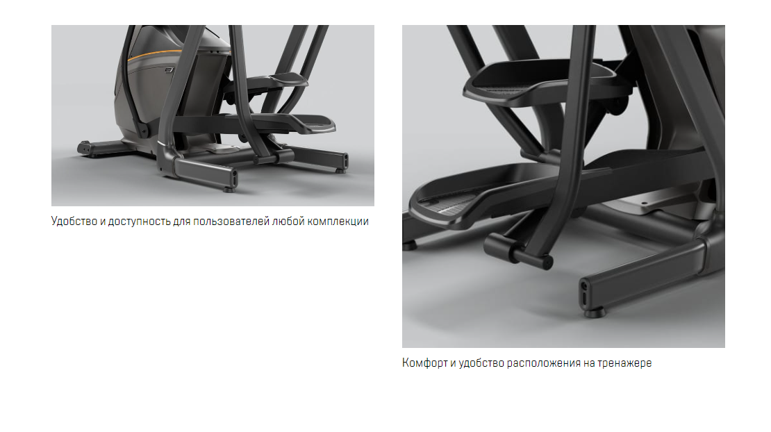 Запатентованная конструкция подвески минимизирует шум и трение, продлевая срок службы тренажера. Благодаря продуманной эргономике тренажер повторяет форму и естественные движения тела для комфортных, щадящих кардиотренировок, а умные опции для дополнительного удобства оптимизируют его использование как для посетителей, так и для самих тренажерных залов.