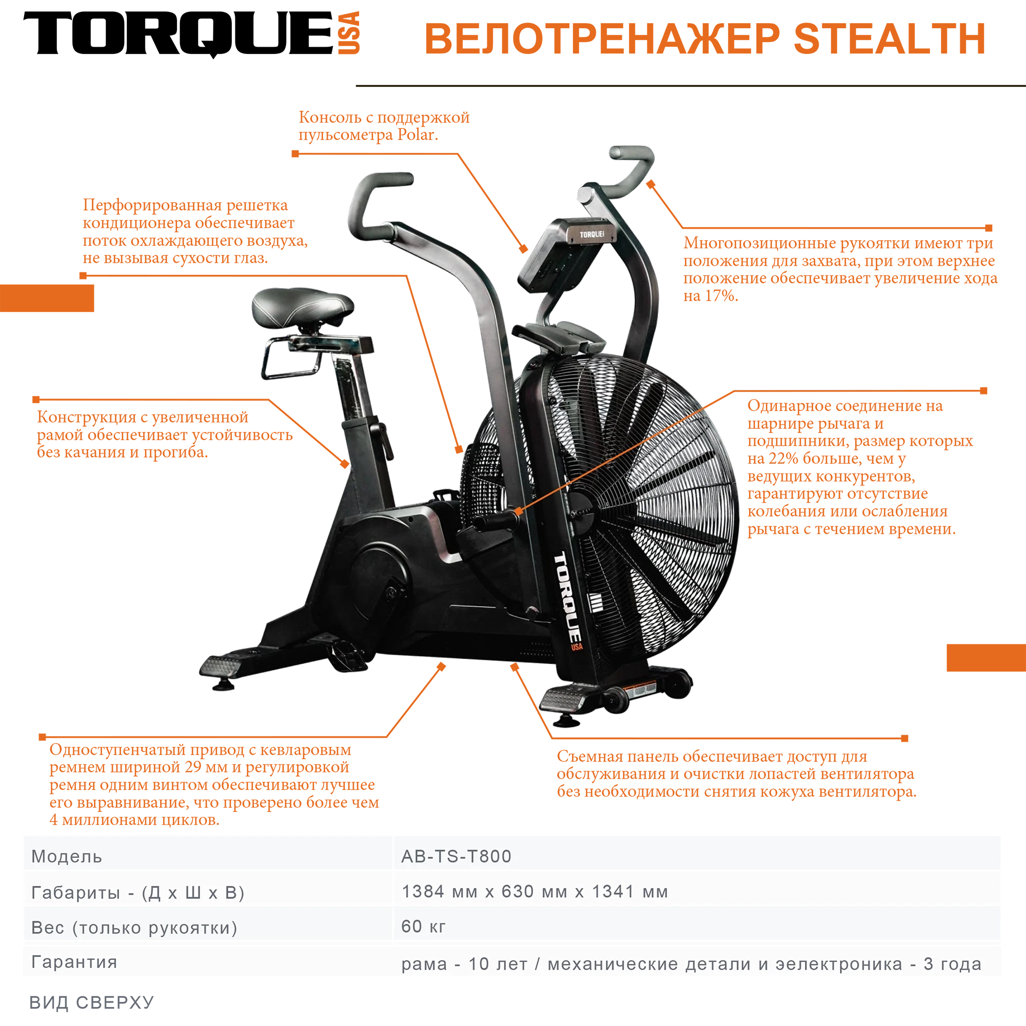 Компания Torque разработала велотренажер Stealth Air Bike AB-TS-T800-INTL-102-F07, который выдержит интенсивное использование и обеспечит плавный и тихий ход: увеличенная трубчатая рама, ось из закаленной легированной стали, одноступенчатый кевларовый ремень и др.