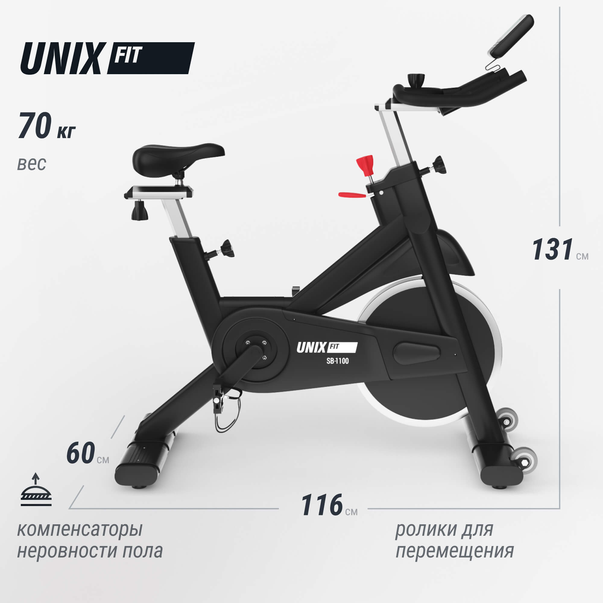 Спин байк UNIX Fit SB-1100 профессиональный / PRO разработан специально для интенсивных тренировок дома и в спортивных залах. Отличительной особенностью велотренажера является высокая прочность конструкции, позволяющая выдерживать нагрузку до 180 кг и рост пользователей до 200 см