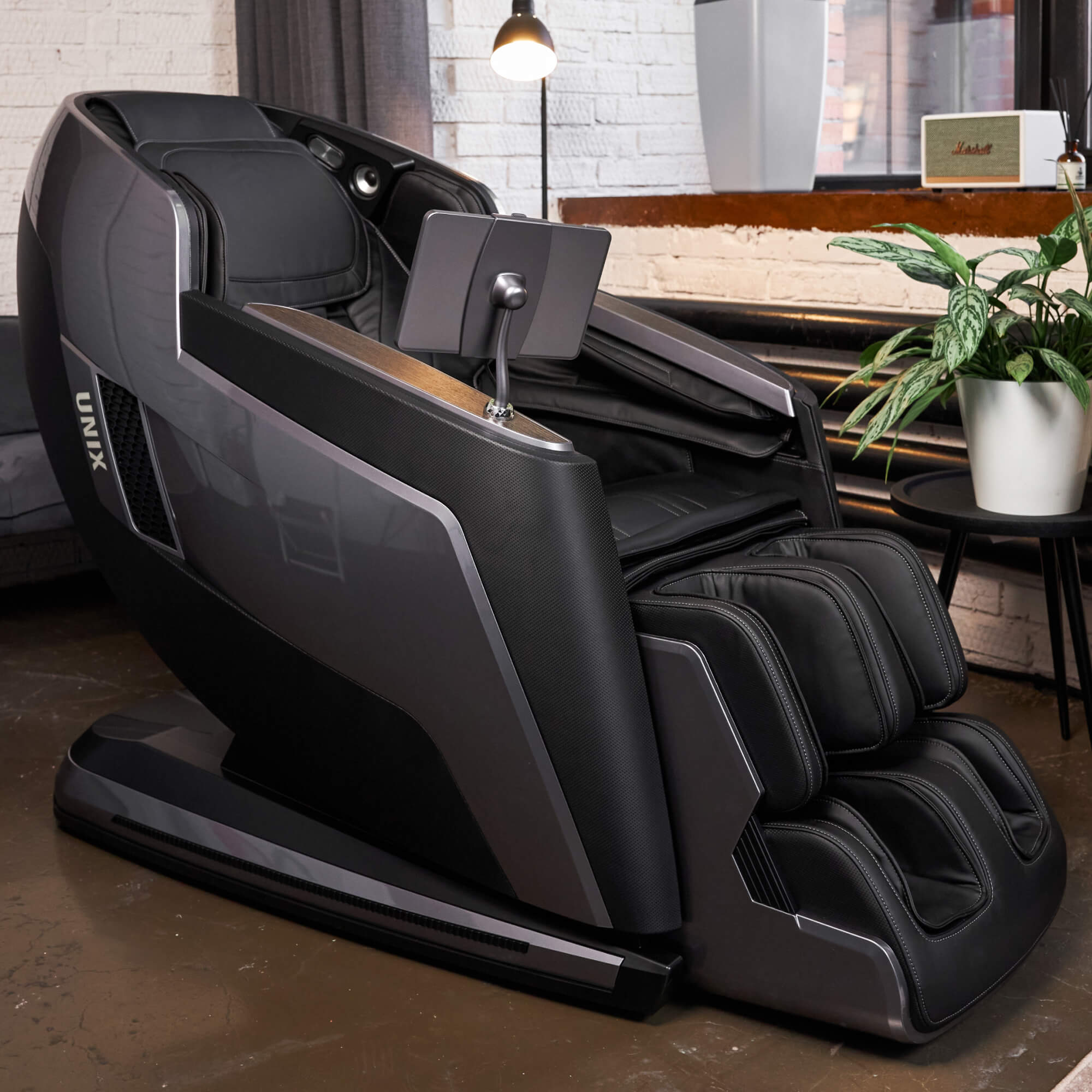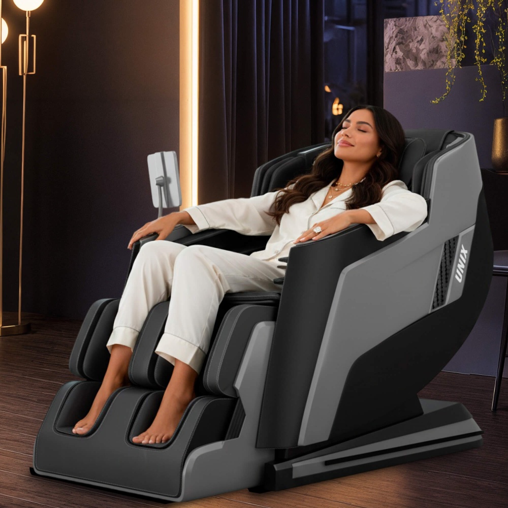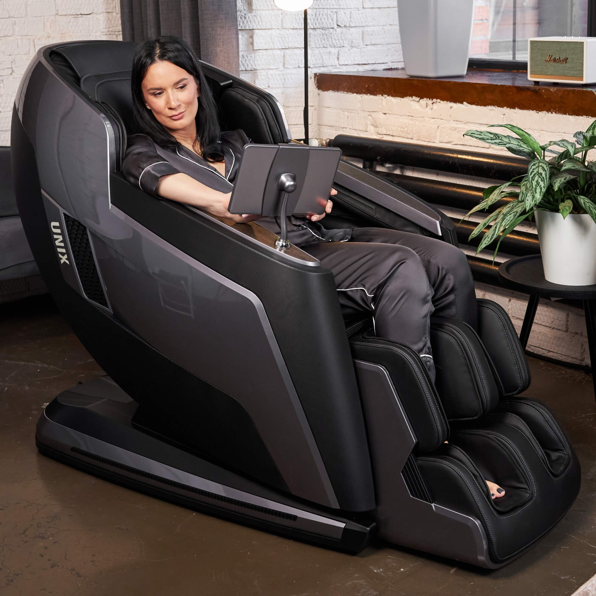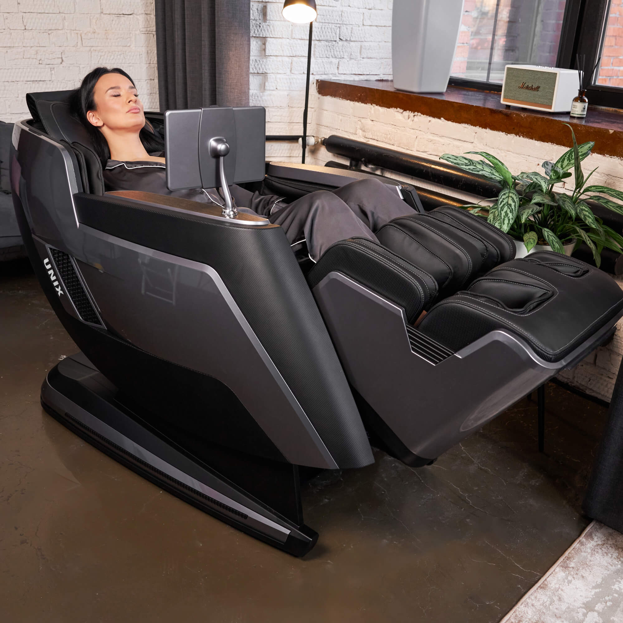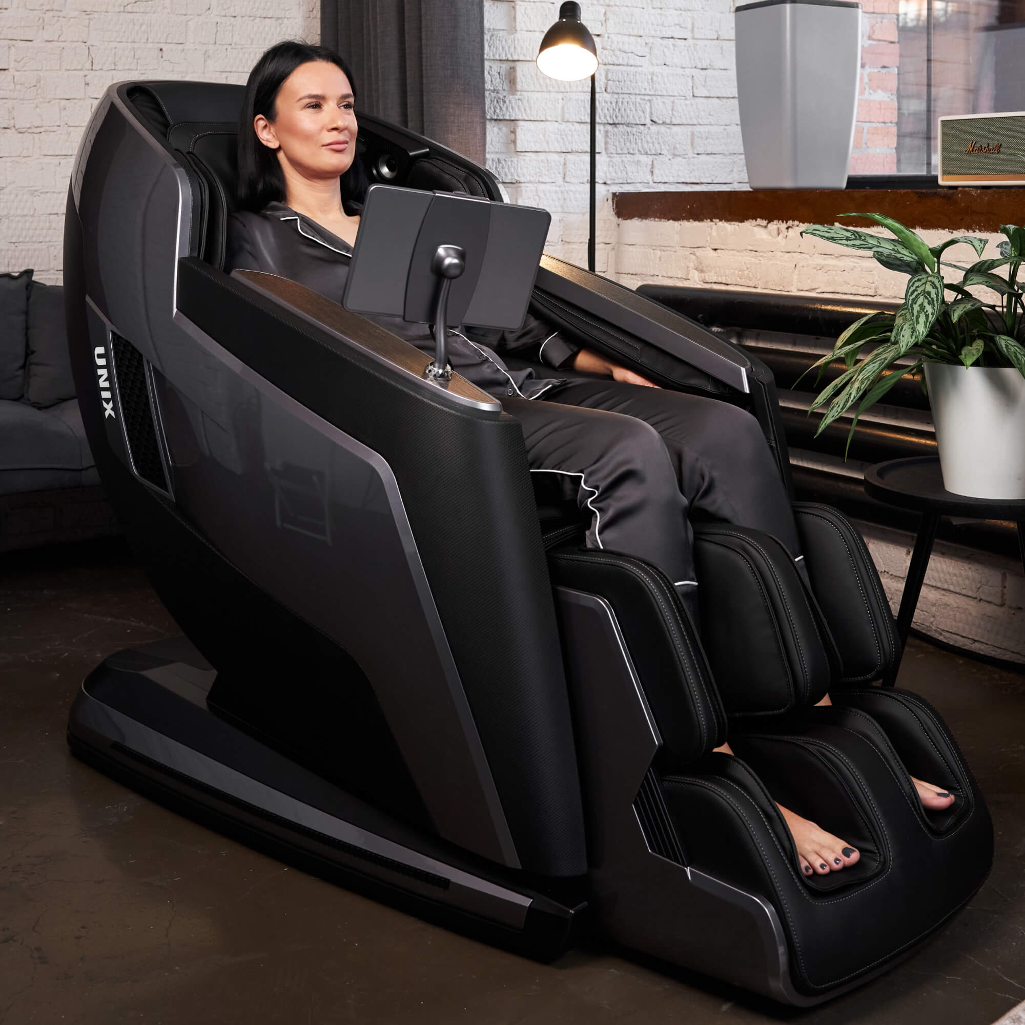 Воздушно-компрессионные подушки делают массаж ног, икроножных мышц и рук. Они подстраиваются под вашу анатомию, что поможет быстрее снять неприятные ощущения. В массажном кресле UNIX Med предусмотрена функция роликового массажа ног и массажера для икроножных мышц.