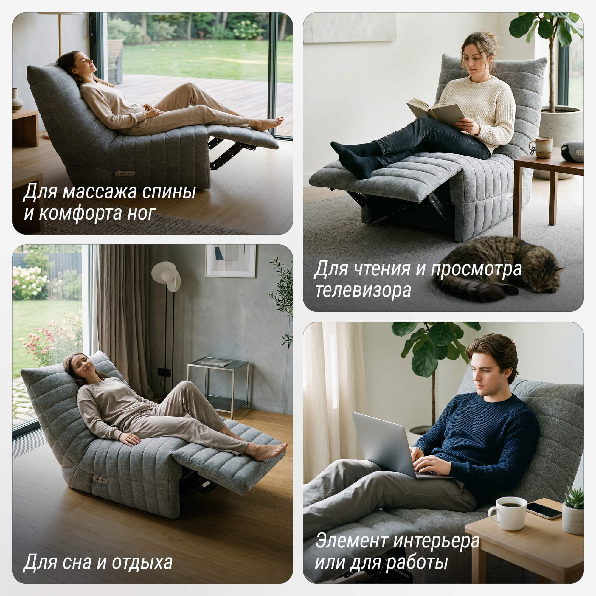 Сердце мягкого кресла — система 2D-массажа спины. Два массажных ролика перемещаются вдоль позвоночника по удлиненной S-образной каретке, что обеспечивает глубокую проработку мышц от шеи до поясницы. Технология 2D имитирует классические приемы профессионального ручного массажа.