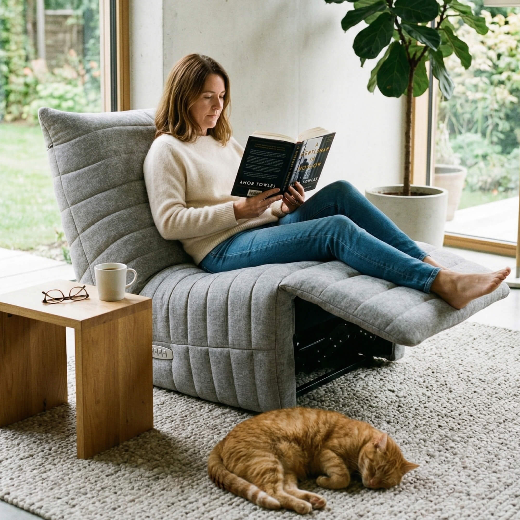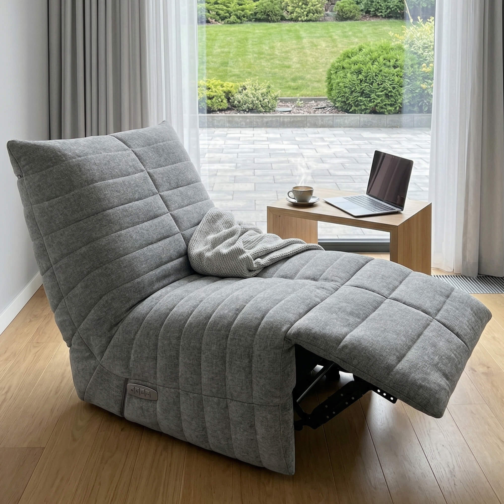 Удобное кресло с подножкой предлагает плавную регулировку угла наклона спинки с возможностью фиксации в любом промежуточном положении: