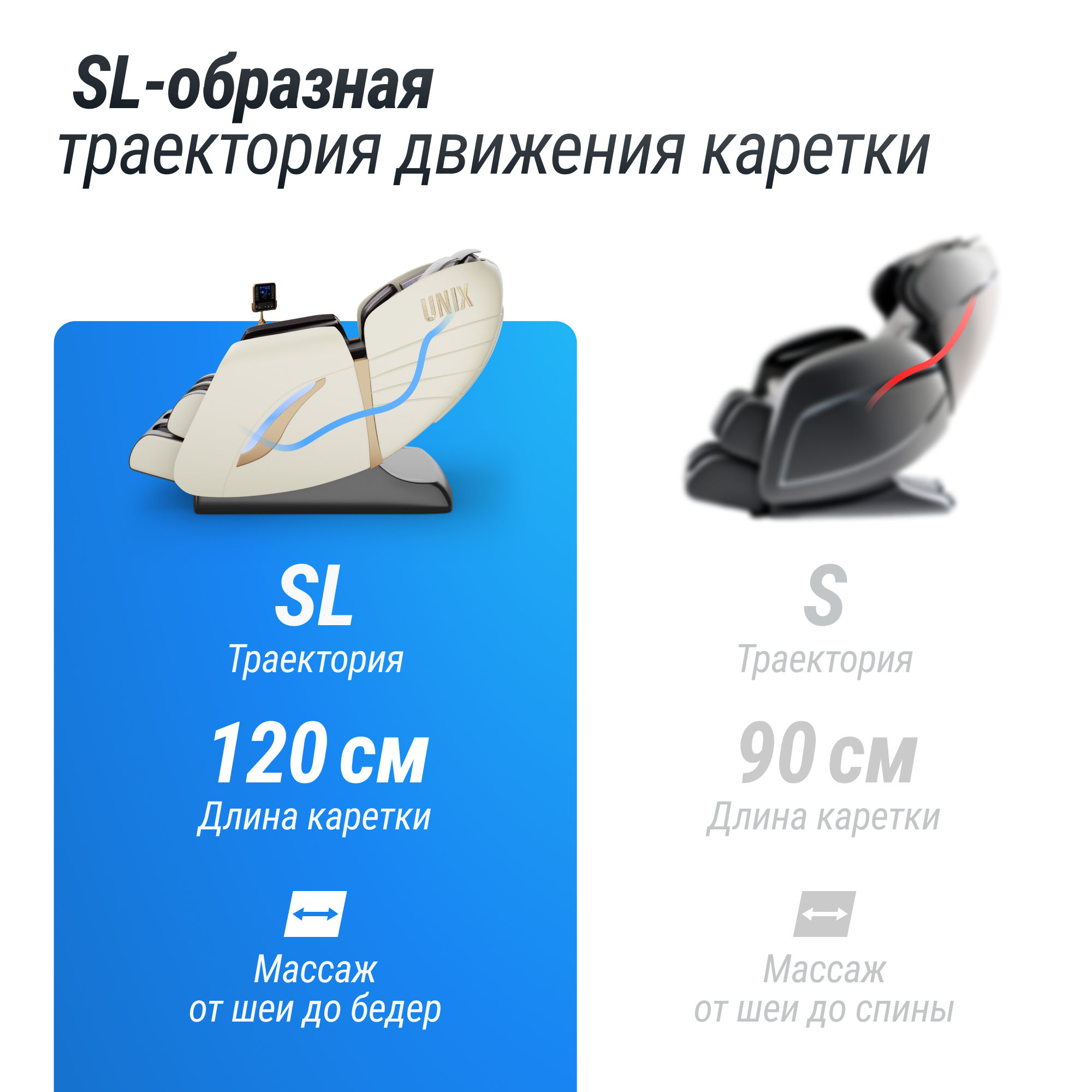 - SL-образная каретка с областью воздействия от шеи до бедер длиной 120 см. Каретка входит в состав блока массажного кресла и отвечает за интенсивность работы роликов. Чем она длинней, тем больше участков тела массируется. SL-образная каретка — это самая новая вариация каретки для более качественного и глубокого массажа. Охватывает больше участков тела, в нее встроены ролики, которые движутся от шеи до бедер. Эргономичный дизайн конструкции каретки выполнен с учетом всех потребностей, которые возникают при массаже в кресле, она идеально подходит под изгибы тела. Прорабатывает область от шеи до бедер и ягодиц и вы ощущаете всю полноту массажа, а ваши мышцы расслабляются. Подлокотник в форме космической капсулы, с обеих сторон которого встроены 8 подушек безопасности для волнового массажа
