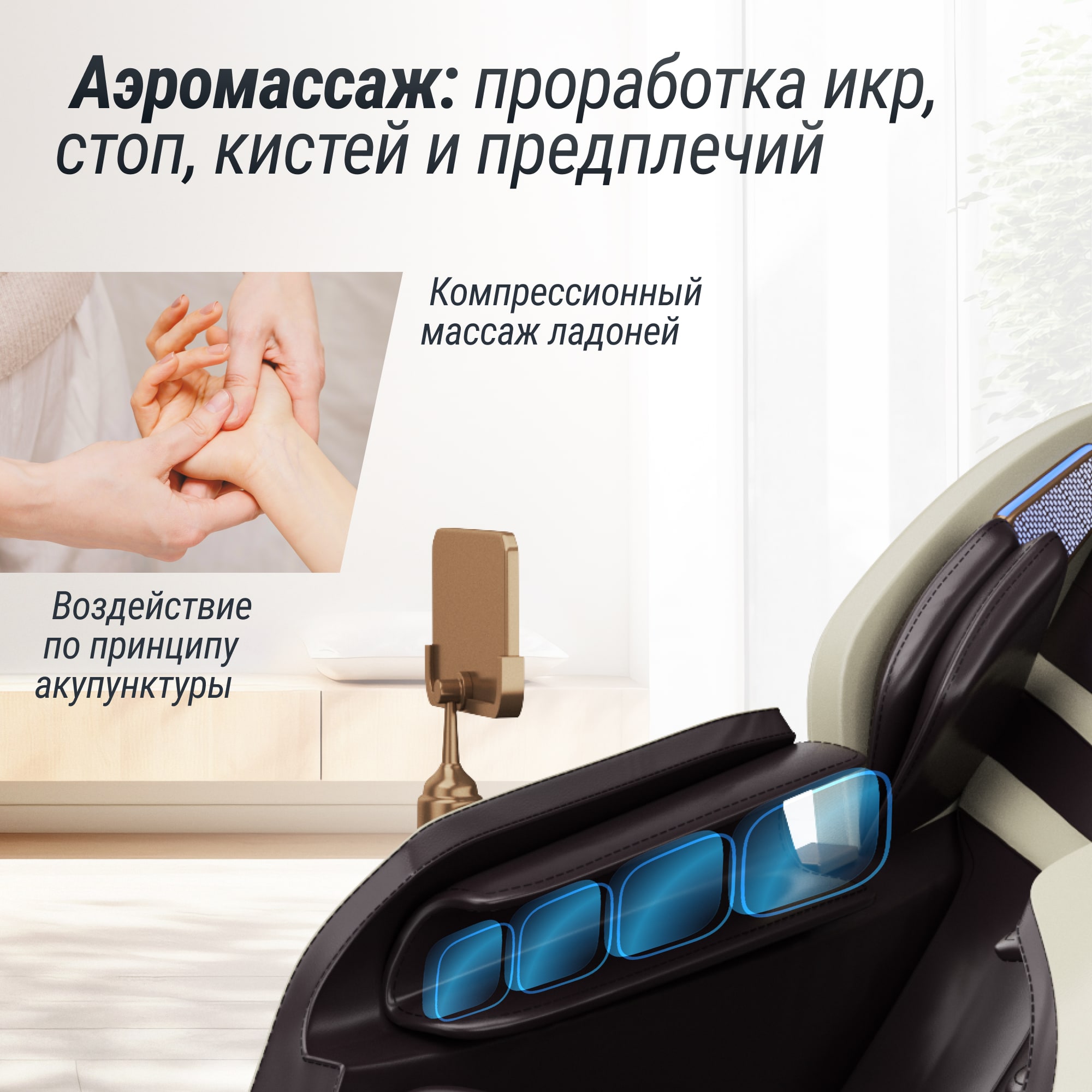 - Возможности. Автоматическое обнаружение и точная настройка положения плеч, изгибов тела и массажных акупунктурных точек, аэромассаж верхней части тела, функция аэромассажа ладоней (4 воздушных массажера), функция аэромассажа рук ((4 воздушных массажера), 3 уровня интенсивности давления воздуха. Аэромассаж нижний части тела: функция аэромассажа икр (12 воздушных массажера) + 3 уровня интенсивности давления воздуха. Воздушные массажеры для левой и правой ладони оснащены функциями ударного массажа. Функция роликового массажа ступней состоит из трех комплектов валиков, которые массируют пальцы и ступни ног, своды ступней, скорость регулируется тремя положениями. Скребковый массаж с роликами для ног, телескопическая функция для упругих ног.