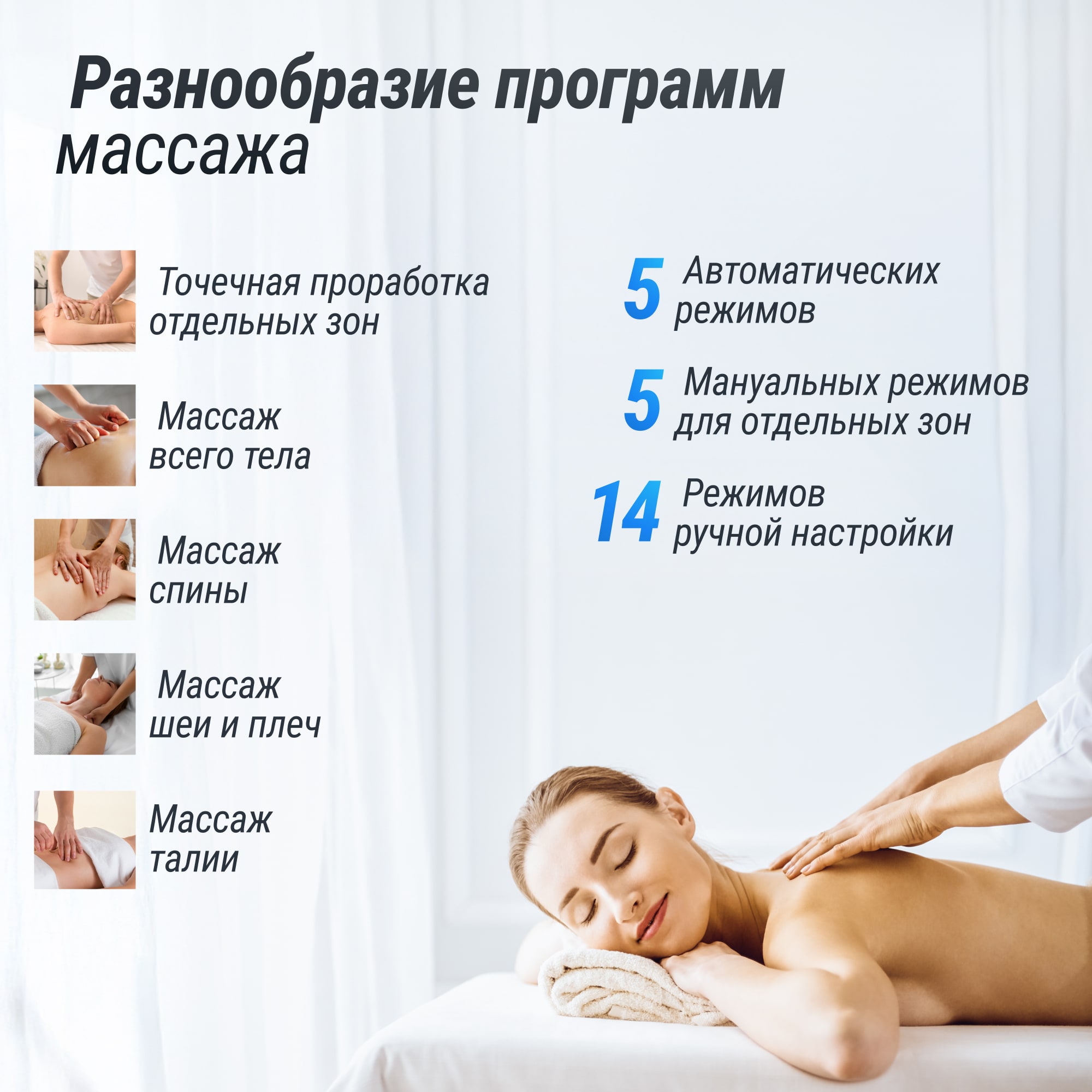 | Спецификации программ | автоматические: мастер-массаж, королевский уход, массаж для плеч, забота о спине, спокойный сон; 5 ручных режимов: массаж фиксированной точки, массаж верхней части спины: массаж нижней части спины, локальный массаж, полный массаж; 14 техник ручного массажа на выбор, частичный массаж |