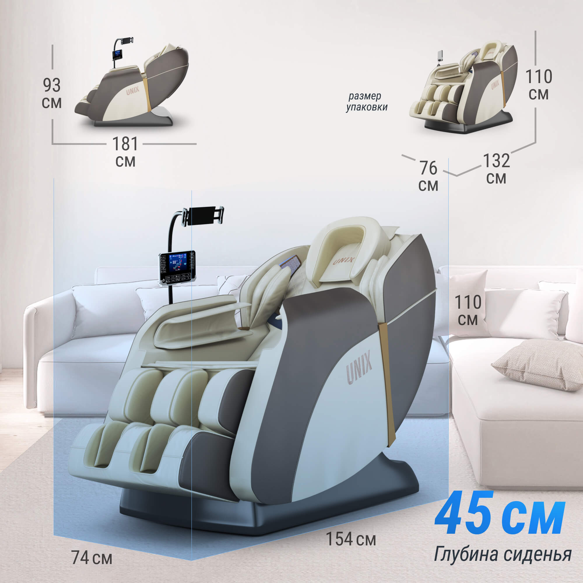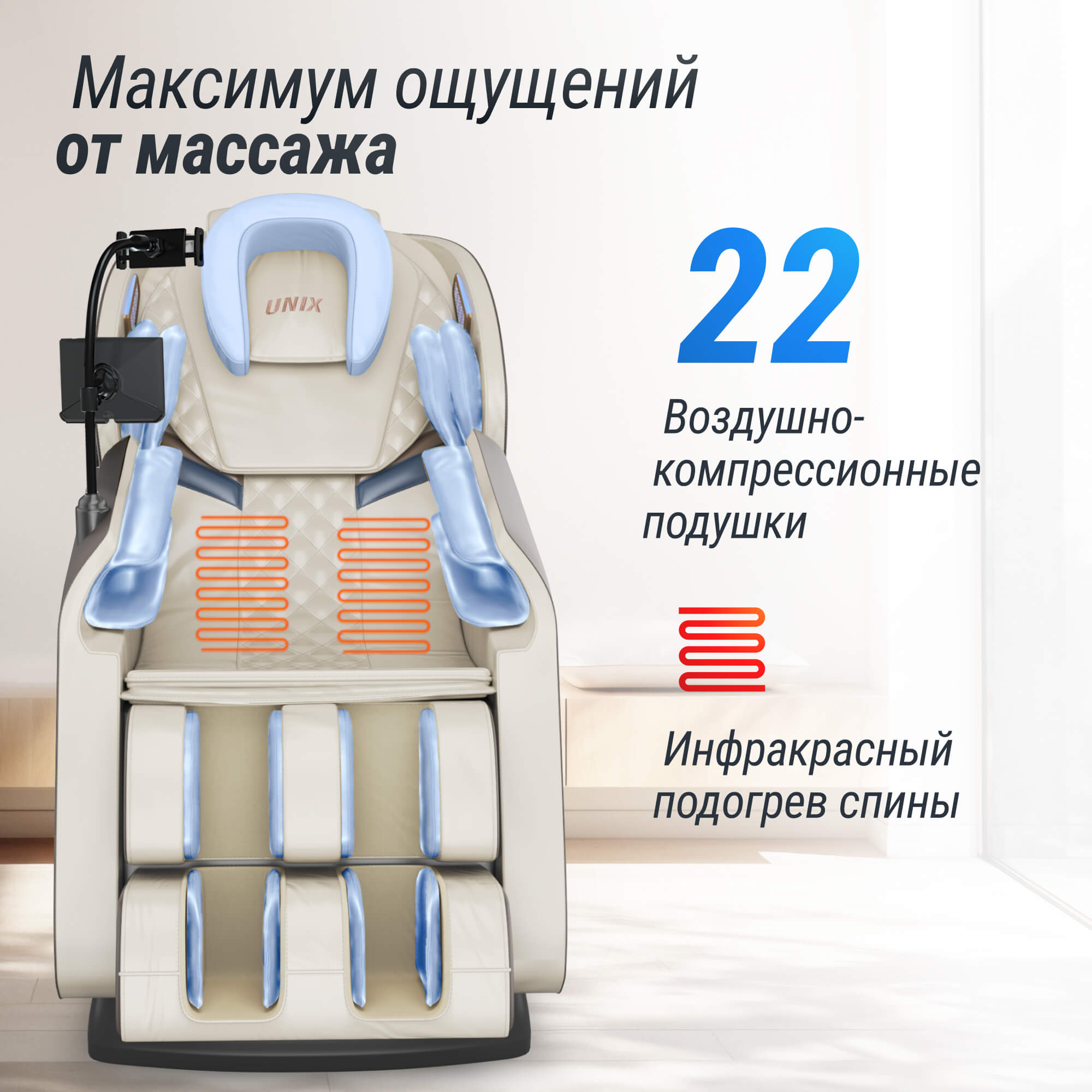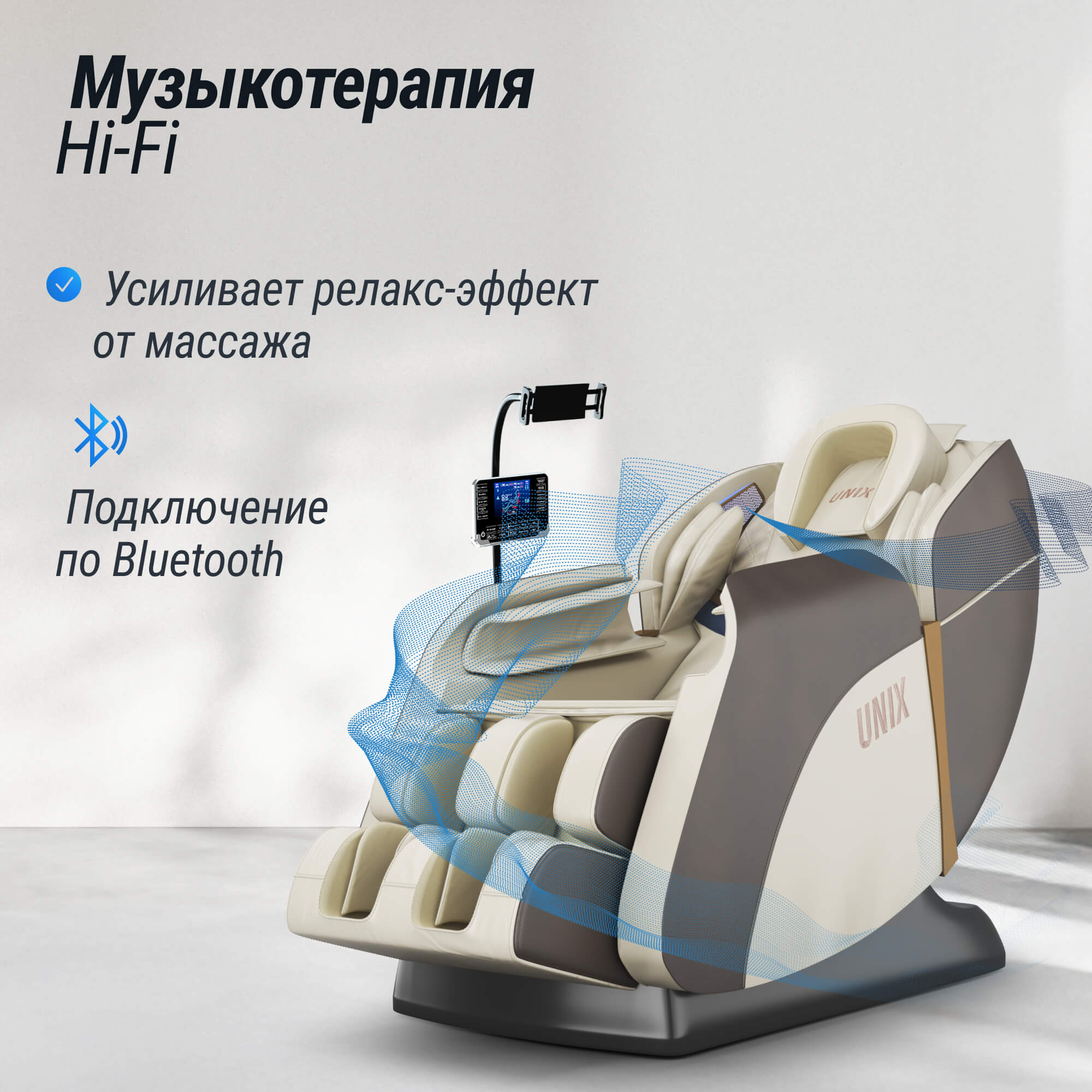 - Встроенные динамики позволят во время массажа слушать любимую музыку через Bluetooth со звуком Hi-Fi. Кресло позволяет синхронизировать вашу любимую музыку с массажным механизмом. Расслабьтесь под свою любимую музыку и получайте удовольствие с массажным креслом UNIX Med. Массажное кресло не только функционально, но и стильно. Элегантный дизайн и качественные материалы позволят ему гармонично вписаться в любой интерьер. А благодаря TFT экрану с удобными настройками и простым управлением вы сможете легко переключаться между режимами массажа, не вставая с кресла.