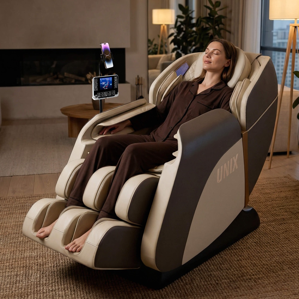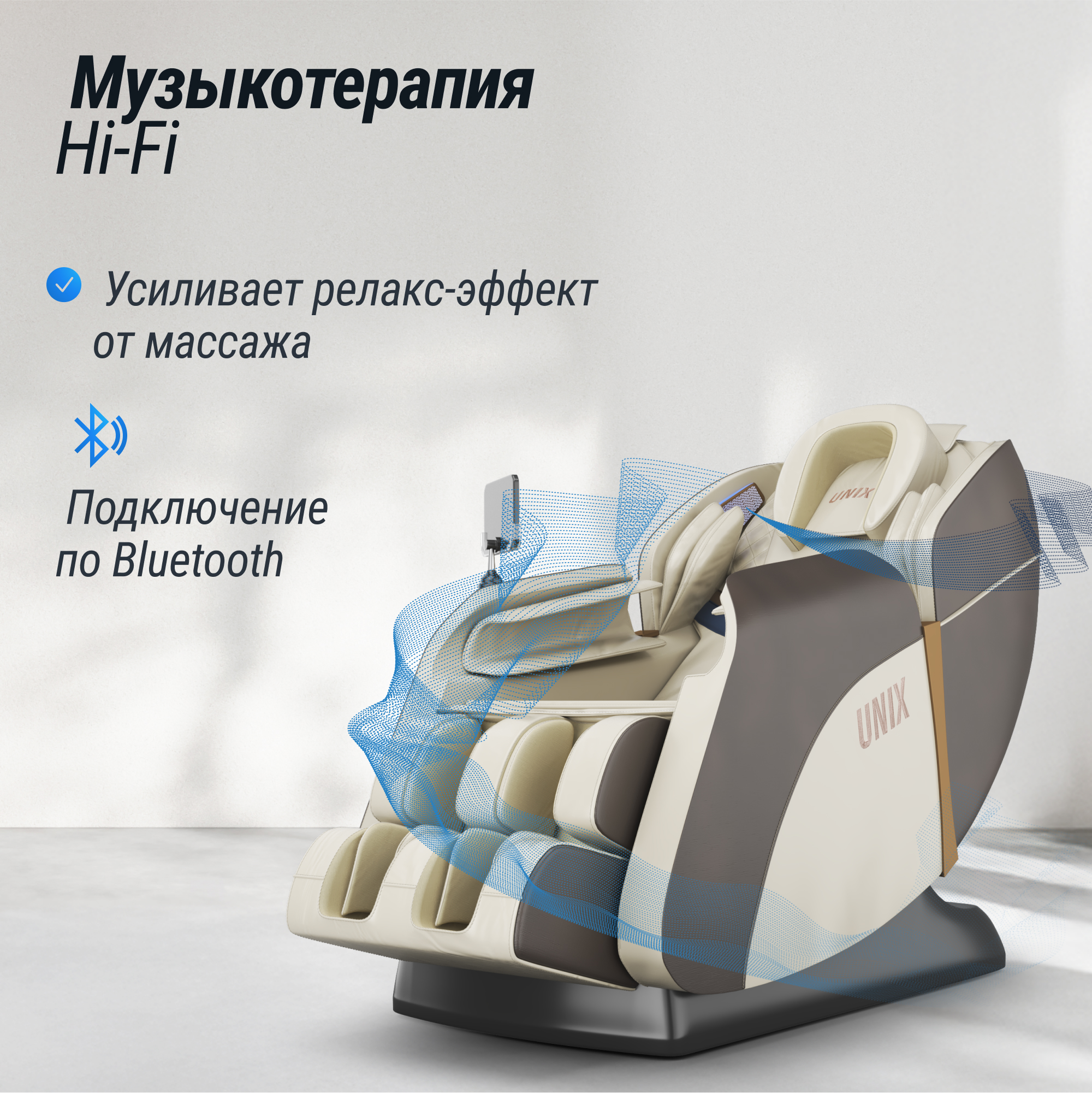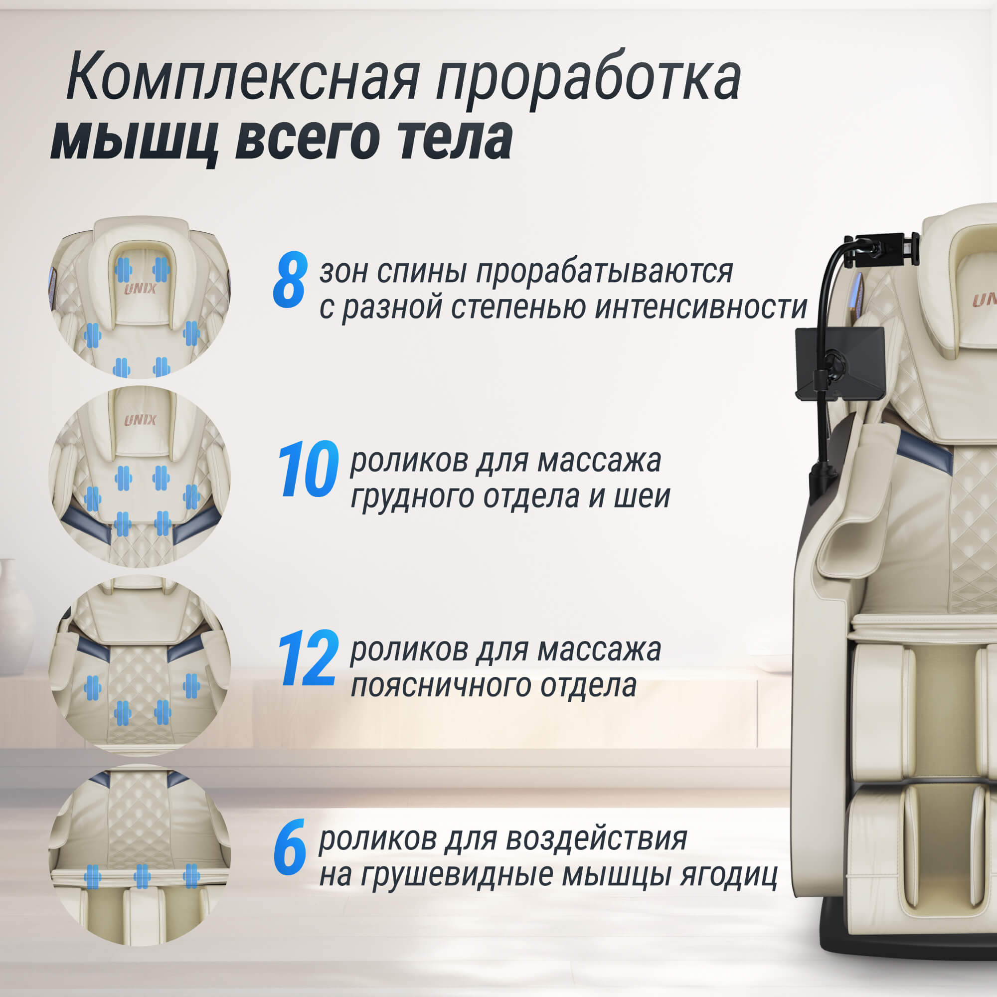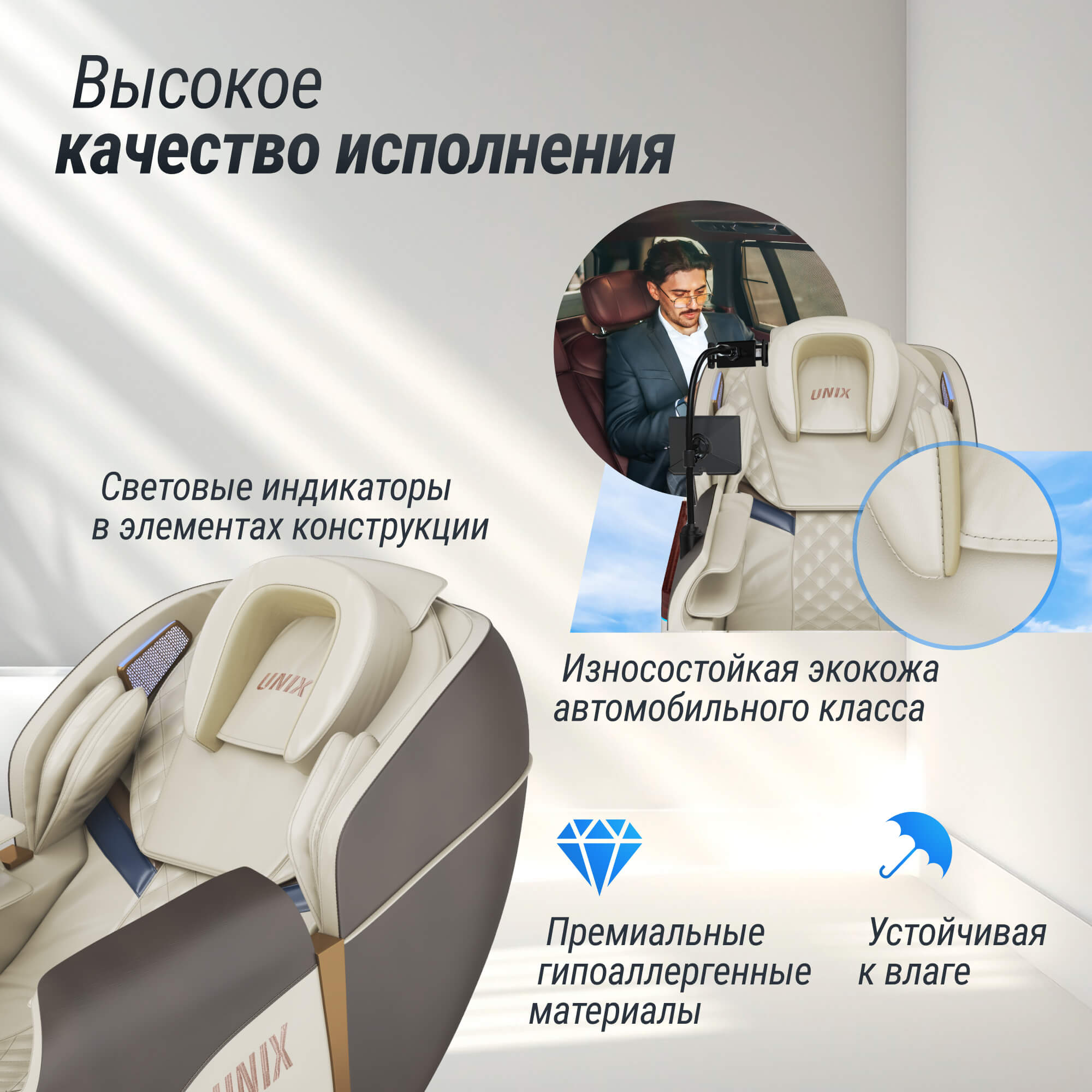 - Встроенные динамики позволят во время массажа слушать любимую музыку через Bluetooth со звуком Hi-Fi. Кресло позволяет синхронизировать вашу любимую музыку с массажным механизмом. Расслабьтесь под свою любимую музыку и получайте удовольствие с массажным креслом UNIX Med. Массажное кресло не только функционально, но и стильно. Элегантный дизайн и качественные материалы позволят ему гармонично вписаться в любой интерьер. А благодаря TFT экрану с удобными настройками и простым управлением вы сможете легко переключаться между режимами массажа, не вставая с кресла.