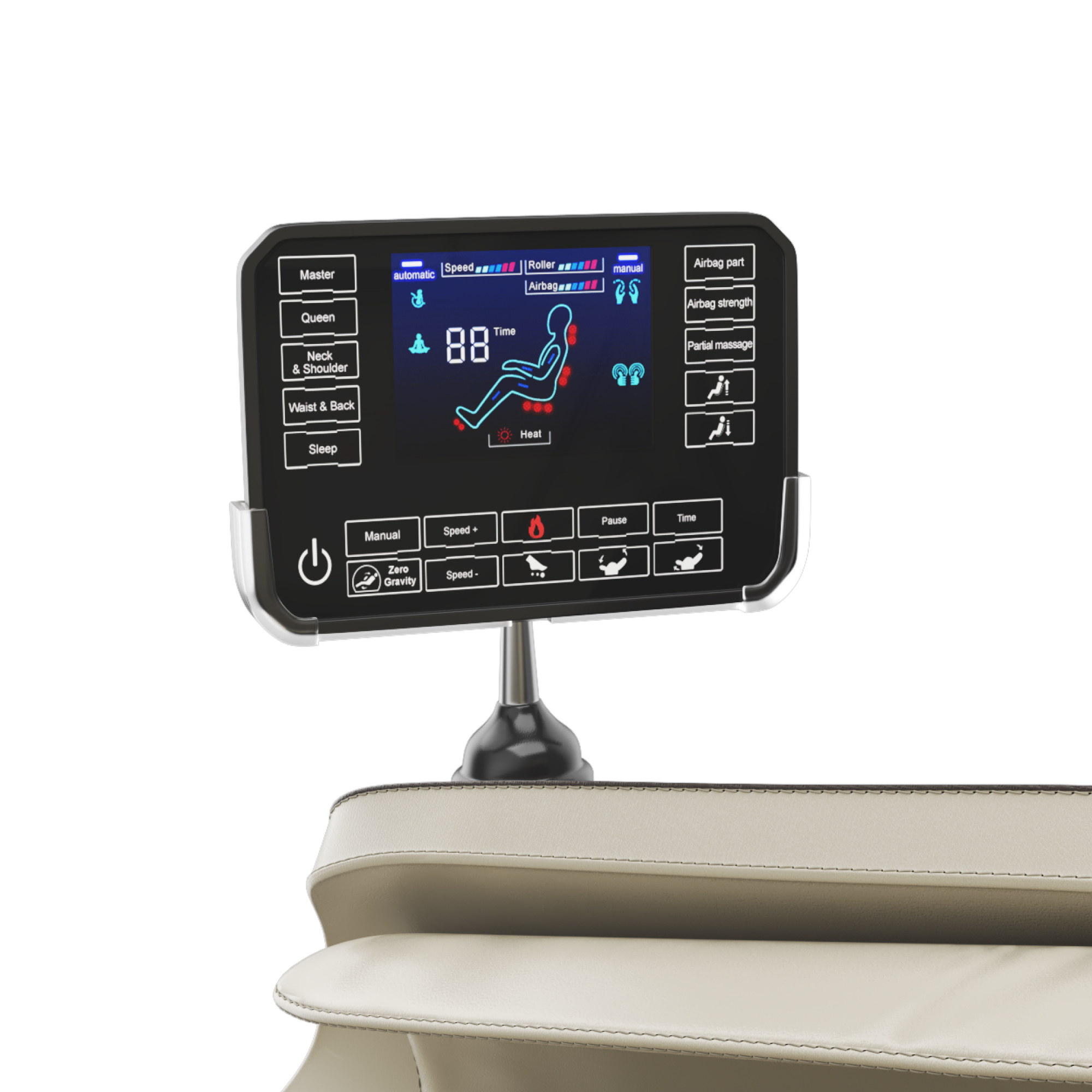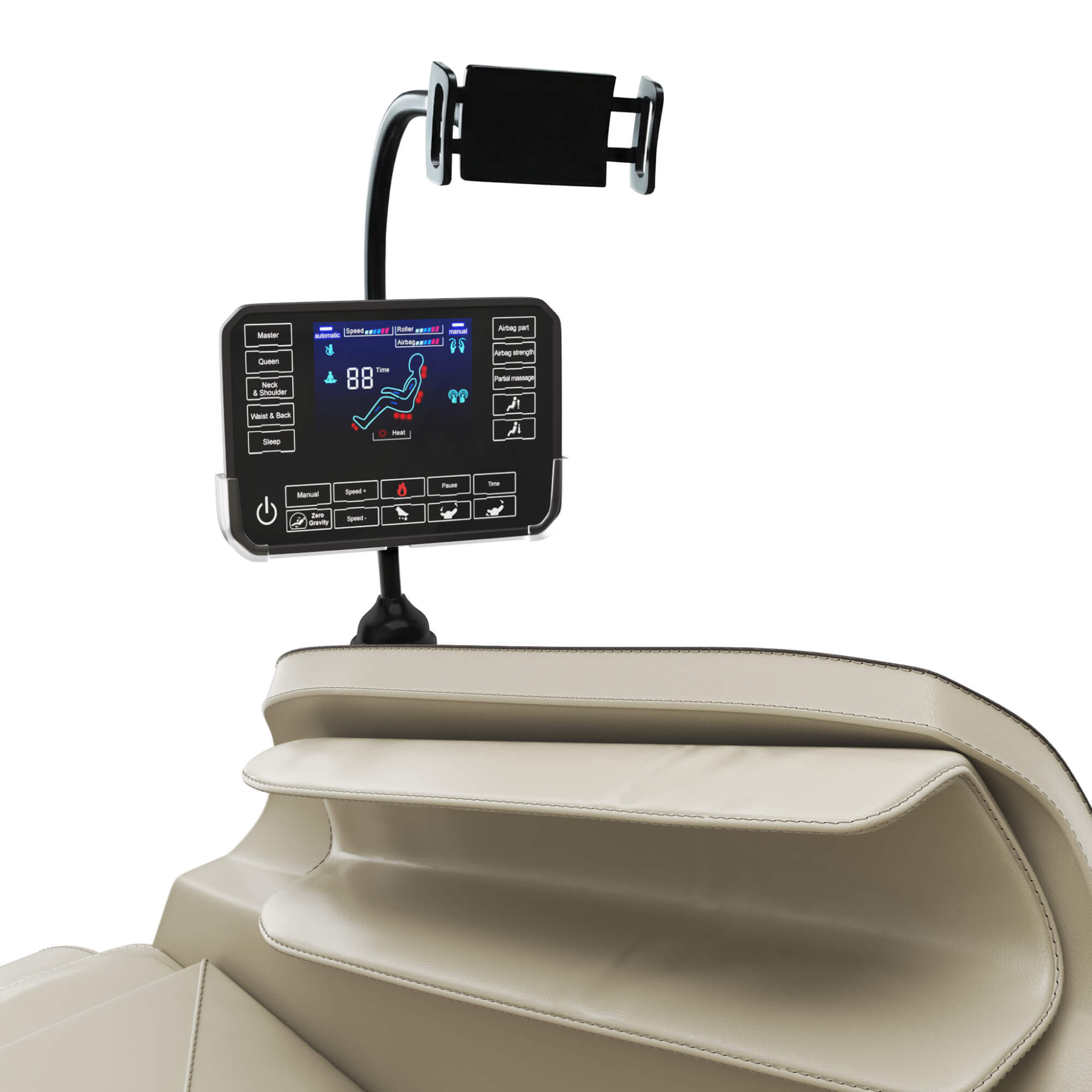 - Управляйте с легкостью! Интуитивно понятный сенсорный пульт управления в виде планшета располагается на подлокотнике. Массажное кресло оснащено поворотным переключателем для управления программами массажа. При необходимости в меню можно настроить подогрев, скорость, время. Широкий диапазон изменения уровня давления и времени поможет настроить массажный механизм под свои потребности