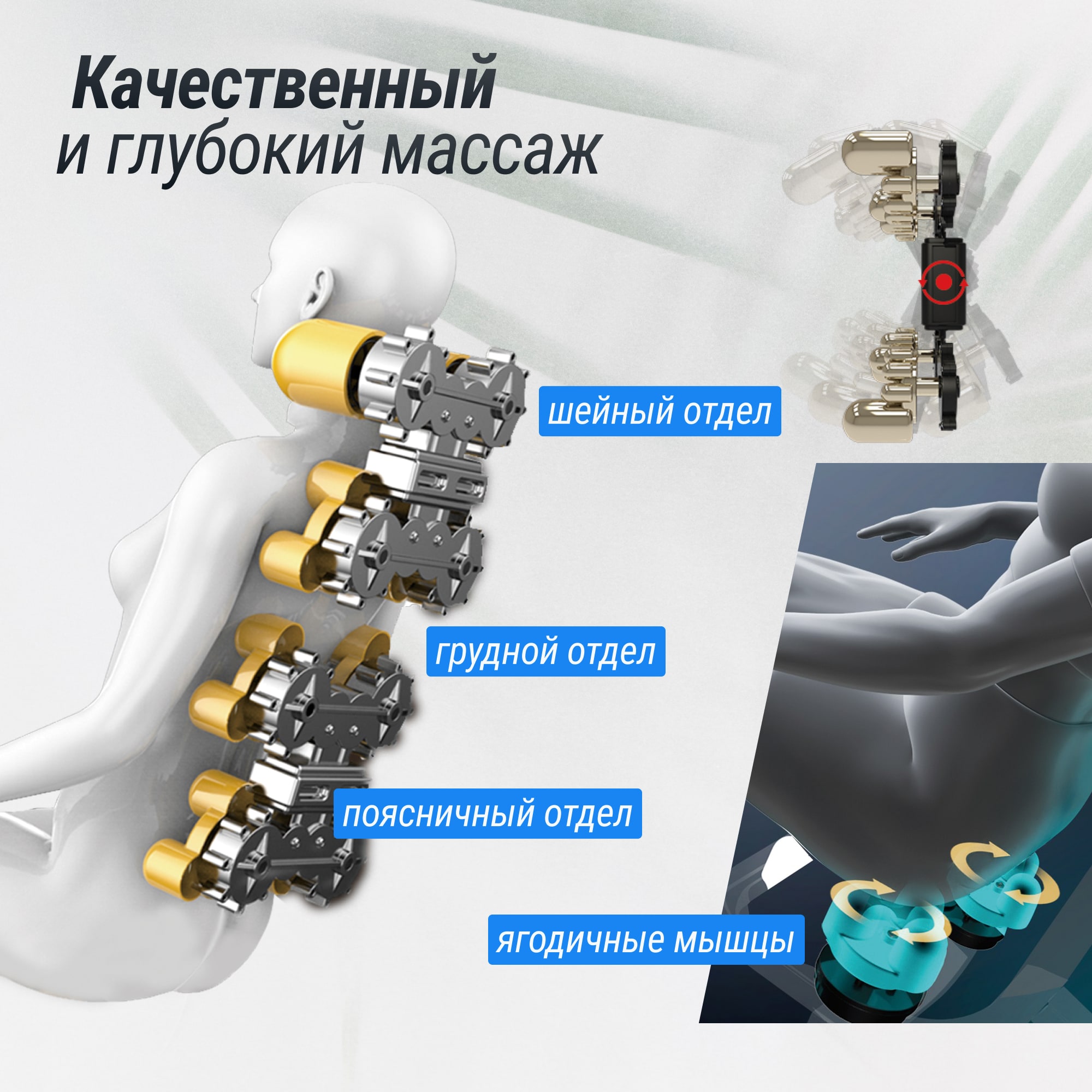| Зоны массажа | плечи / икры / руки / ступни / ноги / голова / ягодицы / талия / спина / шейный отдел / грудной отдел / поясничный отдел |