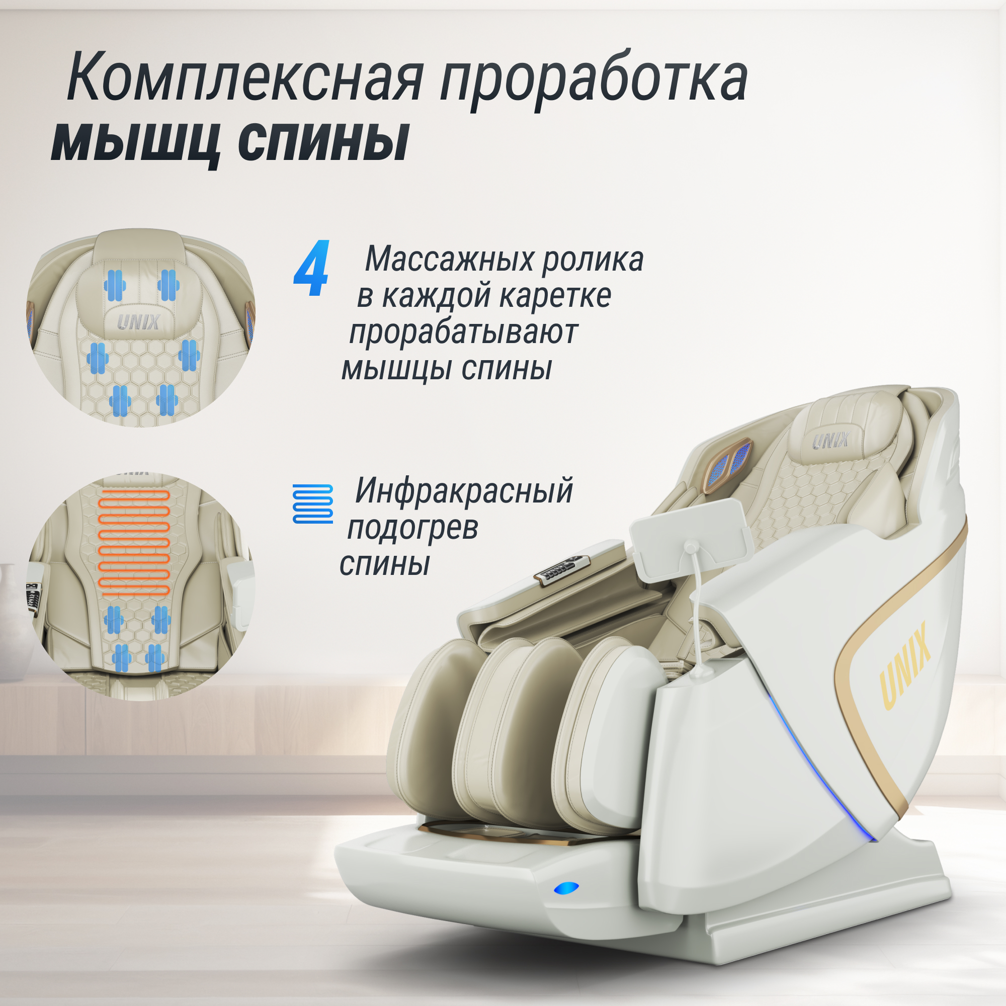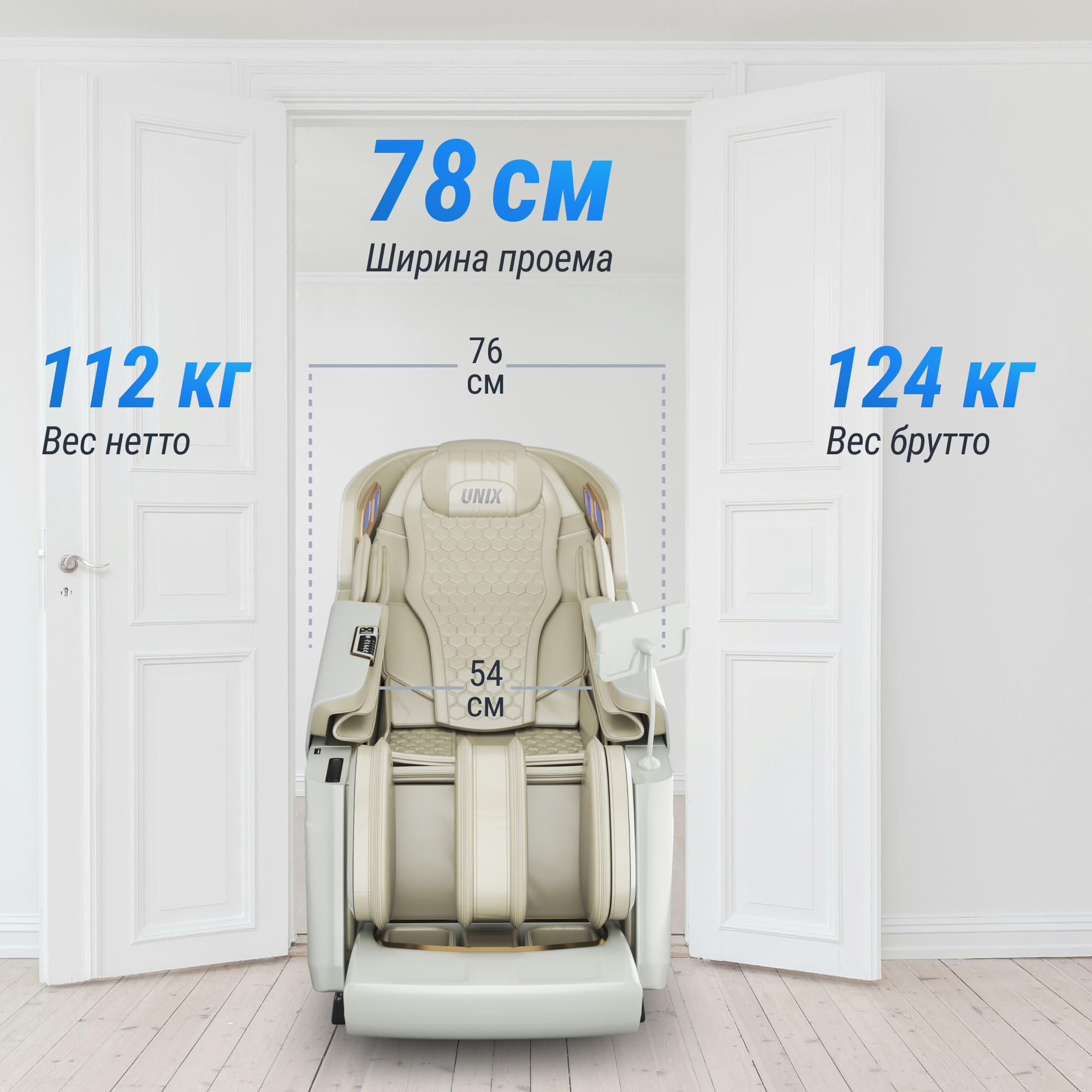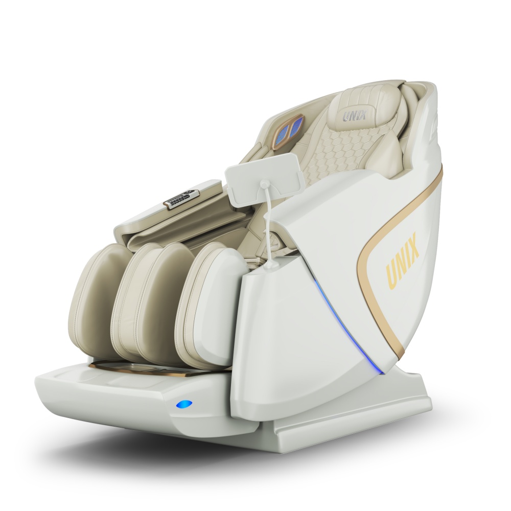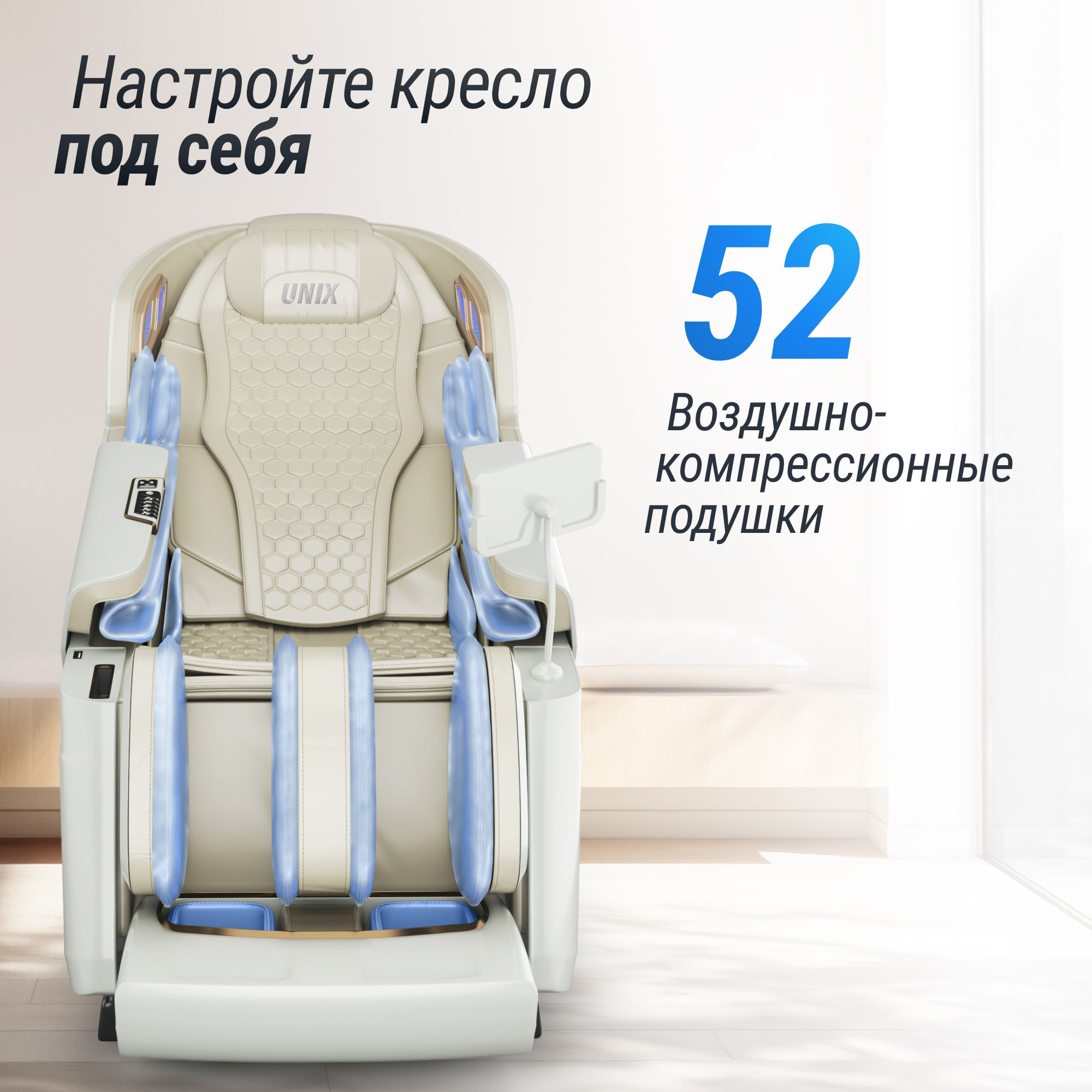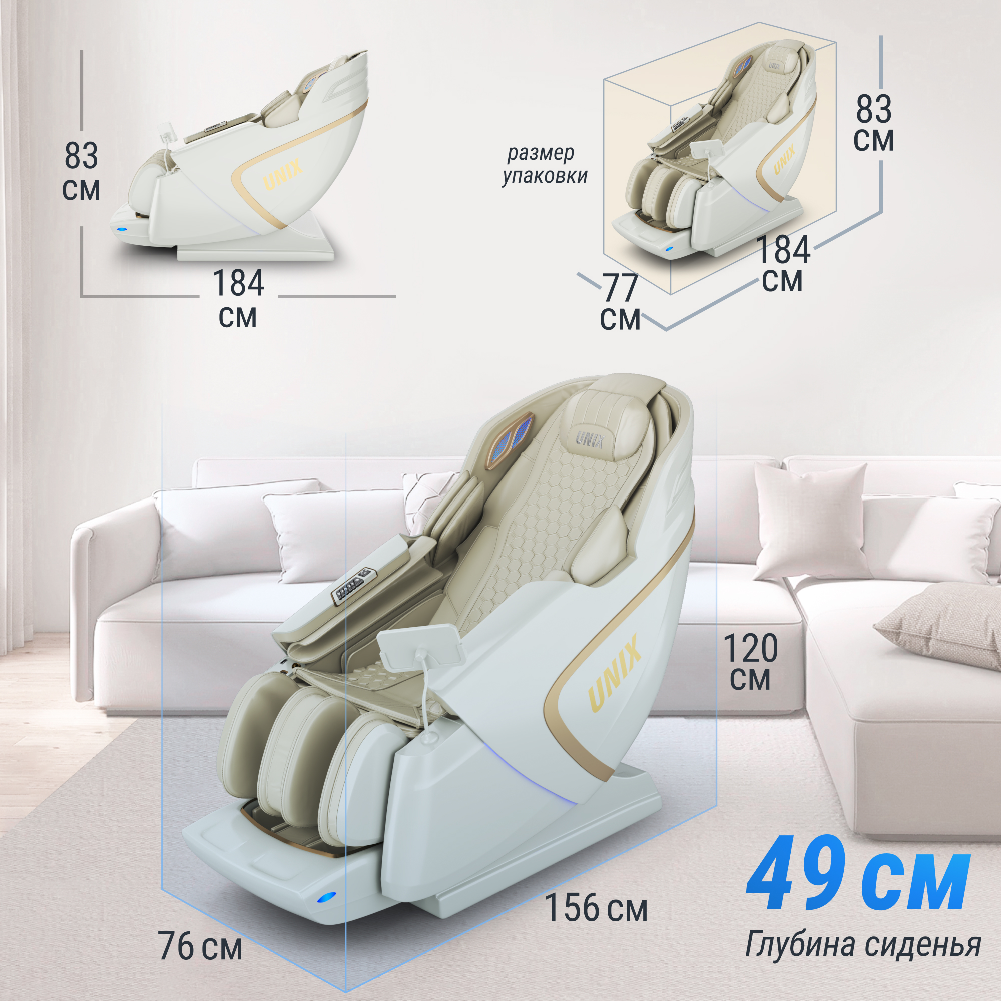 Откройте для себя новое измерение комфорта и заботы о здоровье с революционным массажным креслом UNIX Aura, оборудованным передовыми технологиями 4D манипулятора и датчиками анализа здоровья. Это не просто массажное кресло — это ваш личный терапевт, который всегда готов прийти на помощь. Каркас спинки в лежачем положении выполнен по технологии скользящего рельса, что позволяет разместить изделие всего в 10 см от стены, максимально экономя пространство.