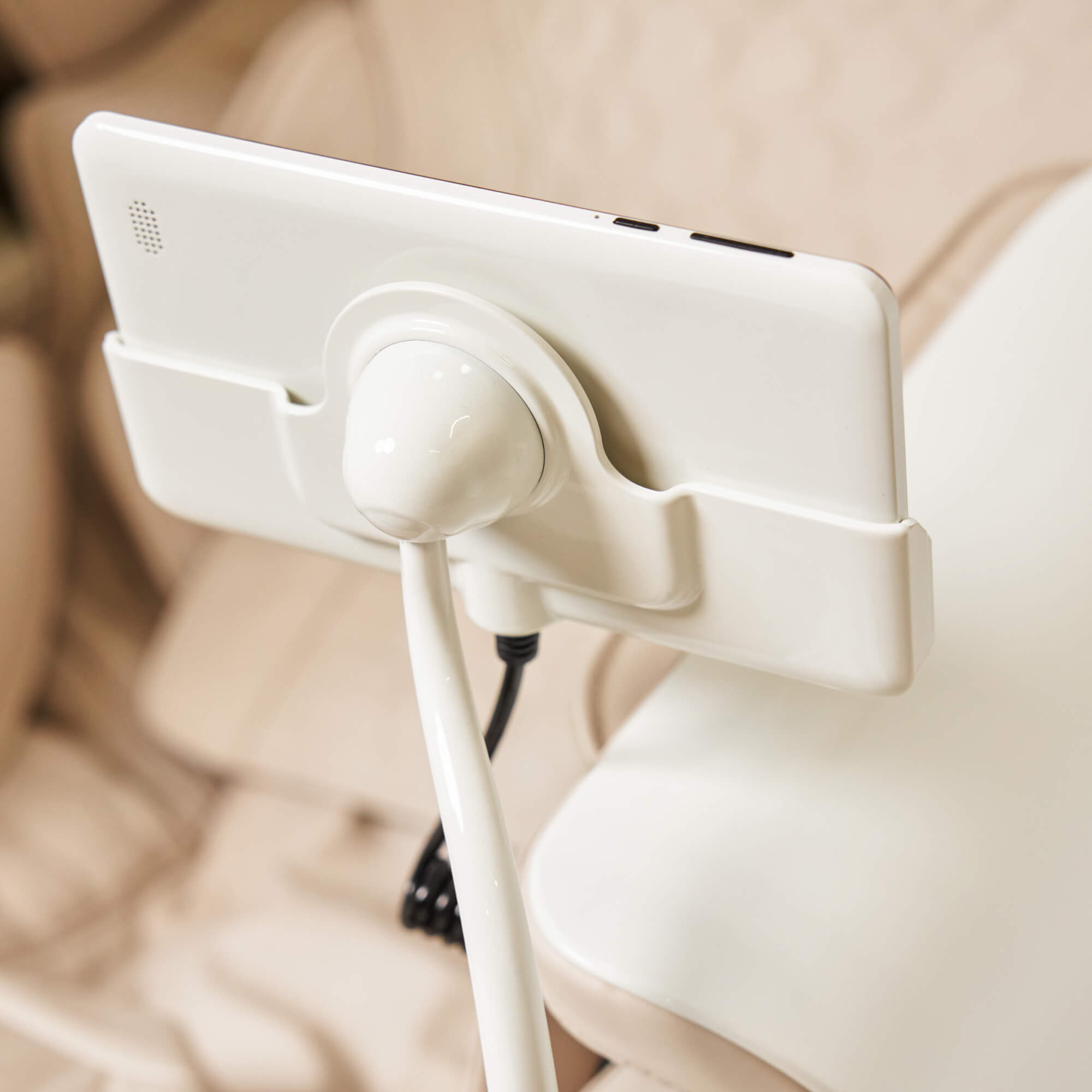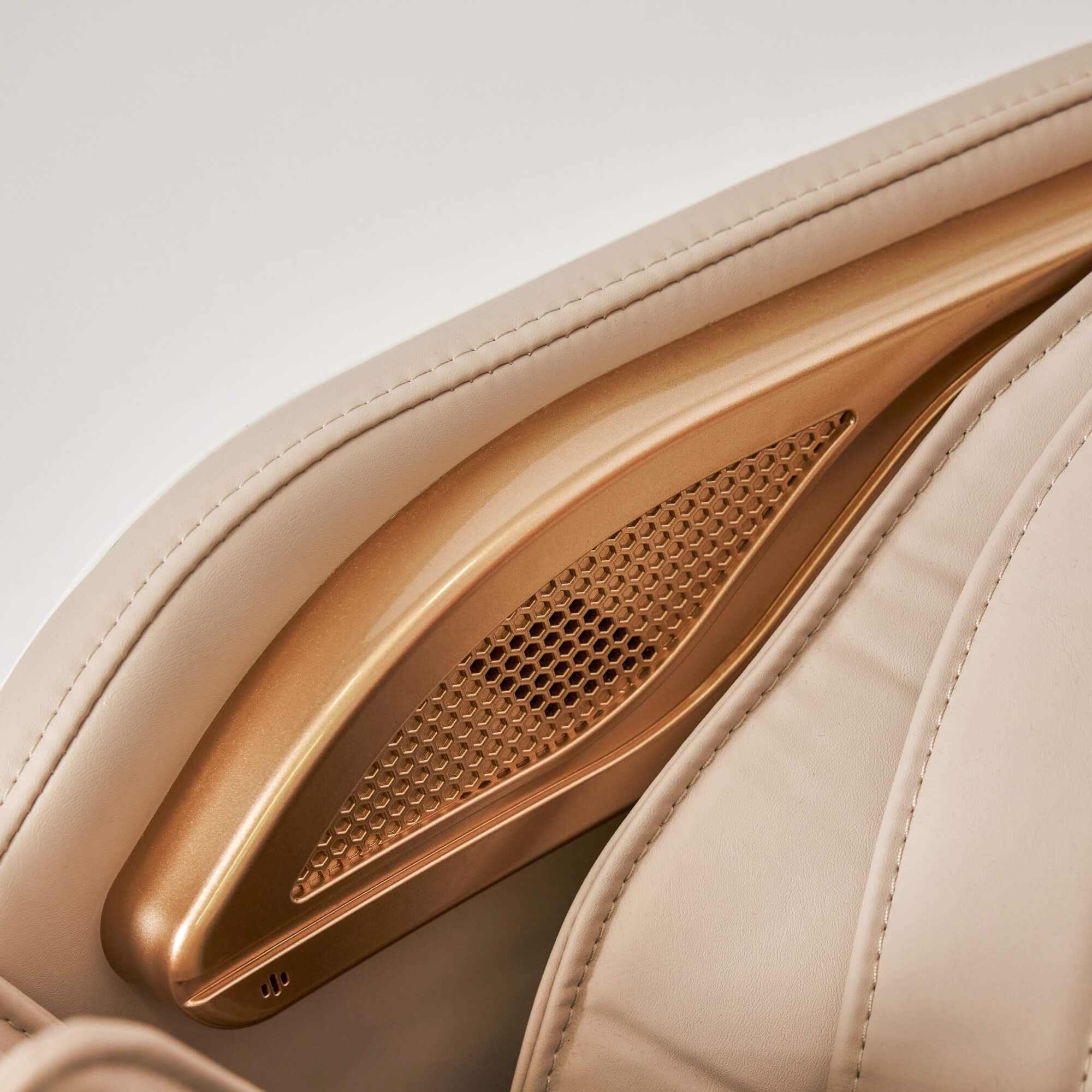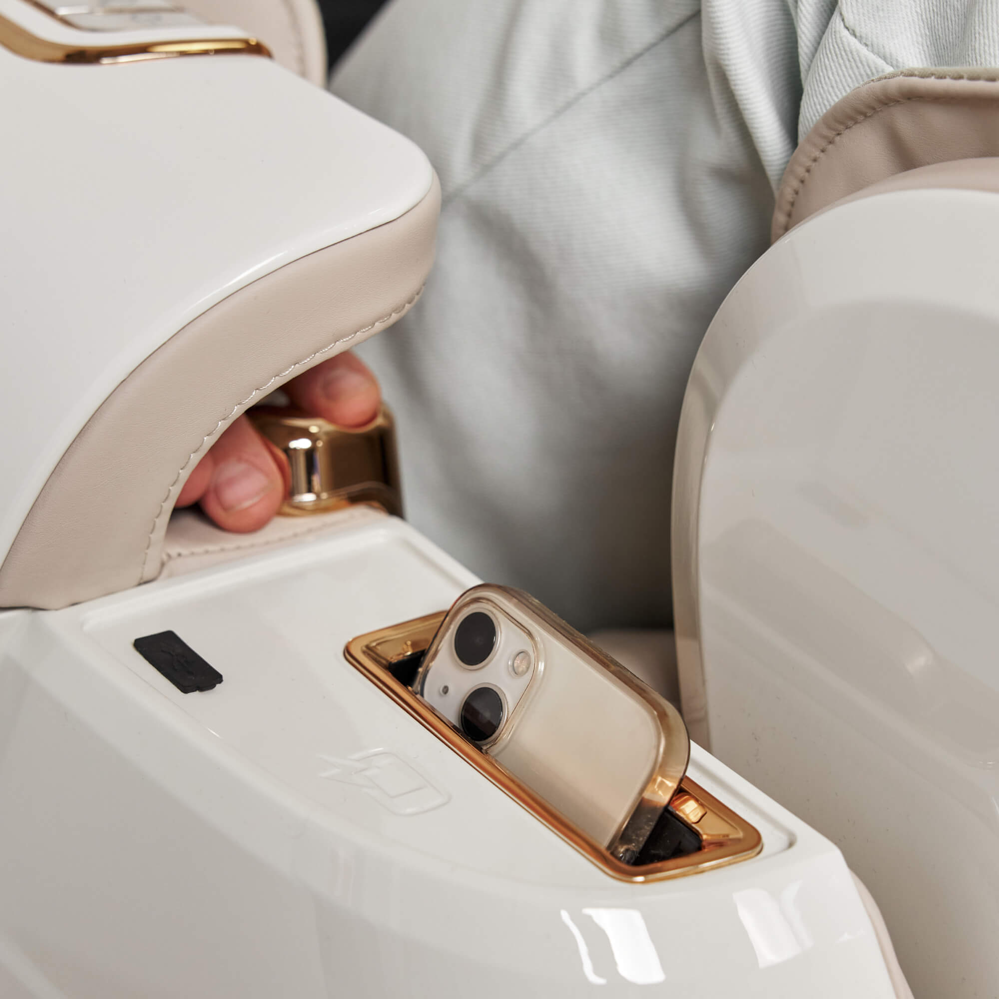 - Встроенные динамики. Для максимального комфорта во время сеанса, кресло предусматривает слот для беспроводной зарядки и USB-порт, аудиосистему и 6 музыкальных режимов на выбор, а также возможность подключения собственной музыки по Bluetooth.