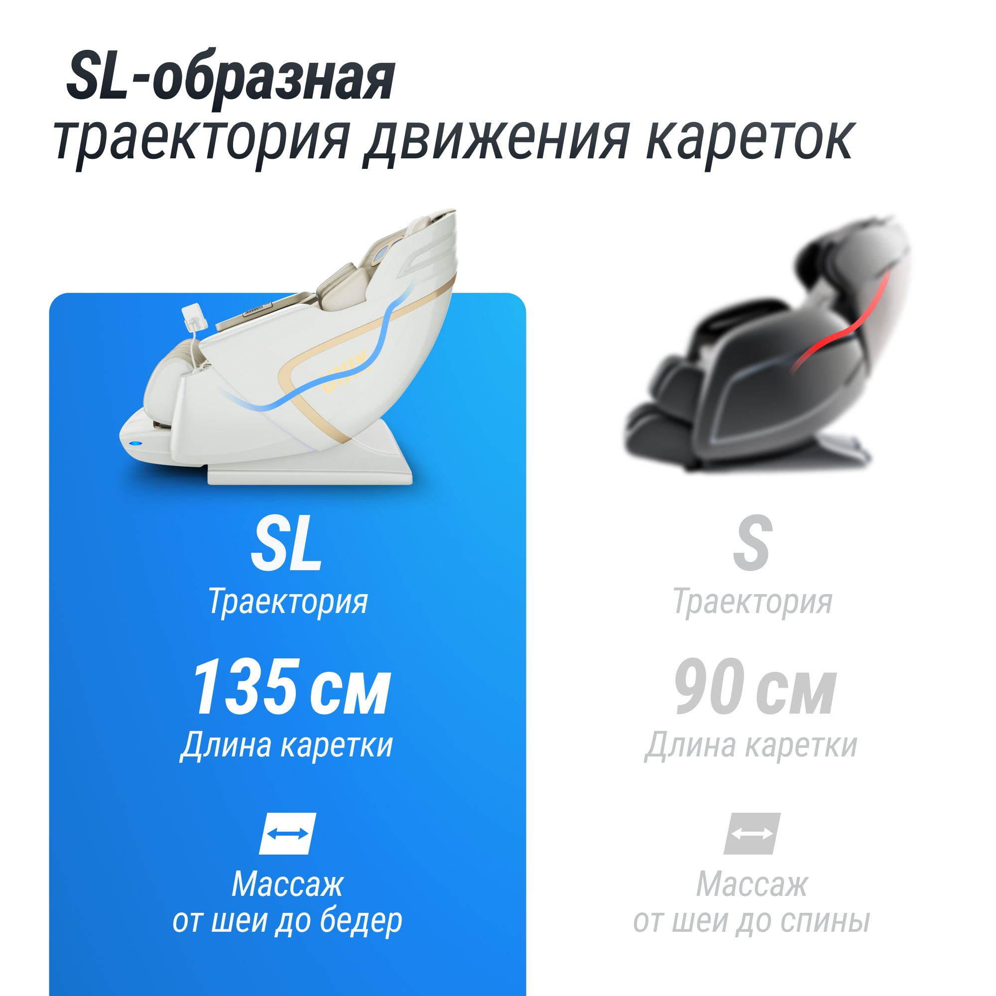 - SL-образная каретка с областью воздействия от шеи до бедер длиной 135 см. Каретка входит в состав блока массажного кресла и отвечает за интенсивность работы роликов. Чем она длинней, тем больше участков тела массируется. SL-образная каретка — это самая новая вариация каретки для более качественного и глубокого массажа. Охватывает больше участков тела, в нее встроены ролики, которые движутся от шеи до бедер. Эргономичный дизайн конструкции каретки выполнен с учетом всех потребностей, которые возникают при массаже в кресле, она идеально подходит под изгибы тела. Прорабатывает область от шеи до бедер и ягодиц и вы ощущаете всю полноту массажа, а ваши мышцы расслабляются. Подлокотник в форме космической капсулы, с обеих сторон которого встроены 8 подушек безопасности для волнового массажа.