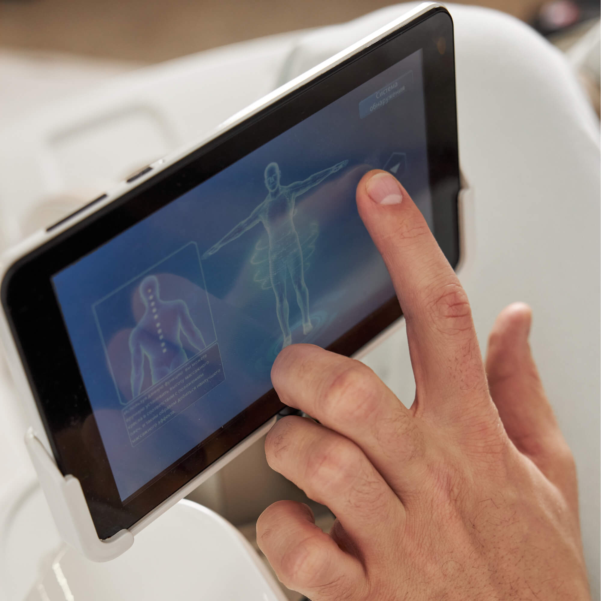 - Автоматическое сканирование формы тела. Интегрированные датчики анализа здоровья производят замеры по принципу измерения ЭКГ, позволяя креслу адаптироваться под ваши индивидуальные потребности. Они отслеживают частоту пульсу, уровень кислорода в крови, микроциркуляции, индекса усталости и другие параметры, чтобы предложить наиболее эффективные программы массажа. Определяется структура тела сканируемого человека, его рост, ширина плеч, спины, талии, а также все изгибы. Это позволяет создать полную 3D-модель человека. После всех выполненных вычислений массажное кресло настраивает ширину массажных роликов таким образом, чтобы они попадали на наиболее напряженные участки и правильно прорабатывали их. Благодаря этой функции вы сможете быть уверены, что получаете именно тот уход, который вам нужен.