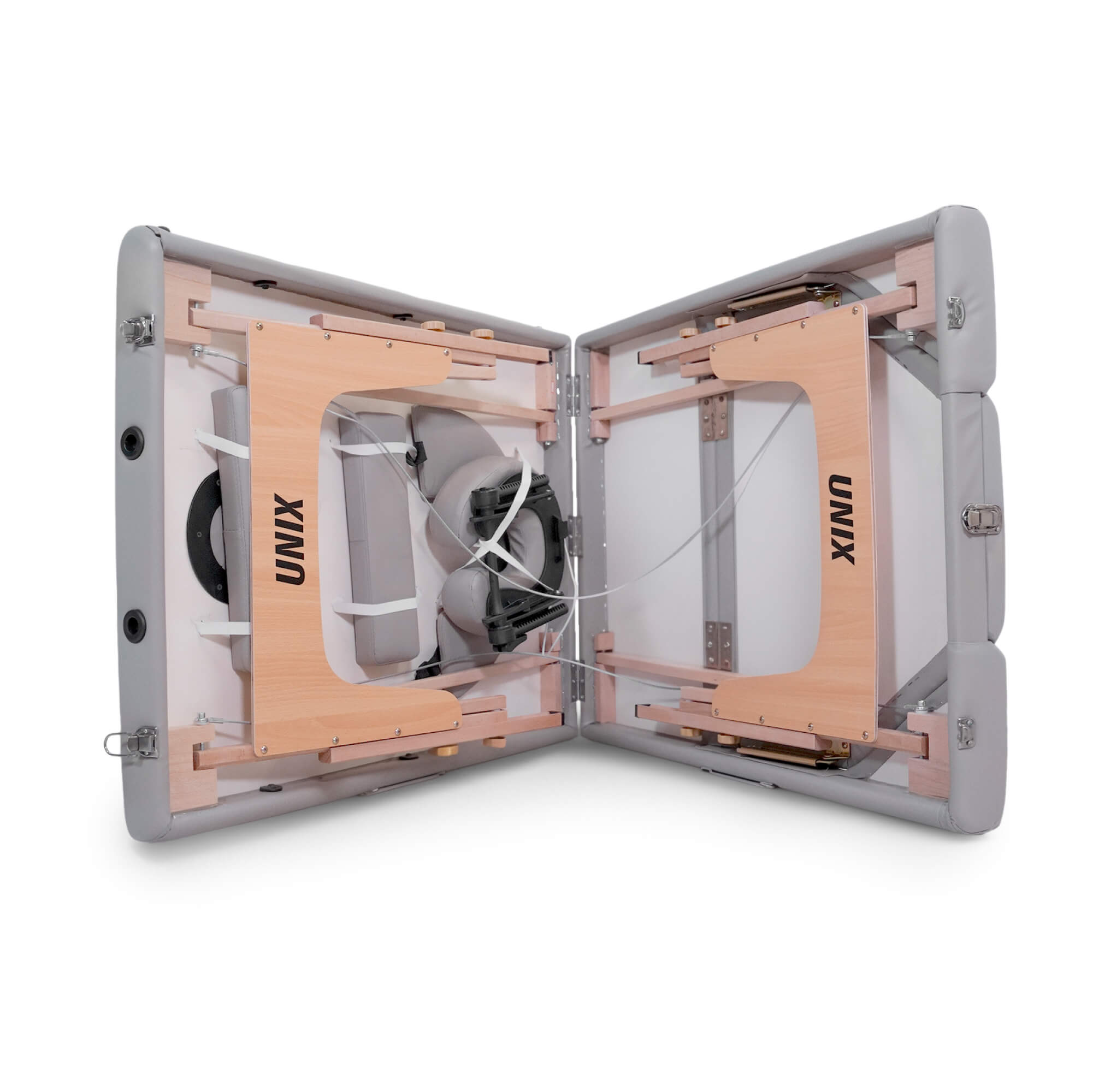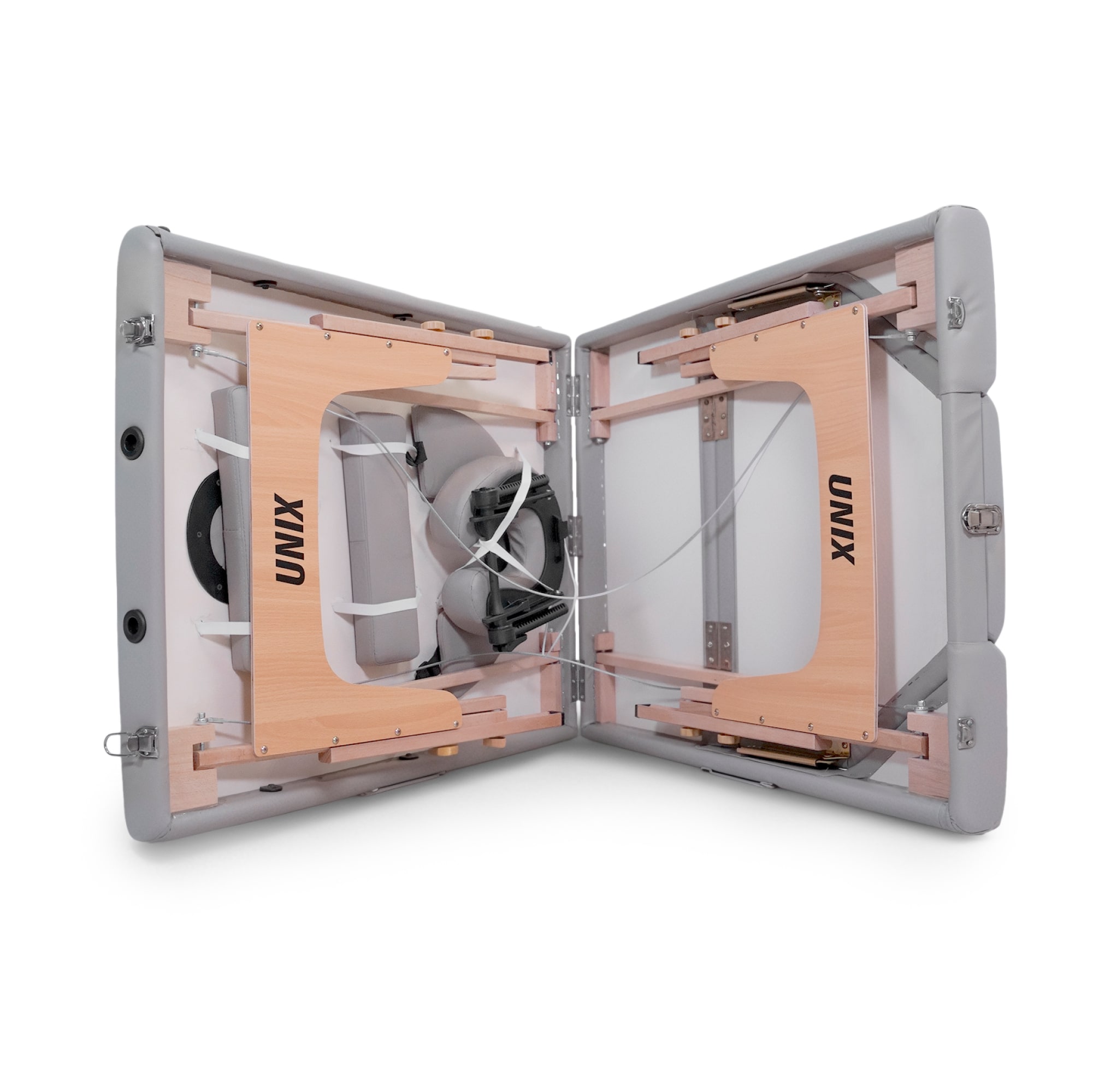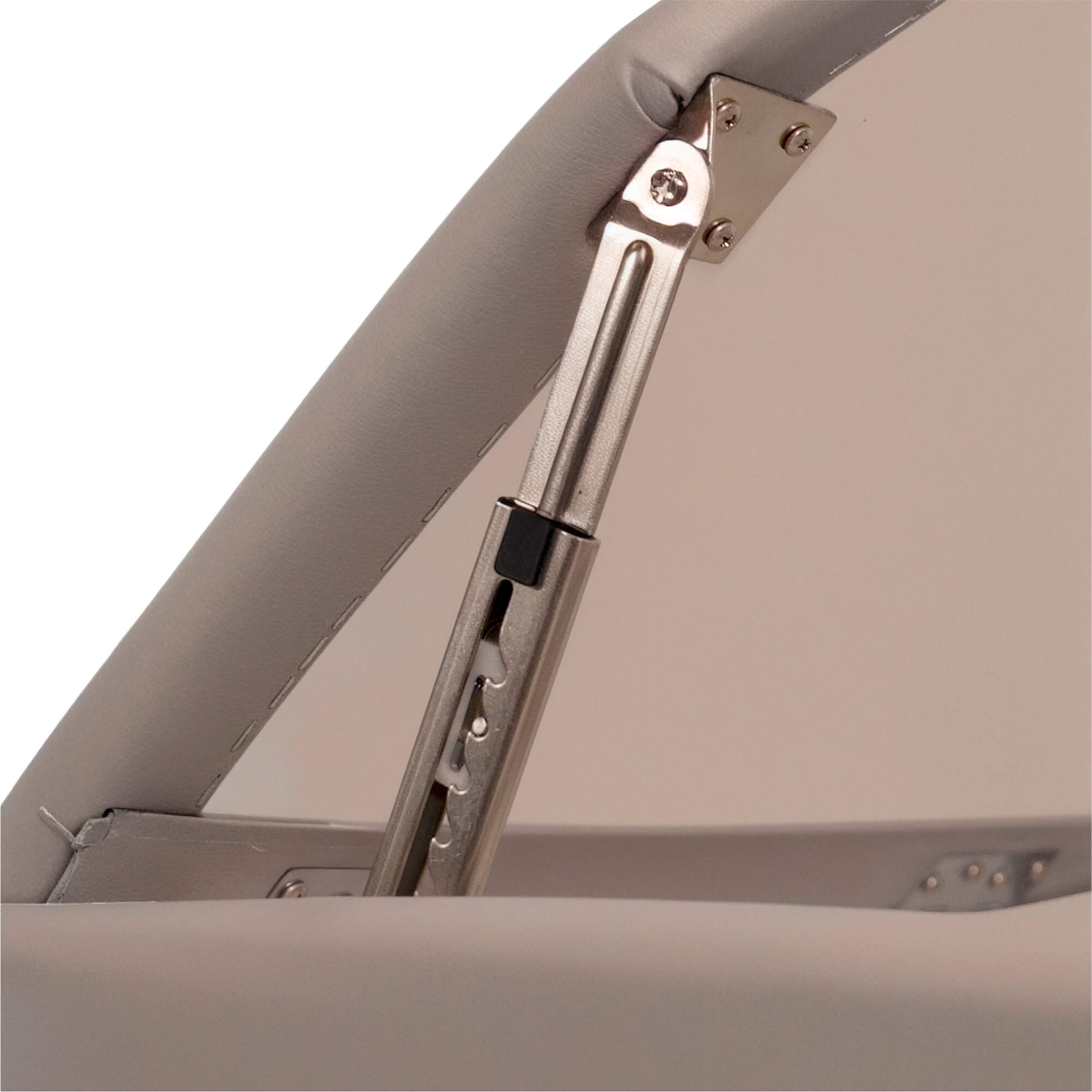 Подголовник обладает возможностью регулировки по высоте и наклону, обеспечивая идеальную поддержку головы и шеи. Ножная часть стола поднимается на 50 градусов (7 позиций), что позволяет клиентам занять самое удобное положение для проведения процедуры. Складной стол оборудован удобными подлокотниками 34х10х3,5 см, подвесной полкой для гаджетов 42 х 24 см и лямками с застежками-липучками.
