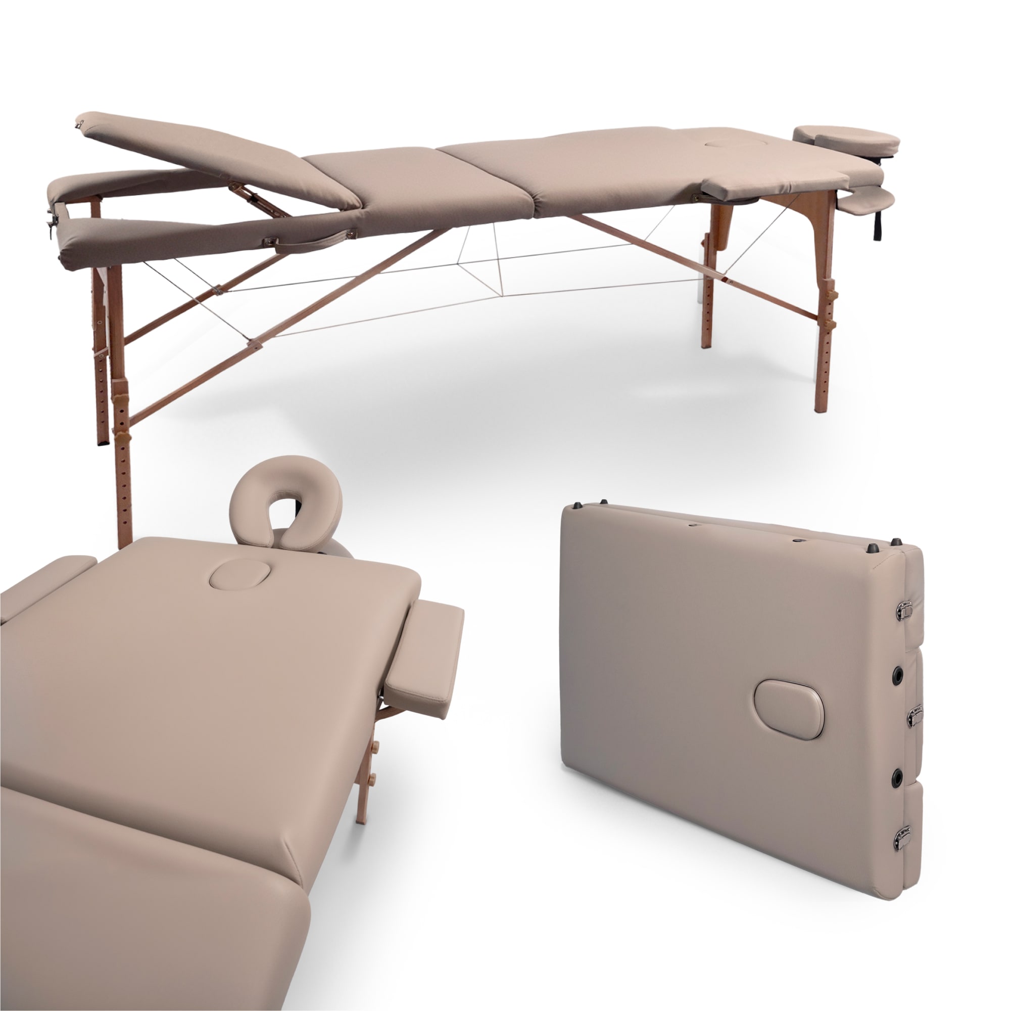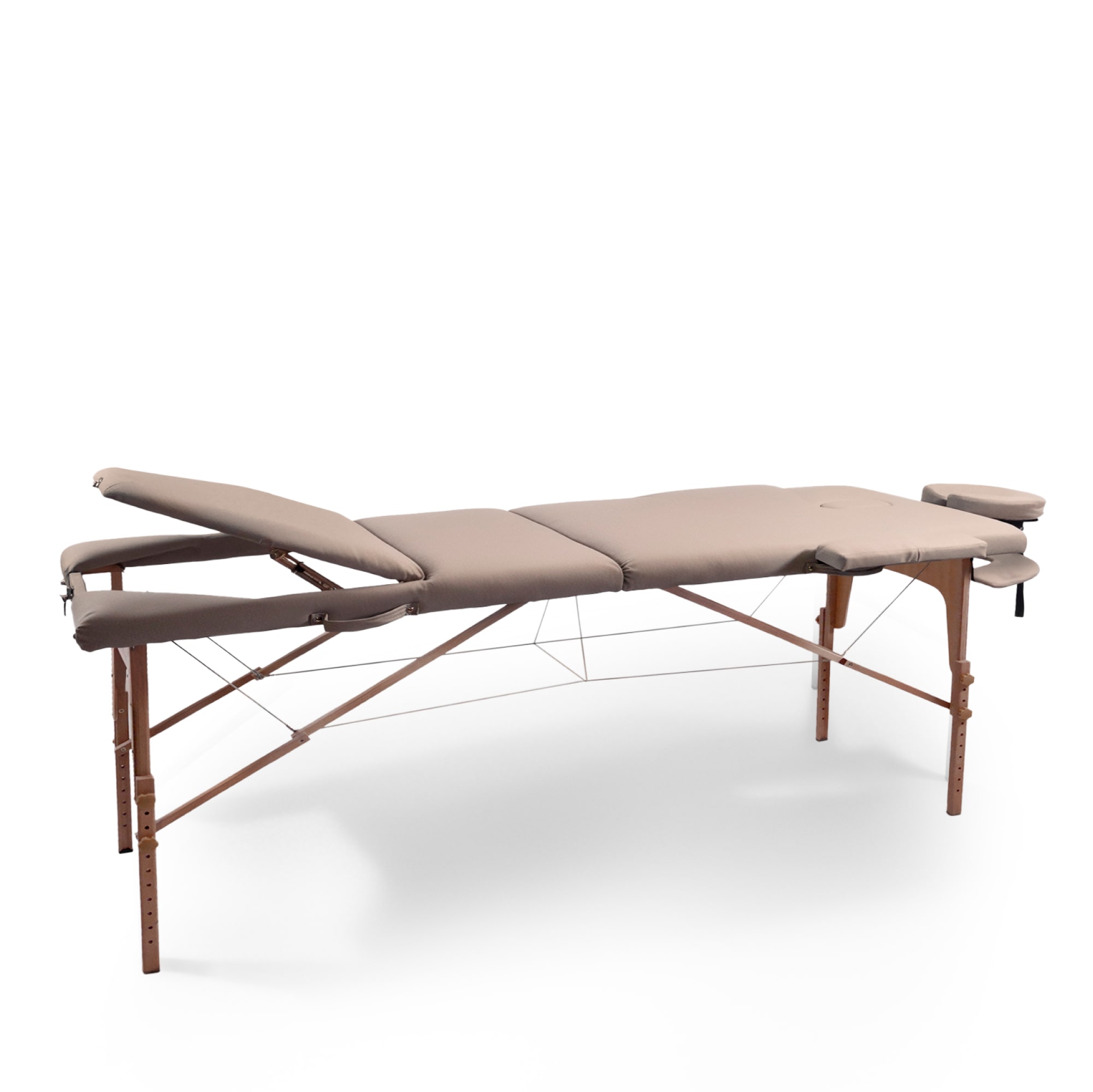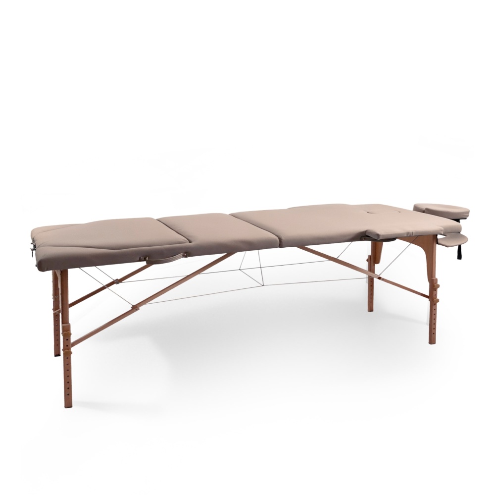 Деревянная кушетка для массажа выделяется невероятно прочной конструкцией, способной выдержать общую нагрузку до 250 кг (не перегружайте стол сверх рекомендованного предела веса). Благодаря своим компактным размерам он идеально впишется даже в самые небольшие помещения. Возможность ручной регулировки высоты ножек от 61 до 81 см с шагом 3 см позволяет адаптировать стол под рост массажиста, обеспечивая наилучшую результативность сеансов массажа. Ложе толщиной 7 см обеспечит дополнительную поддержку и комфорт. Для еще большего удобства массажного стола в комплекте предусмотрены регулируемый по наклону и высоте подголовник и подставка для гаджетов, расположенная у изголовья, а также боковые подлокотники.