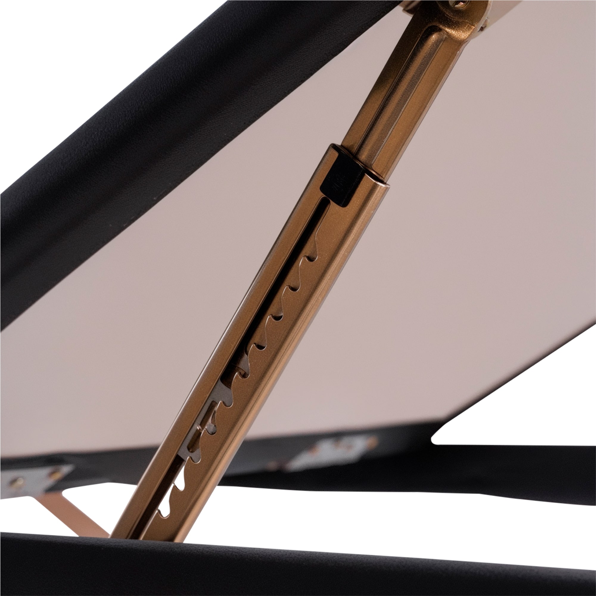 Подголовник обладает возможностью регулировки по высоте и наклону, обеспечивая идеальную поддержку головы и шеи. Ножная часть стола поднимается на 50 градусов (7 позиций), что позволяет клиентам занять самое удобное положение для проведения процедуры. Складной стол оборудован удобными подлокотниками 34х10 см, подвесной полкой для гаджетов 37,5х20 см и лямками с застежками-липучками.