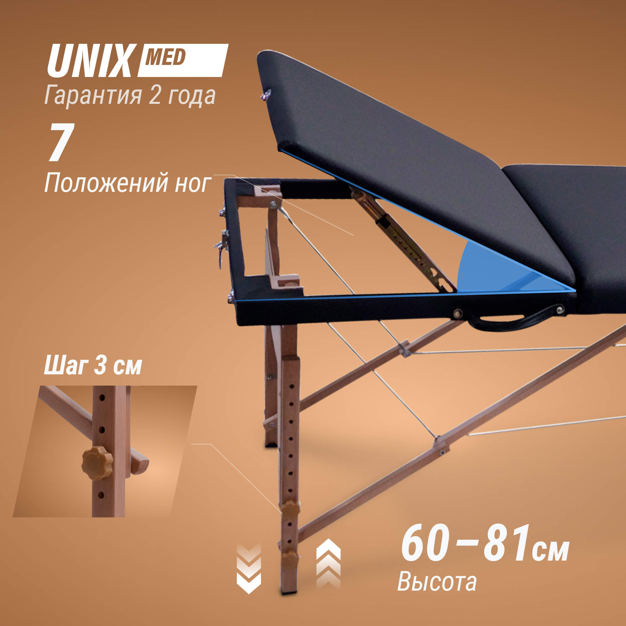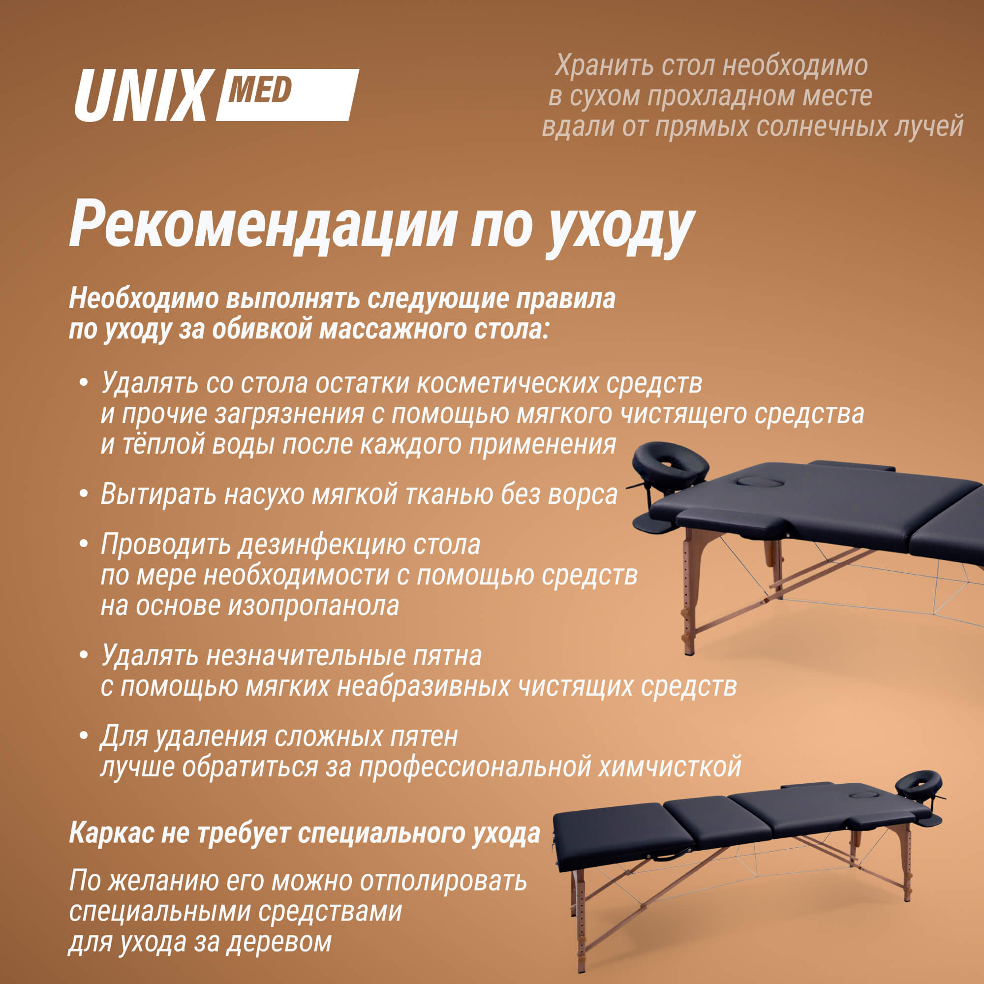 Уход за столом прост и удобен. Обивку можно ежедневно чистить мягким моющим средством и теплой водой, после чего протирать сухой тряпочкой без ворса. Каркас стола не нуждается в особом уходе. Массажный стол UNIX — это идеальный выбор для тех, кто ценит высокое качество, комфорт и многофункциональность. Этот стол сделает вашу работу легче и приятнее, вне зависимости от того, профессионал вы или любитель.