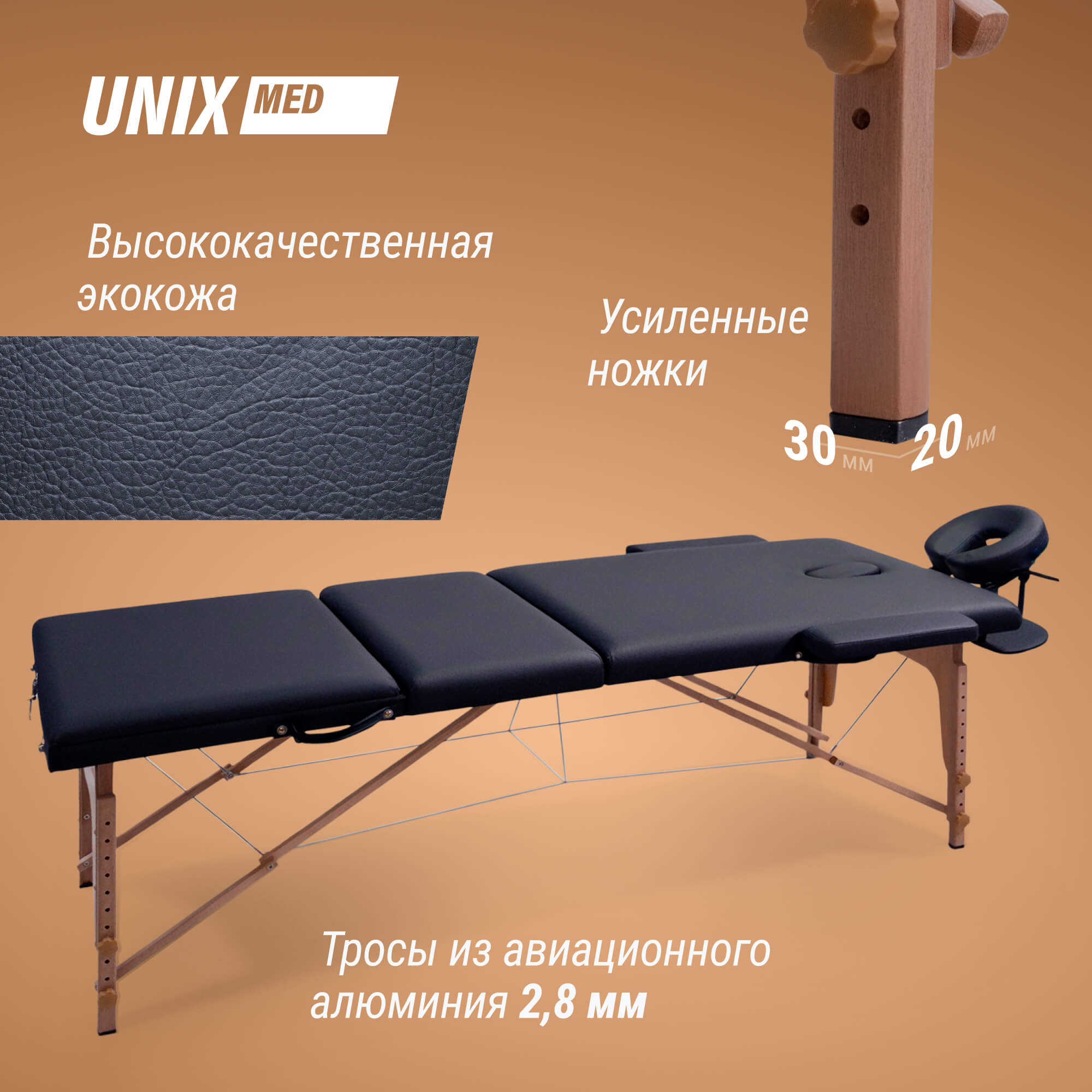 Основу каркаса и ножек составляют натуральные материалы — древесина твердых пород, покрытая безопасным лаком, что делает кушетку не только надежным, но и экологически безопасным продуктом. Усиленные ножки придают регулируемой кушетке дополнительную устойчивость, а тросы из авиационного алюминия обеспечивают надежность и долговечность. Обивка стола выполнена из высококачественной эко-кожи, устойчивой к воздействию влаги, масел и кремов, что облегчает уход за ним и продлевает срок службы.