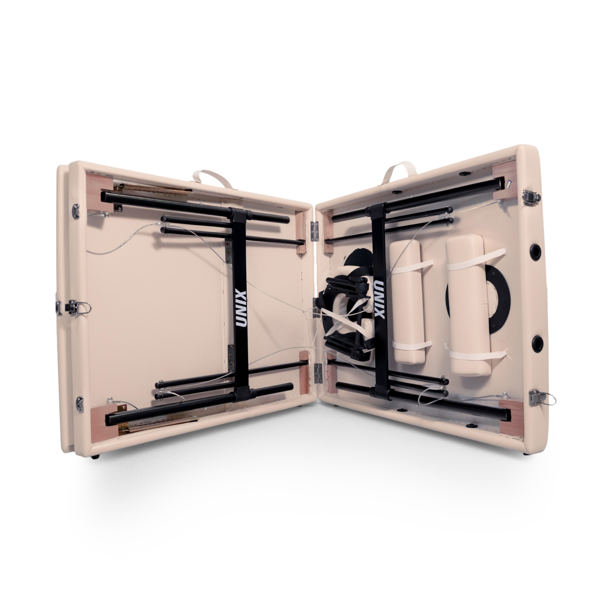 Конструкция кушетки специально разработана таким образом, чтобы ее было удобно складывать и транспортировать. В сложенном состоянии стол превращается в компактный чемоданчик размерами 92 х 70 х 14,5 см, который легко переносить благодаря входящей в комплект сумке. Эта особенность делает стол особенно удобным для проведения выездных сеансов вне массажного кабинета. Стол удобно переносить, перевозить, в комплекте имеется сумка для хранения в сложенном виде. Сумка защитит стол и аксессуары от царапин и повреждений во время транспортировки.