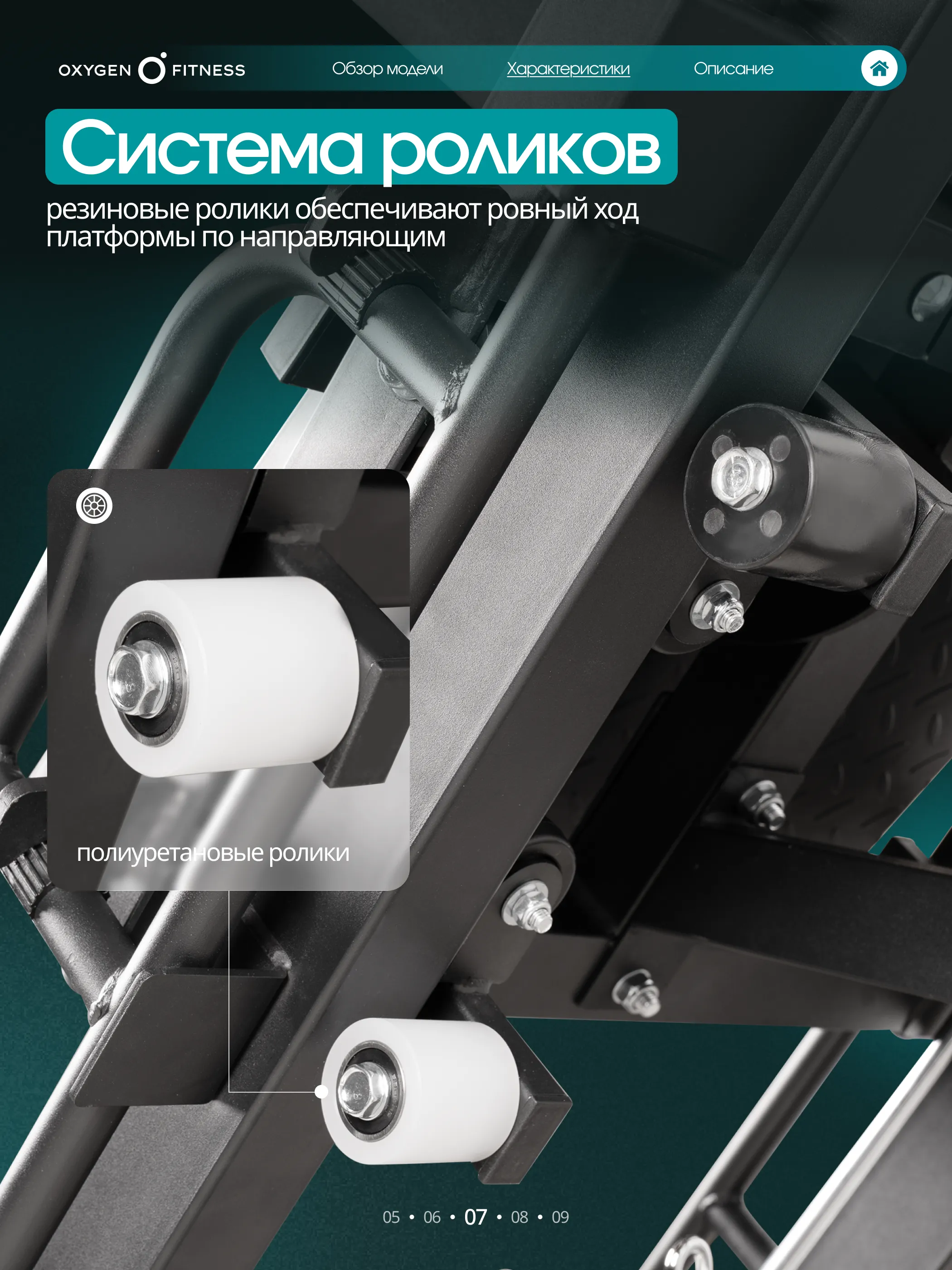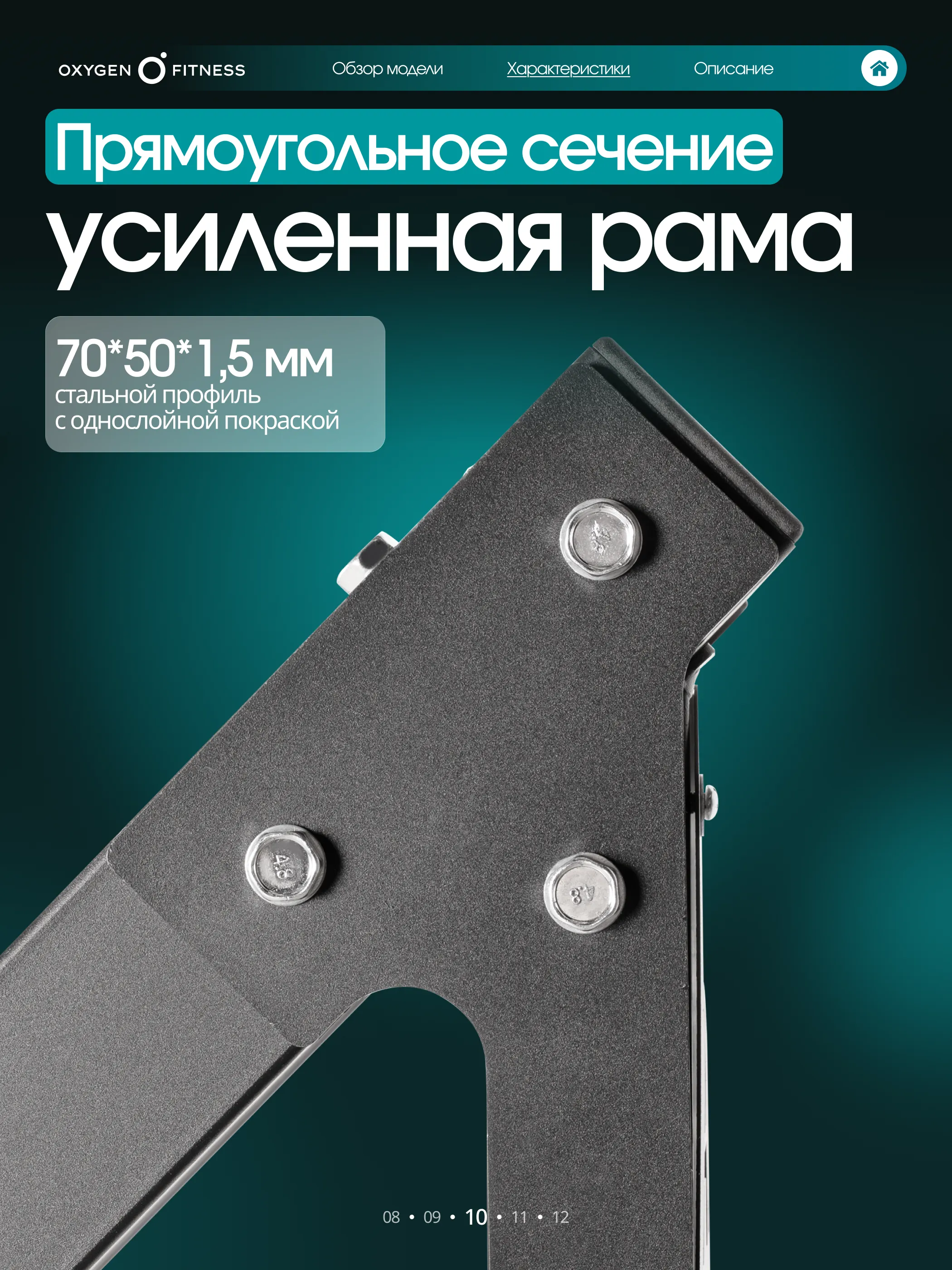 Основа тренажёра — усиленная стальная рама квадратного профиля 70×50 мм с толщиной стенки 1,5 мм, обеспечивающая жёсткость и долговечность.