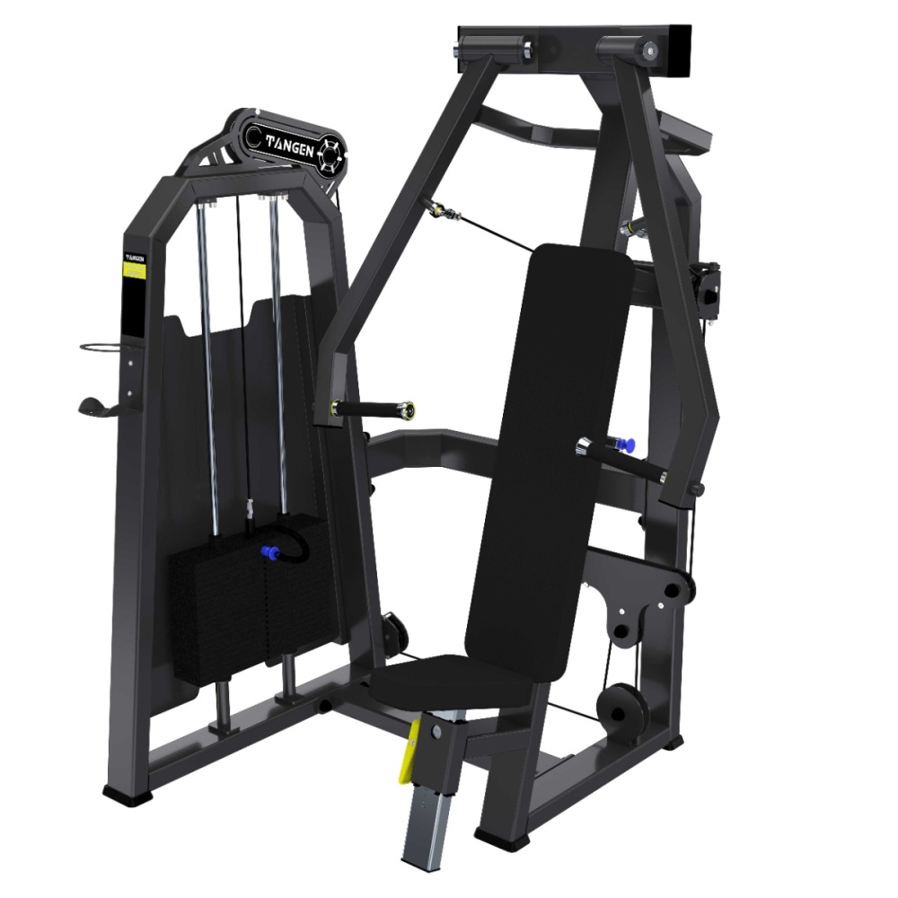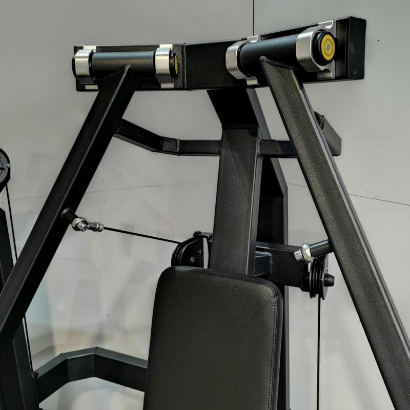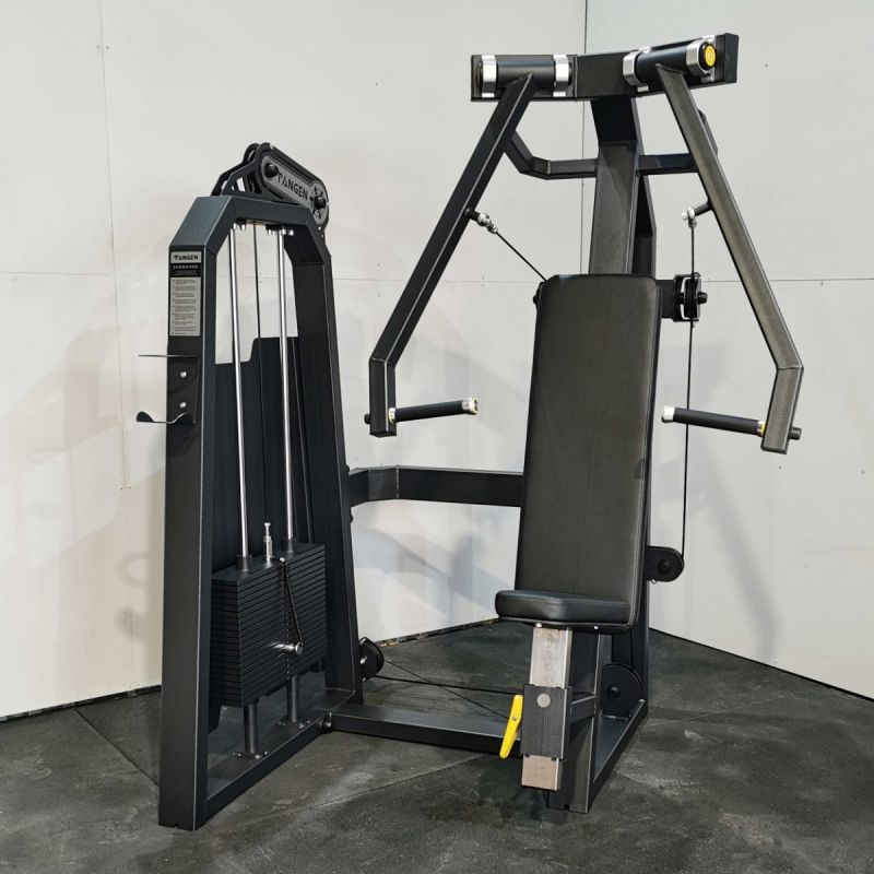 Тренажёр Жим от груди вертикальный предназначен для тренировки больших грудных мышц, трицепсов и передних дельт в положении сидя. Конструкция с вертикальной посадкой и рычагами, движущимися вперёд от пользователя, имитирует естественное движение жима лёжа, но в более стабильной позиции. Независимые рычаги позволяют акцентировать нагрузку на каждую сторону тела, повышая симметрию и контроль амплитуды. Эргономичное сиденье и спинка фиксируют корпус и поддерживают правильное положение плечевого пояса, обеспечивая комфорт даже при работе с максимальными весами.