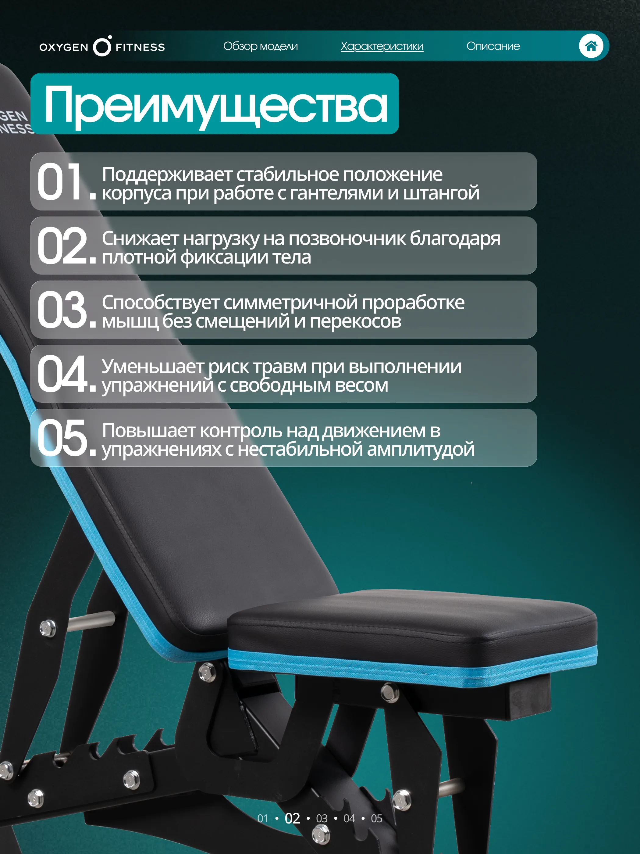 Скамья поддерживает широкий спектр упражнений благодаря продуманной кинематике регулировок:
