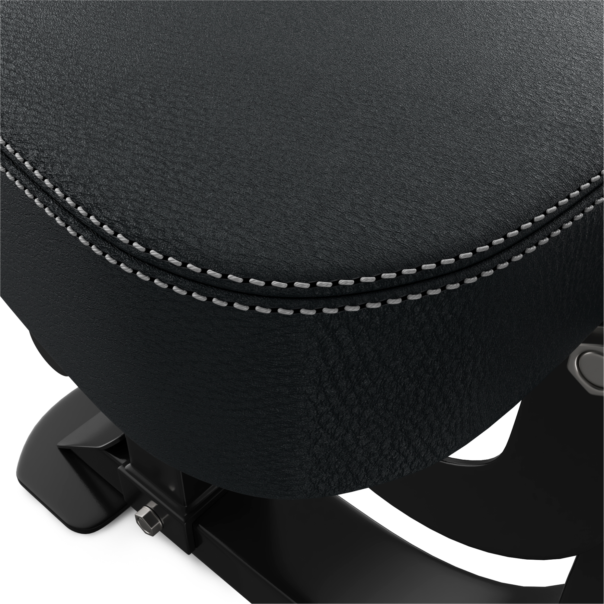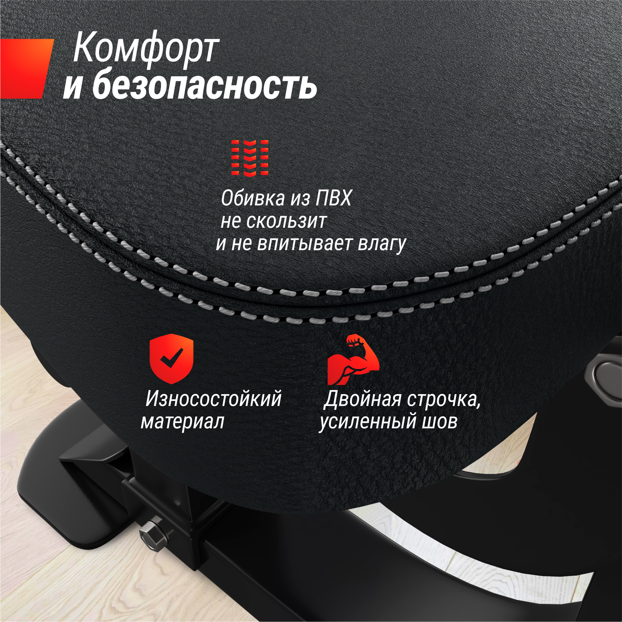Обивка из ПВХ высокого качества не скользит и не впитывает влагу, двойная строчка усиливает шов, что делает элементы тренажера износостойкими.