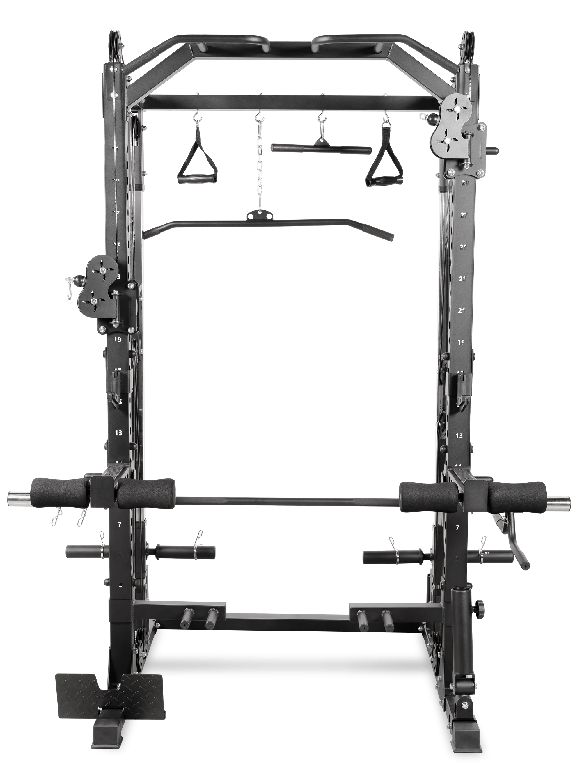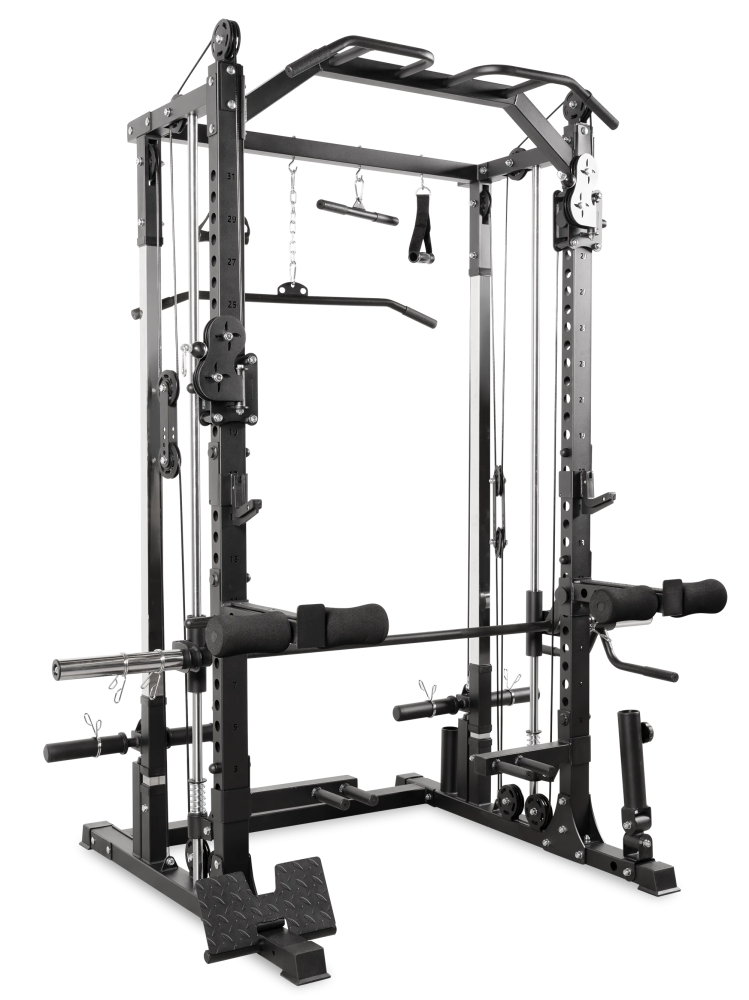Конструкция работает со свободными весами и обеспечивает безопасное выполнение десятков упражнений: от жима и приседаний до тяг, кроссоверных движений и тренировок корпуса.