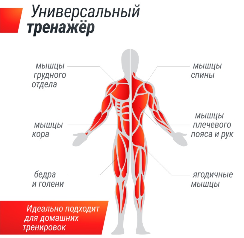 | Упражнения | приседания, жим лежа под различными углами (используя вместе с универсальной скамьей), подтягивания на турнике, сгибание ног, разгибание ног, разгибание рук, сгибание рук, тяга сверху, жим от груди |