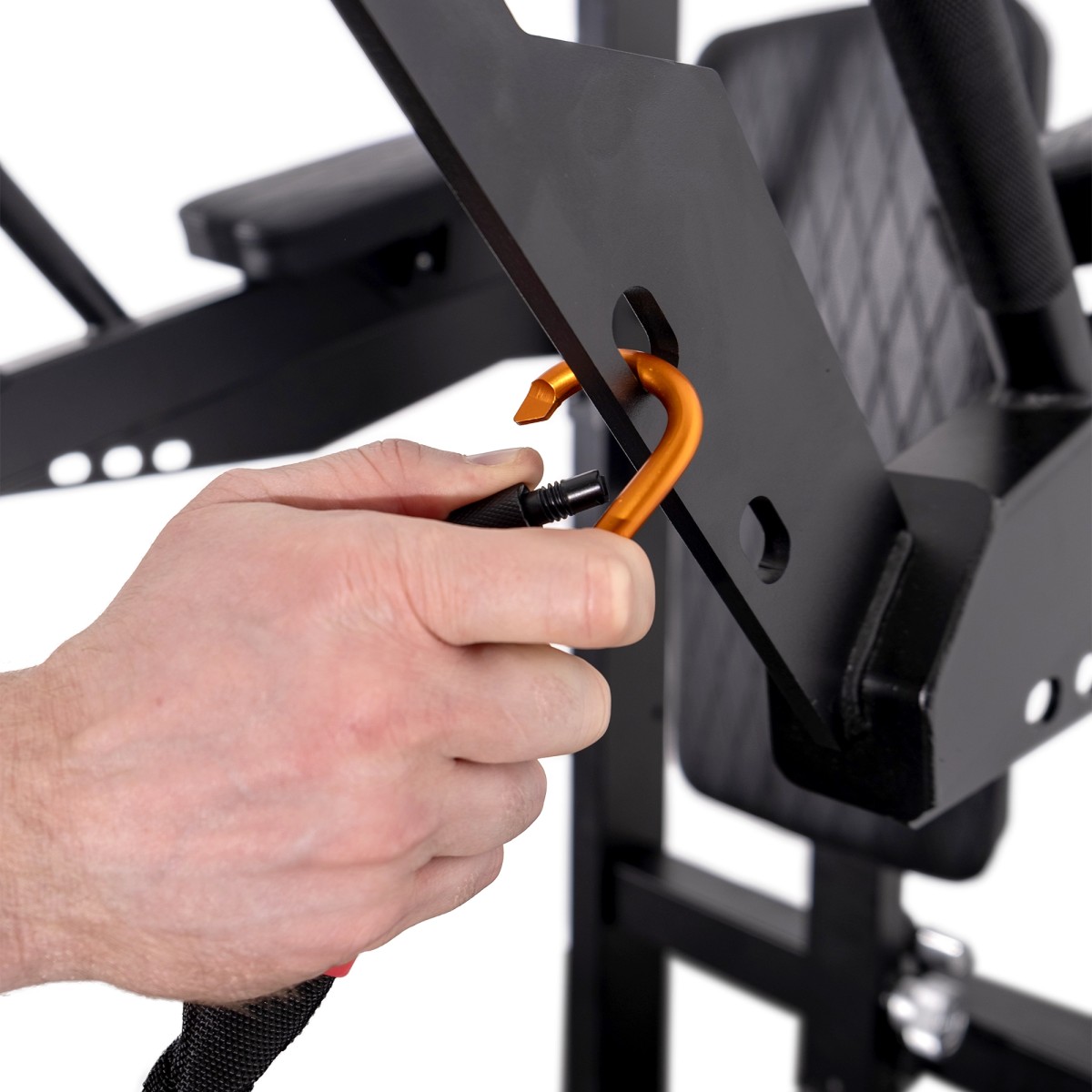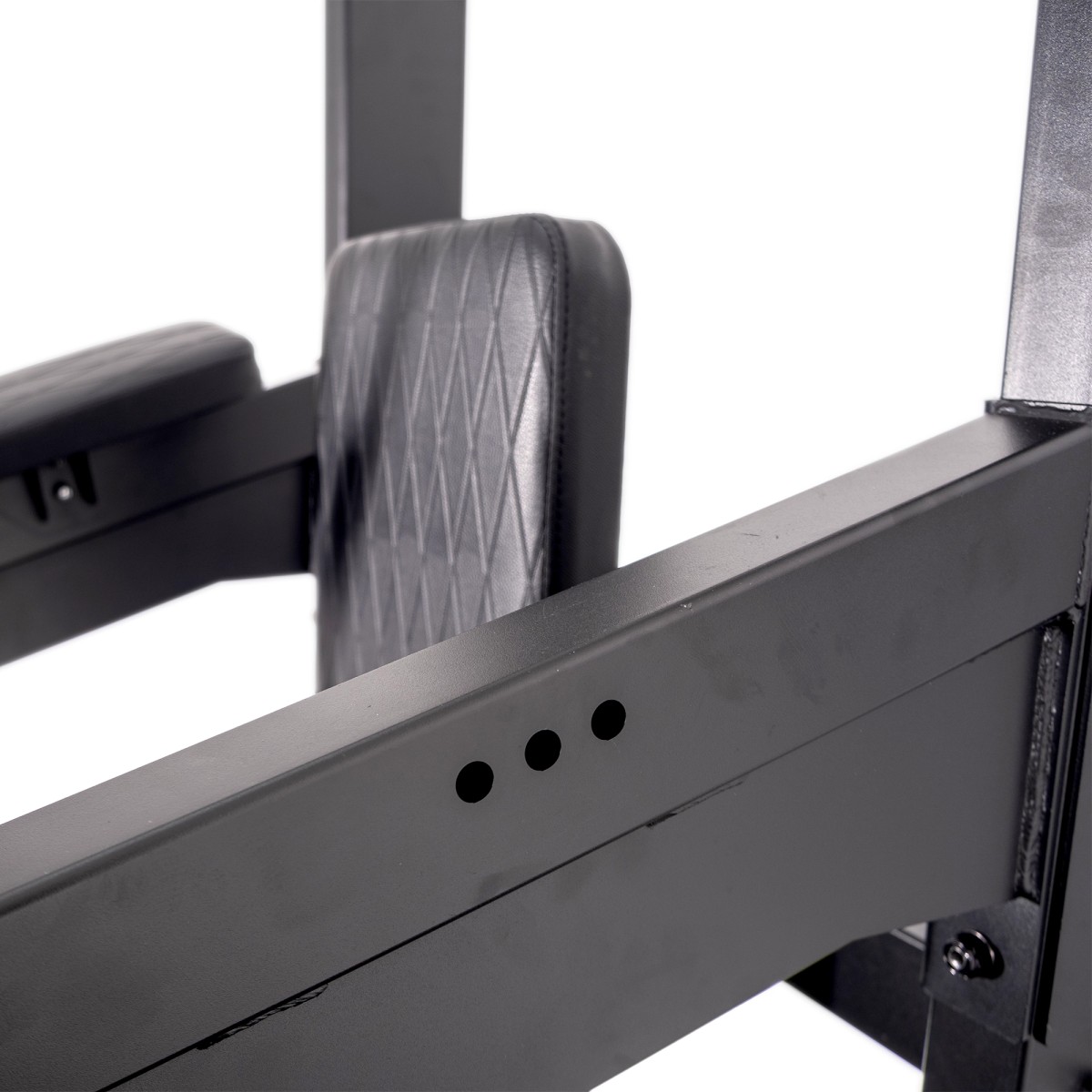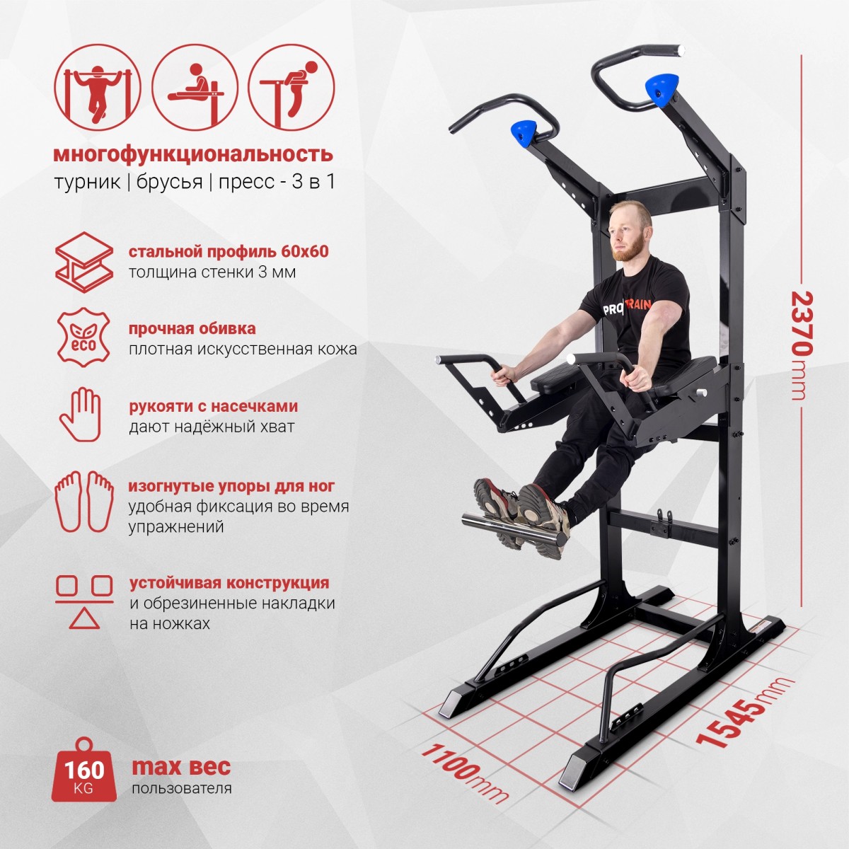 Турник позволяет выполнять подтягивания разным хватом, брусья - отжимания, таким образом, с помощью Protrain GT-PTR вы можете полностью нагрузить грудные мышцы, трицепсы, заднюю дельту. Пподлокотники регулируются, что позволяет максимально удобно расположиться на тренажере для выполнения подъема ног при проработке нижней группы мышц пресса.
