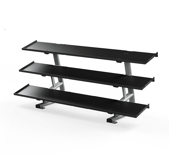 Специальная конструкция трехуровневой стойки Magnum с плоским лотком для хранения шестигранных гантелей экономит место и обеспечивает надежное хранение.