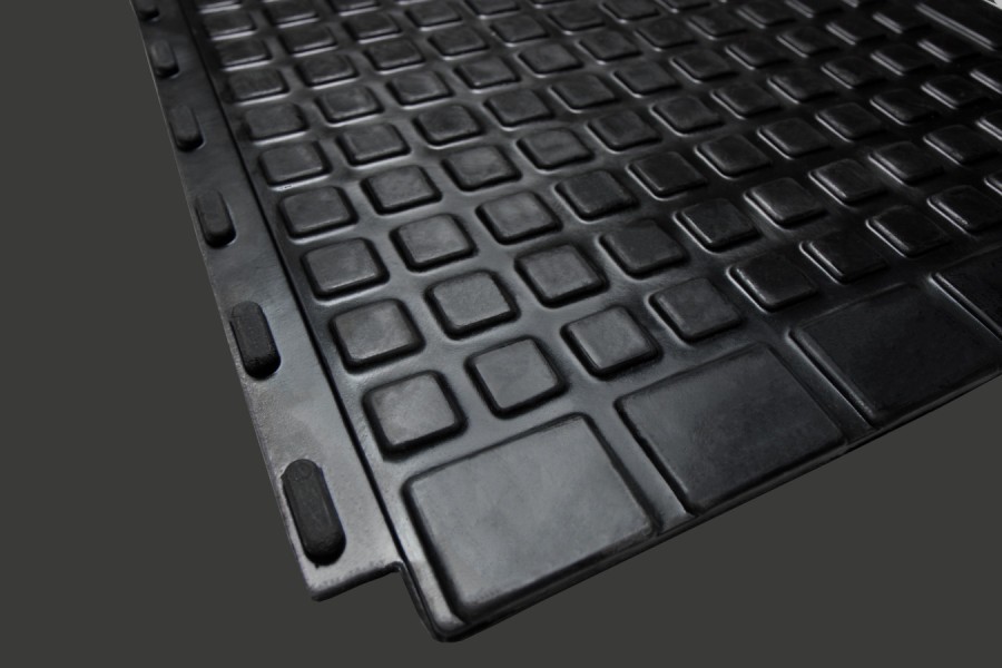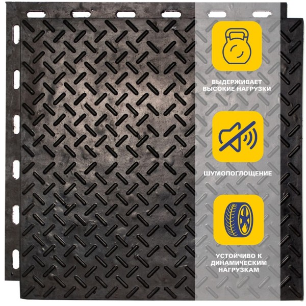 Покрытие предназначено для большинства типов промышленных, коммерческих и жилых помещений с высокой степенью нагрузки. Благодаря специальному составу плиты обладают высоким сопротивлением к ультрафиолетовому излучению, озоновому и тепловому старению. Плиты напольного резинового покрытия изготовлены из экологически безопасных материалов. Благодаря удобной защёлке монтаж может производиться самостоятельно, образуя сплошной настил. Не требуется дополнительных материалов (инструментов, клея и т. д.) Покрытие укладывается на цементную, асфальтовую, песчаную основу, а также непосредственно на грунт. Резиновая плита, благодаря особенностям производства, долговечна, не трескается и не размокает. Область применения: цеха; паркинги; дорожки вокруг открытых и закрытых катков; автомастерские, автозаправки, авто-мойки; складские помещения — покрытие устойчиво к колесной технике; стадионы, спортивные площадки, тренажерные залы; места повышенной проходимости; садовые дорожки. Преимущества: температурный интервал работоспособности от -40°С до 90°С; водостойкость; для большинства целей не требует применение клеев; высокая стойкость к истиранию; обладает хорошими амортизационными свойствами; низкий уровень шума; экологичность; возможность быстрого монтажа и демонтажа.