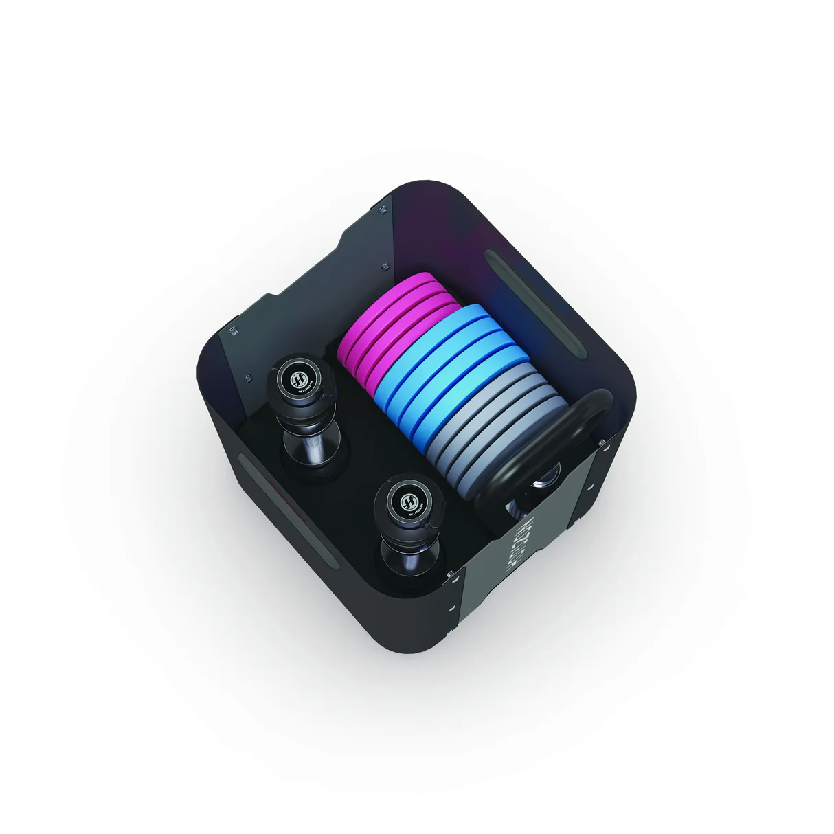 Состоит из ящика для зашагиваний, наборной гантели, наборной гири, баланс-крышки и трех эспандеров.