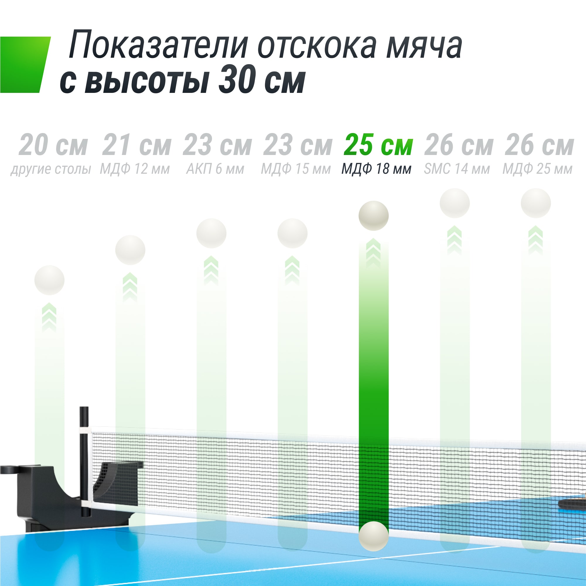 Размер универсального теннисного стола UNIX Line Compact Indoor соответствуют стандартам ITTF 274 х 152.5 х 76 см. Стол для пинг-понга изготовлен из высококачественного МДФ и имеет толщину столешницы 18 мм, что обеспечивает отличный отскок мяча до 26 см, делая игру более комфортной и предсказуемой. Материал отличается высокой прочностью и устойчивостью к механическим повреждениям, что обеспечивает долгий срок службы даже при интенсивном использовании. Покрытие с защитой от УФ также увеличивает срок службы теннисного стола, защищая материал от разрушительного воздействия солнечных лучей, влаги и других внешних факторов. Кроме того, поверхность стола для пинг-понга легко очищается от загрязнений, позволяя поддерживать его в отличном состоянии.