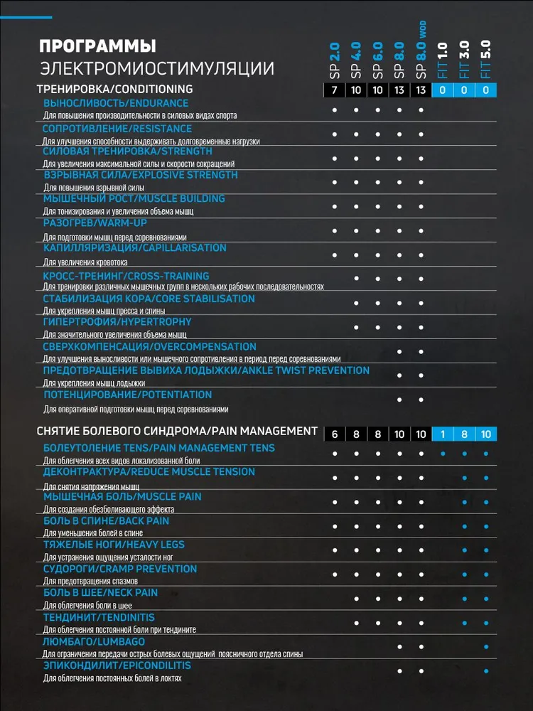 Этот электростимулятор улучшает ваши силы и восстанавливает мышечные объемы, помогает Вам расслабиться и восстановиться быстрее. В дополнение ко всем преимуществам SP 2.0, SP 4.0 также предлагает реабилитационные программы, которые могут быть полезны для спортсменов с частыми травмами, которые тренируются 3 раза в неделю.