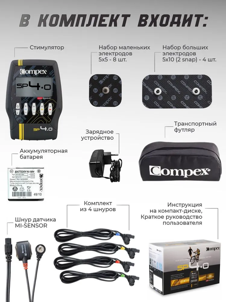 - Перечень программ Compex SP 4.0:10 аэробных программ - Категория Conditioning: Выносливость (Endurance); Сопротивление (Resistance); Сила (Strength); Взрывная сила (Explosive Strength); Перекрестная тренировка (Cross-training); Стабилизация позвоночника (Improve core stabilization); Гипертрофия (Hypertrophy); Накачка мышц (Muscle building); Разогрев (Warm-up); Капилляризация: увеличение и развитие сети капилляров в различных частях тела (Capillarisation).